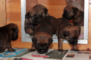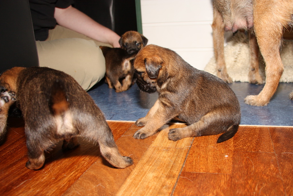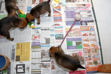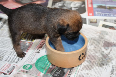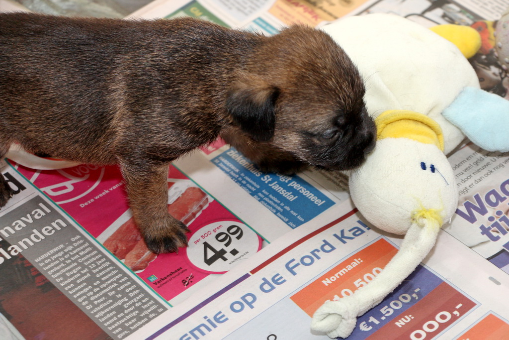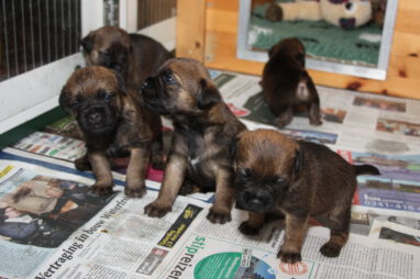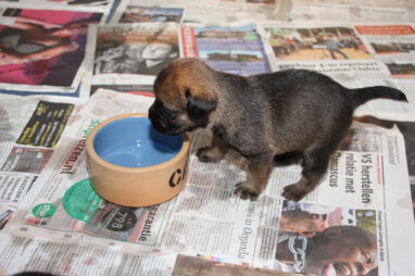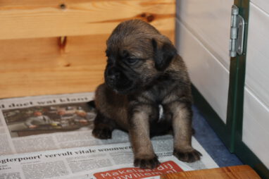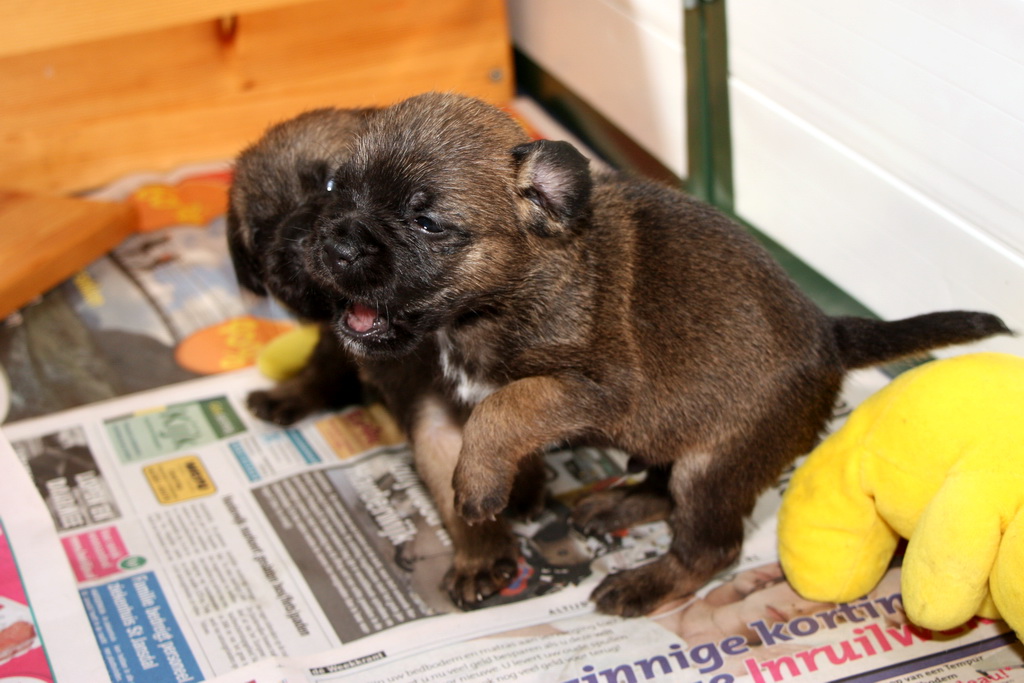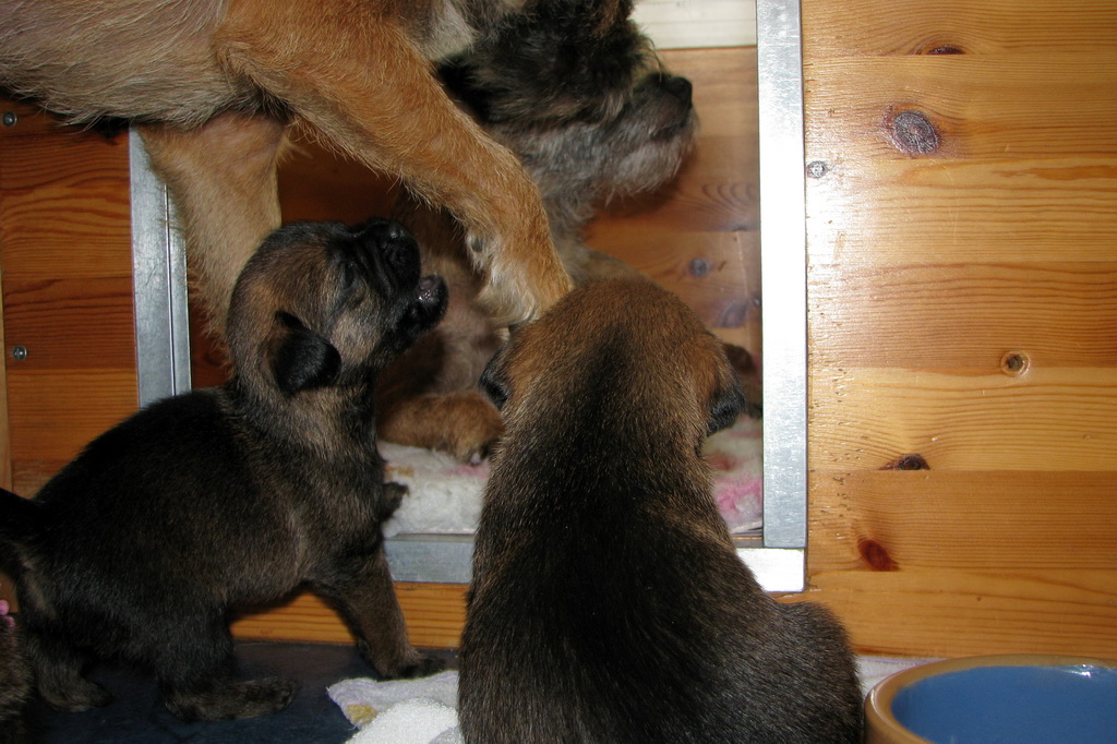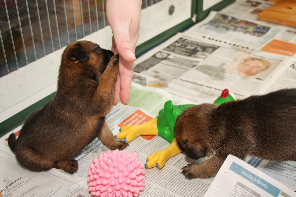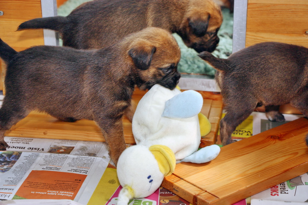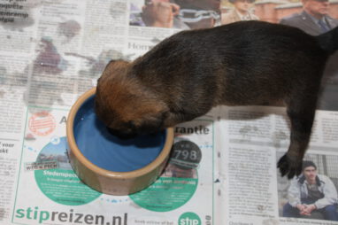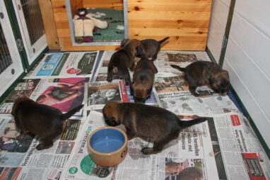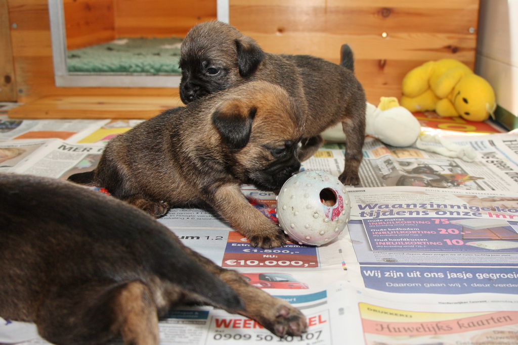 De pups mogen nu langer de kamerkennel in. Ze stappen heel voorzichtig uit de werpkist en hebben eerst alles eens goed verkend. Ze waren al in de kennel geweest, maar toen lag er nog een kleed in en zat er altijd iemand bij. Nu liggen er alleen kranten en hebben ze de kennel helemaal voor zichzelf.