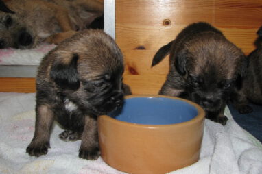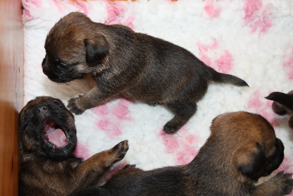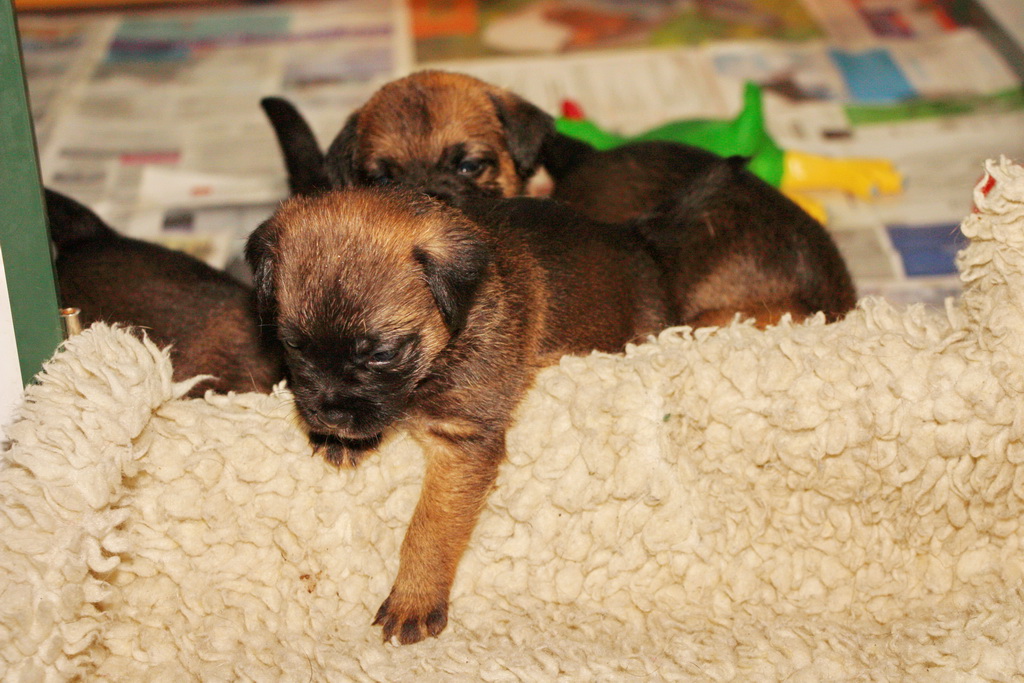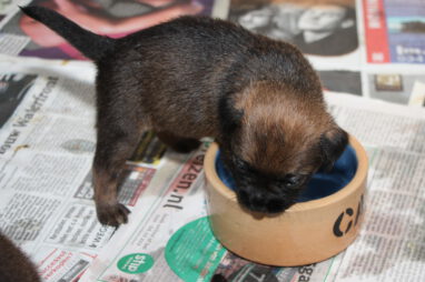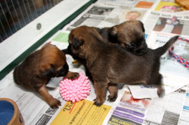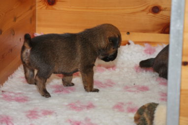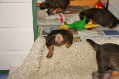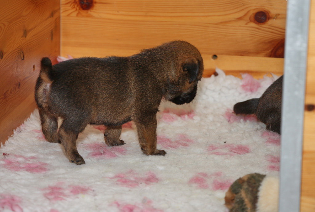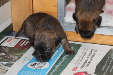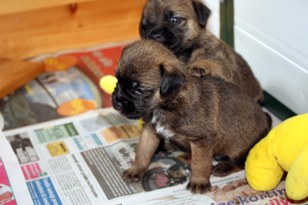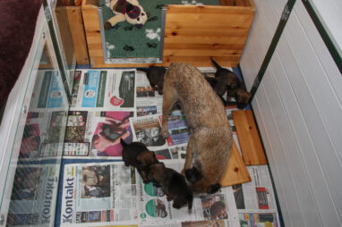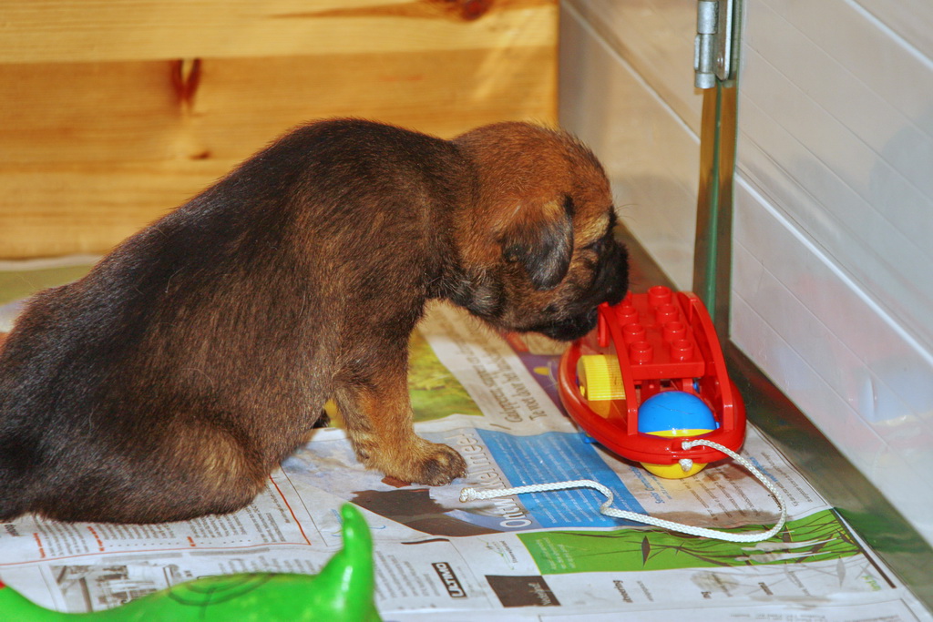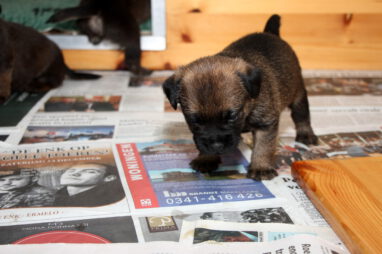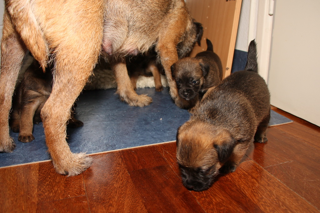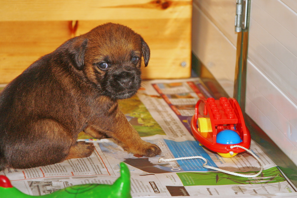 De pups mogen nu langer de kamerkennel in. Ze stappen heel voorzichtig uit de werpkist en hebben eerst alles eens goed verkend. Ze waren al in de kennel geweest, maar toen lag er nog een kleed in en zat er altijd iemand bij. Nu liggen er alleen kranten en hebben ze de kennel helemaal voor zichzelf.
