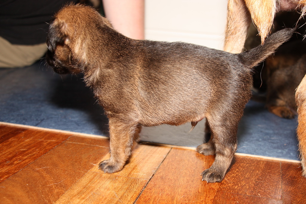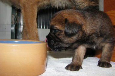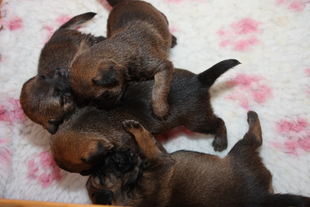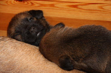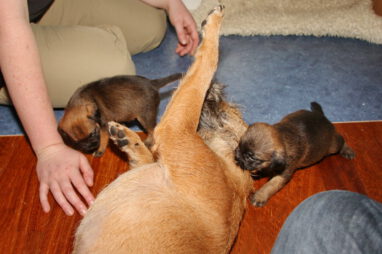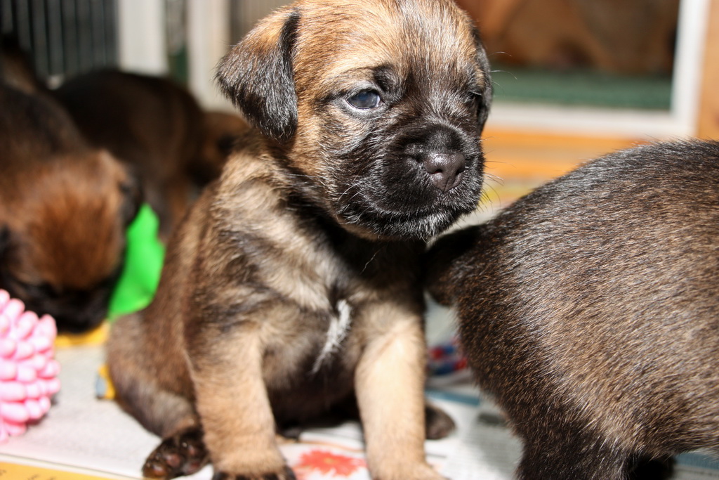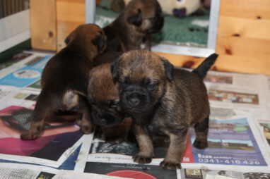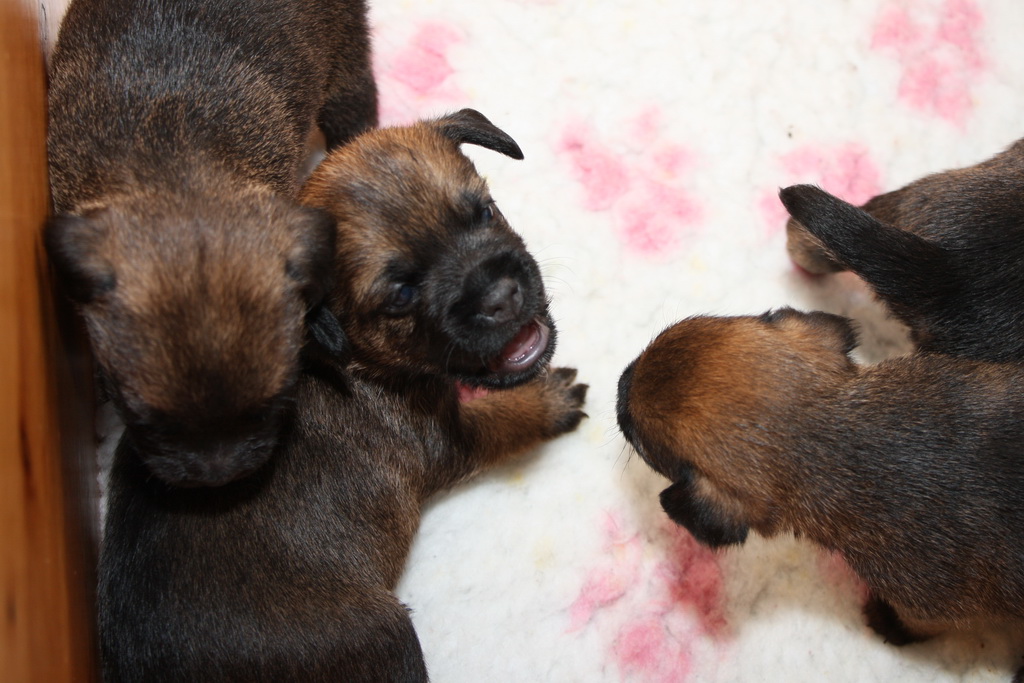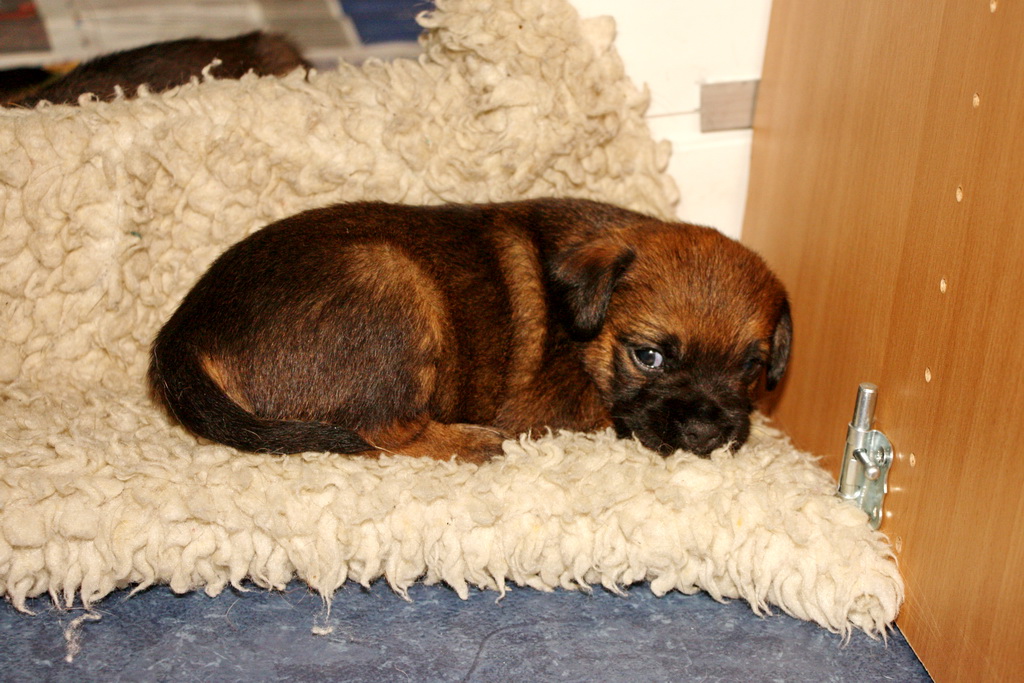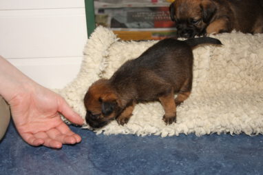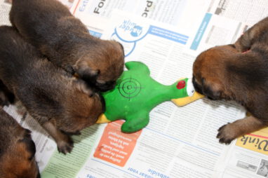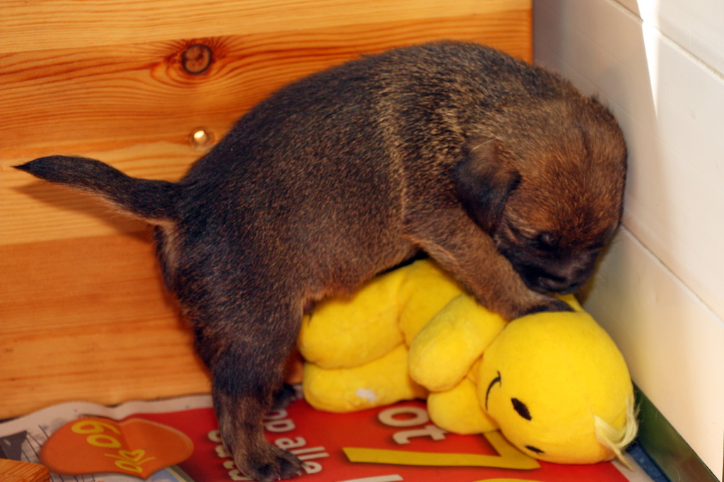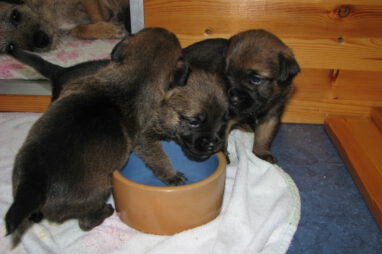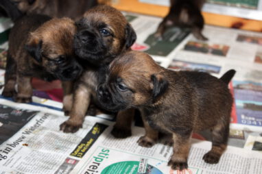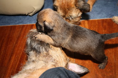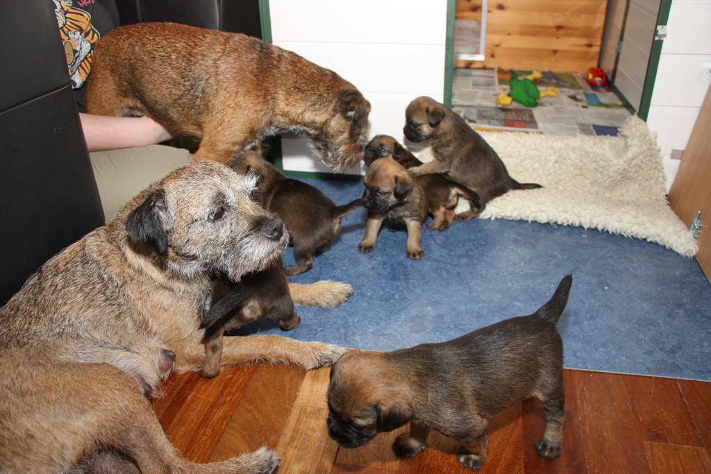 De pups mogen nu langer de kamerkennel in. Ze stappen heel voorzichtig uit de werpkist en hebben eerst alles eens goed verkend. Ze waren al in de kennel geweest, maar toen lag er nog een kleed in en zat er altijd iemand bij. Nu liggen er alleen kranten en hebben ze de kennel helemaal voor zichzelf.