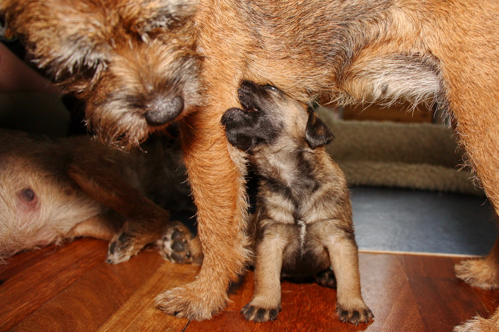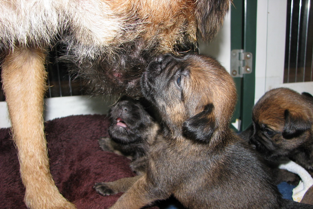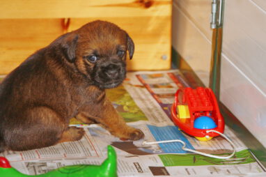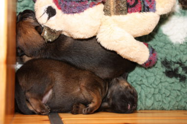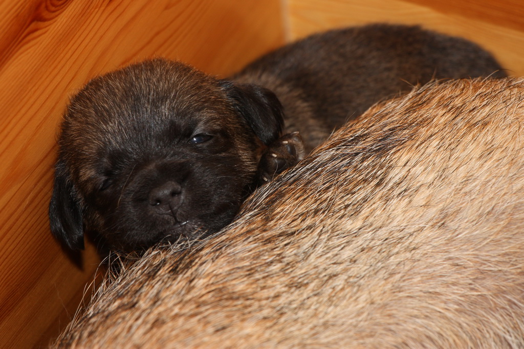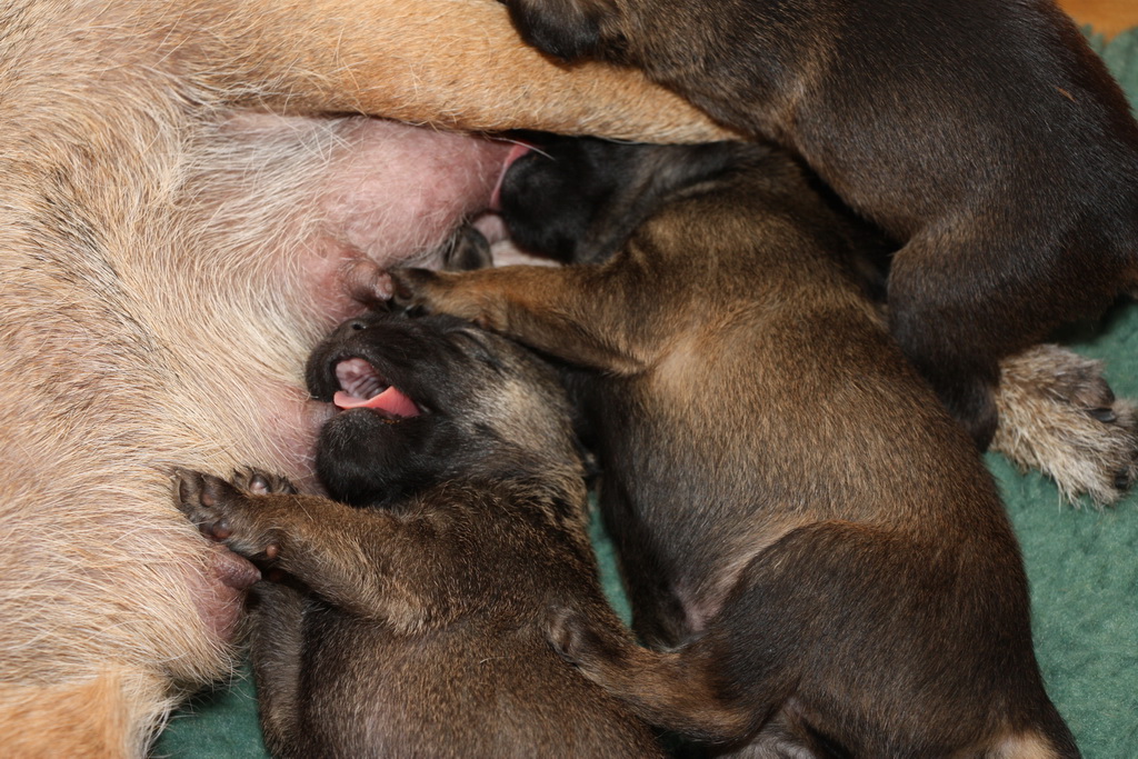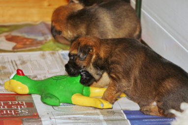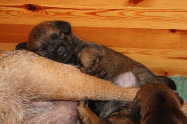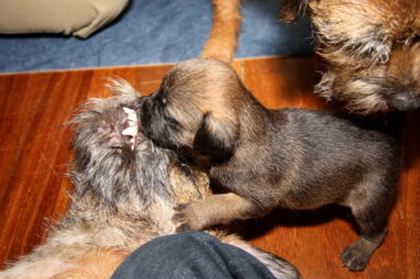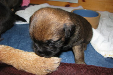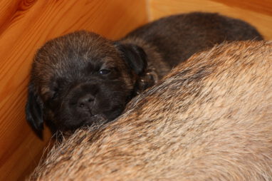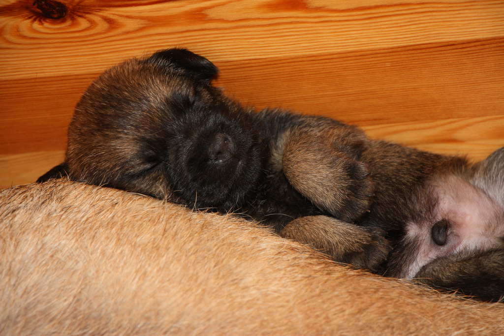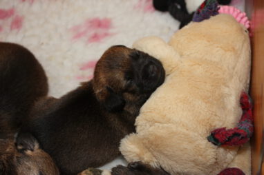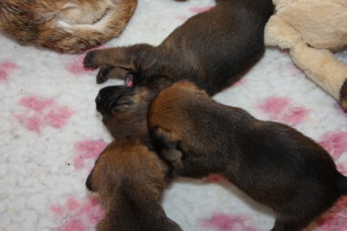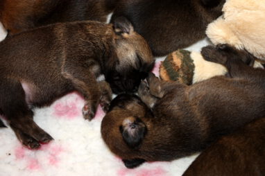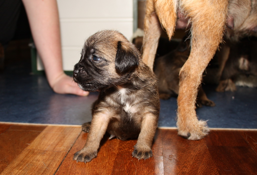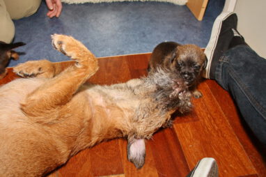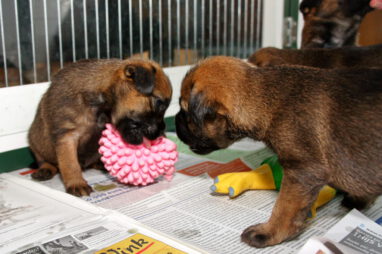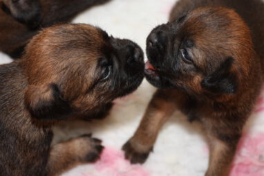 De pups mogen nu langer de kamerkennel in. Ze stappen heel voorzichtig uit de werpkist en hebben eerst alles eens goed verkend. Ze waren al in de kennel geweest, maar toen lag er nog een kleed in en zat er altijd iemand bij. Nu liggen er alleen kranten en hebben ze de kennel helemaal voor zichzelf.