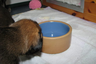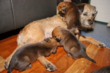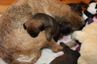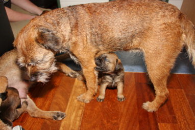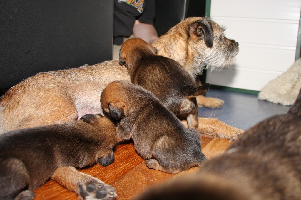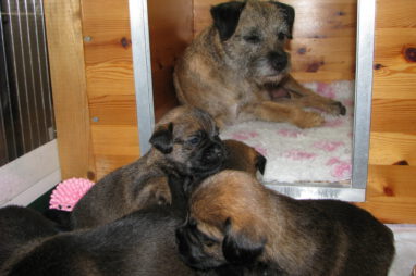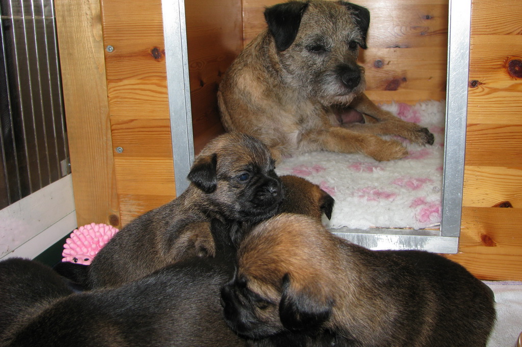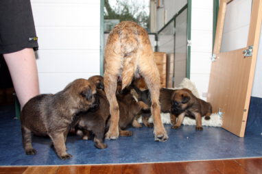Ivy keek vanuit de werpkist toe en kwam af en toe ook in de kennel kijken. Al gauw waren ze helemaal thuis en genoten van de extra ruimte