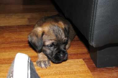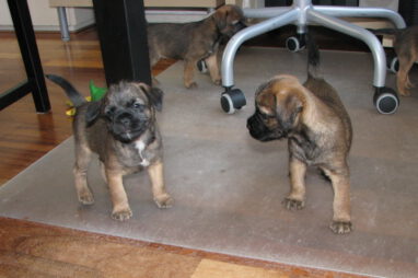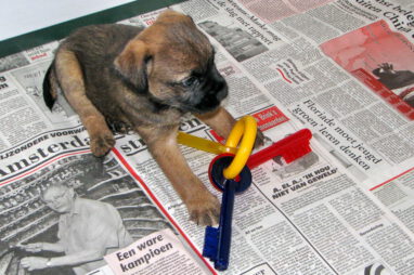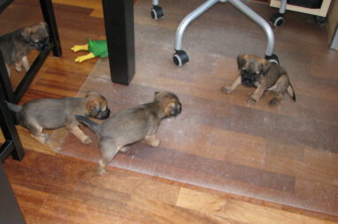 De pups spelen nu heel vaak in de kamer en soms ook in de gang. Ze vinden het schitterend en hebben de grootste lol. En wij maar tellen of we ze alle zes nog zien!. Ook Lewis vermaakt zich prima met de pups.