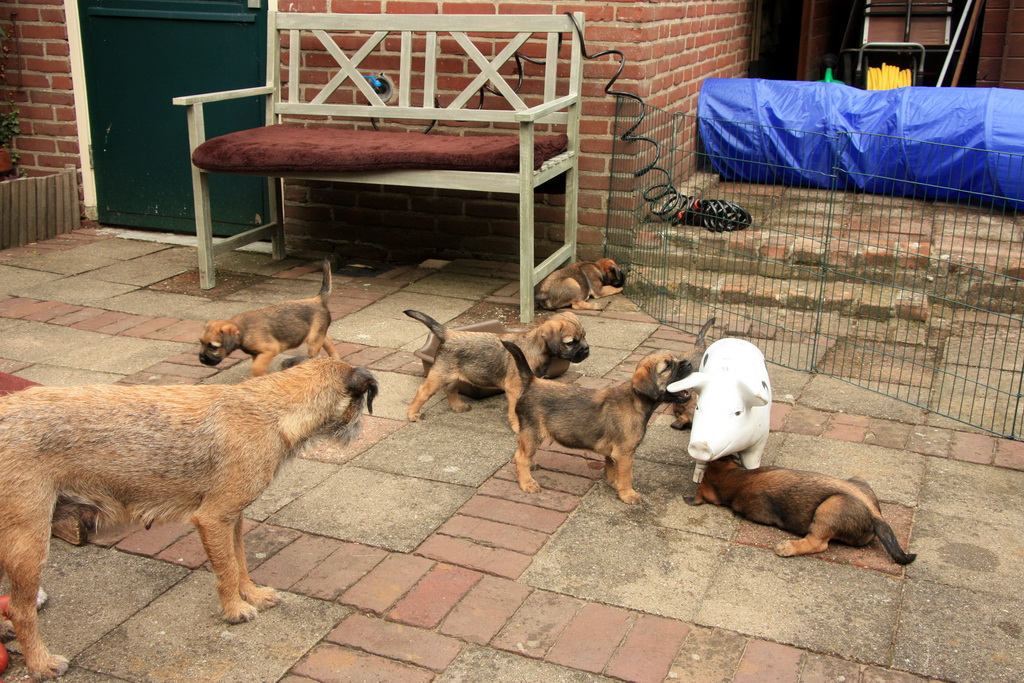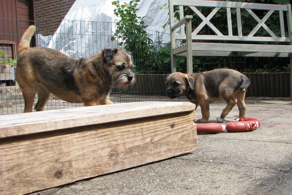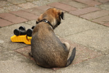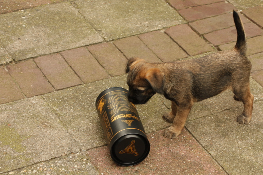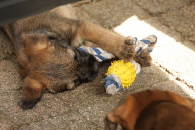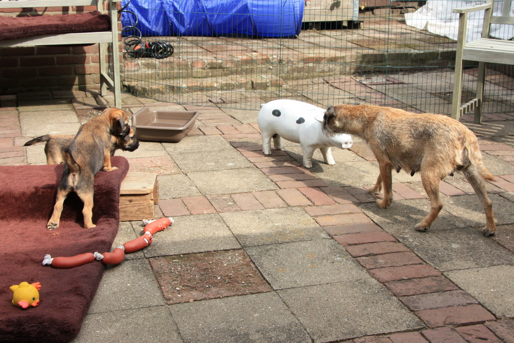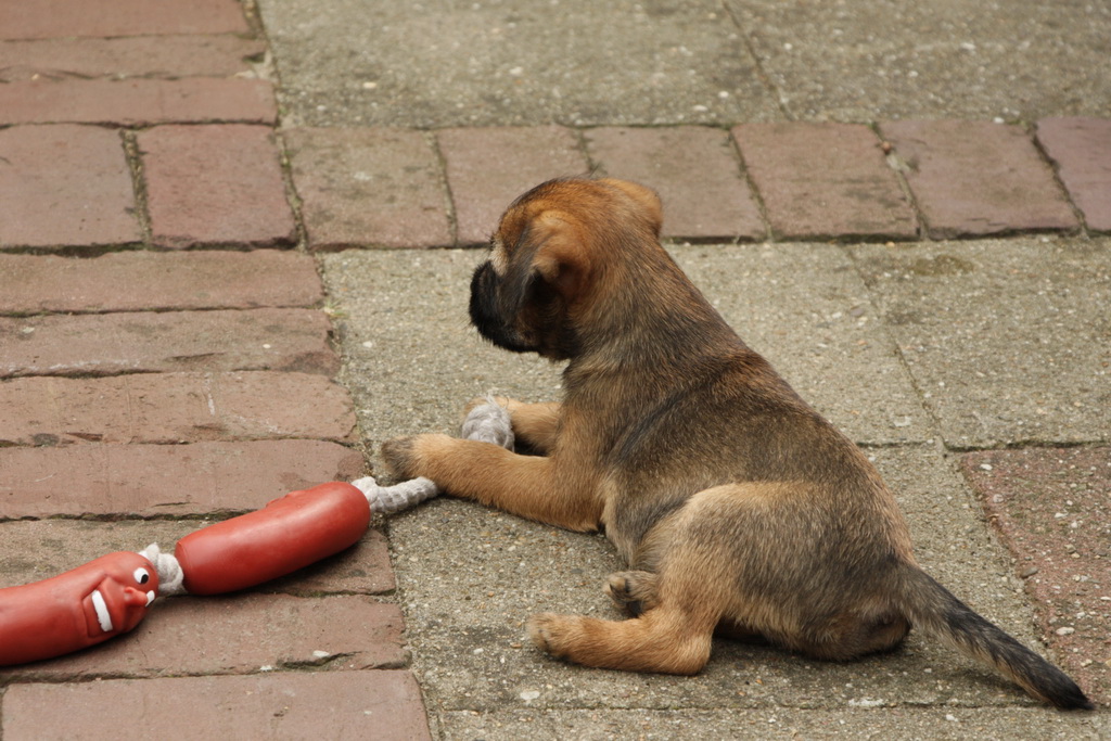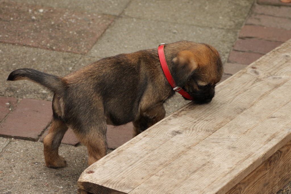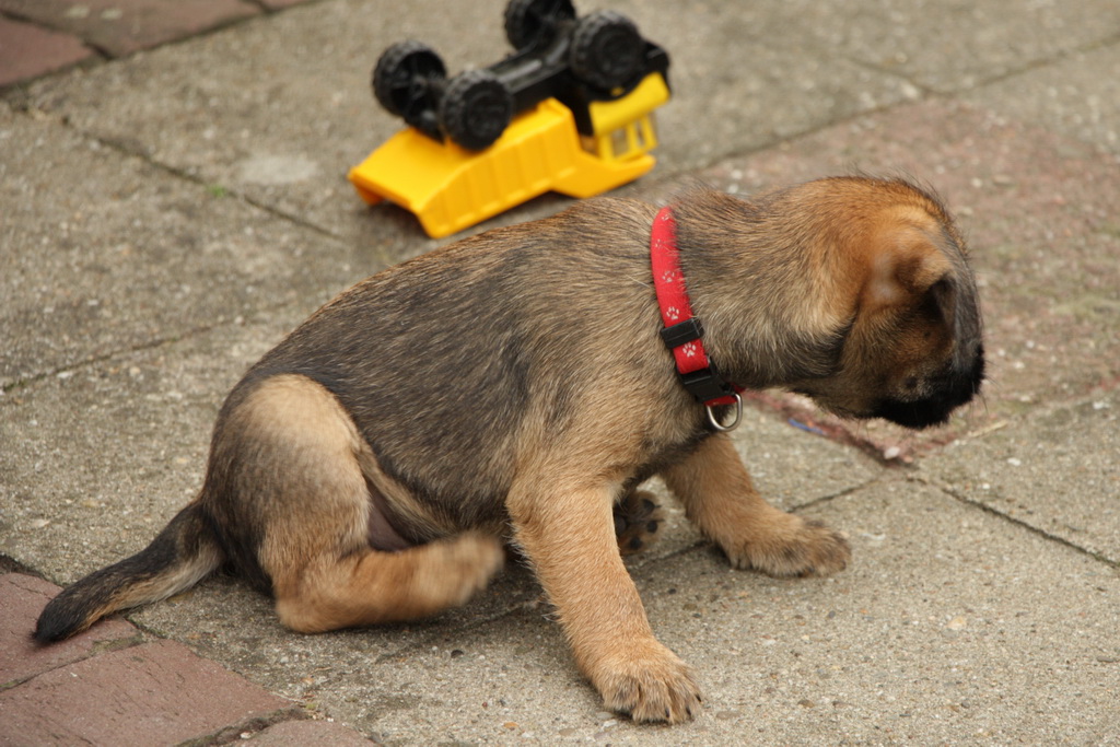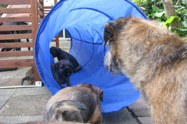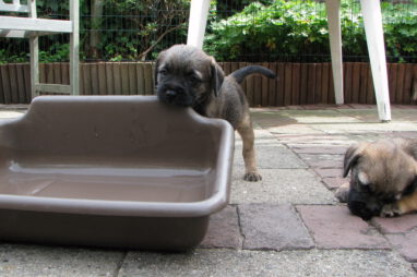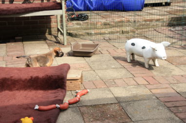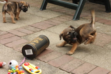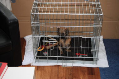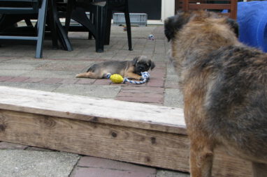 De bench en het speelgoed zijn in ieder geval goedgekeurd en het grote hondenkussen is super! Kennismaking met zijn nieuwe huisgenoten (twee katten) is uitgesteld tot Marlow definitief verhuisd. Daar zal hij nog van opkijken!