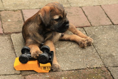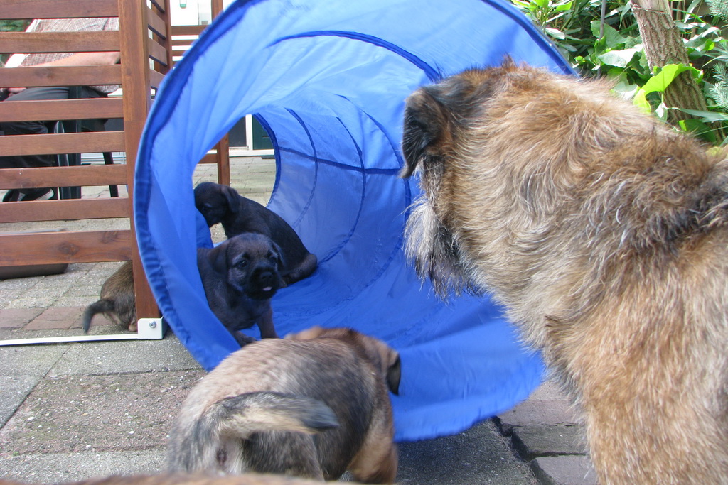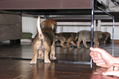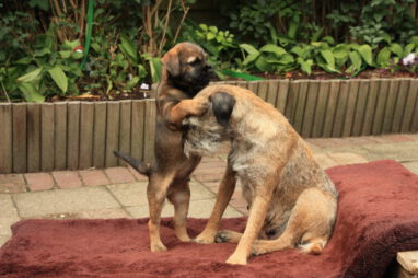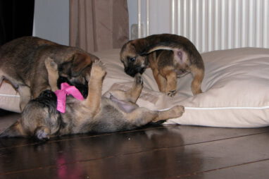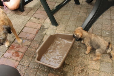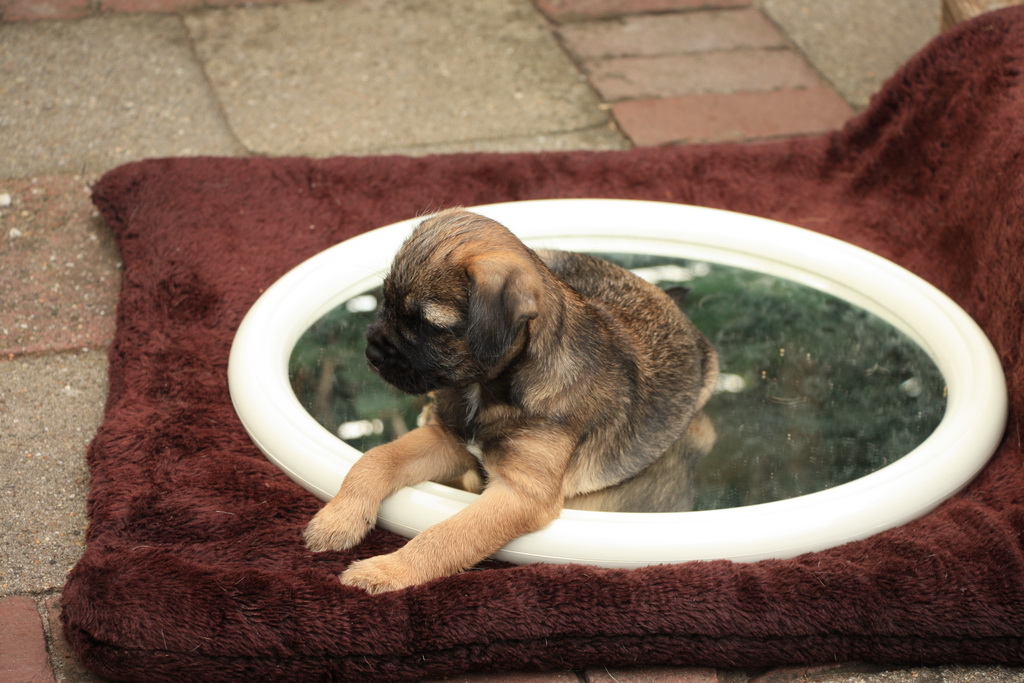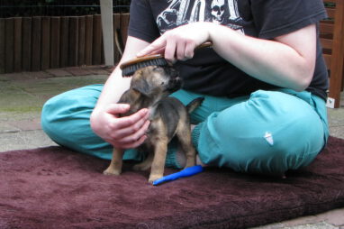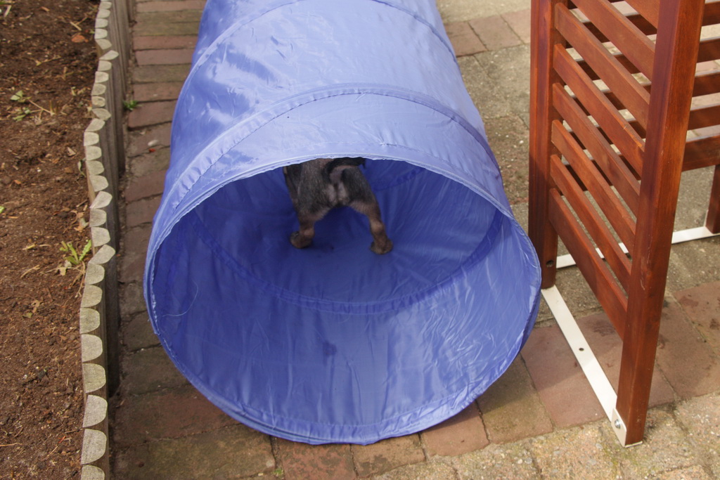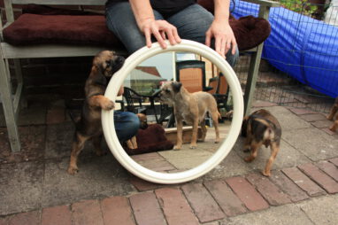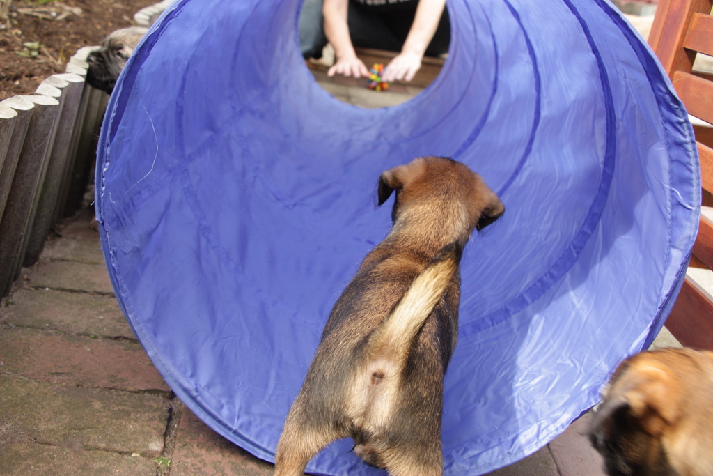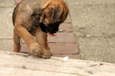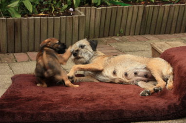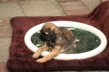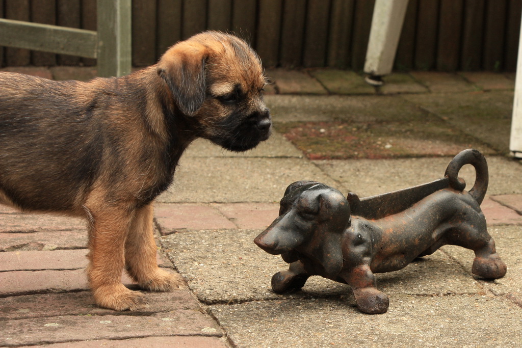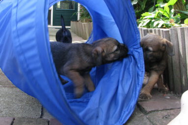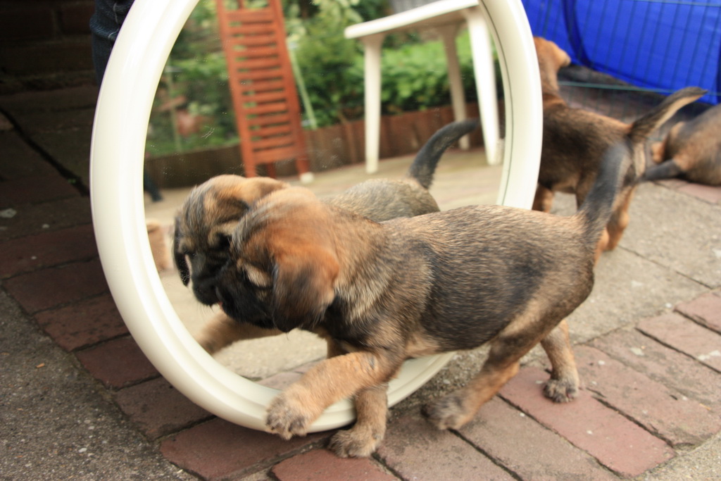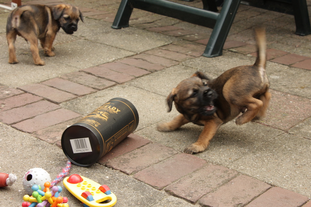 De bench en het speelgoed zijn in ieder geval goedgekeurd en het grote hondenkussen is super! Kennismaking met zijn nieuwe huisgenoten (twee katten) is uitgesteld tot Marlow definitief verhuisd. Daar zal hij nog van opkijken!