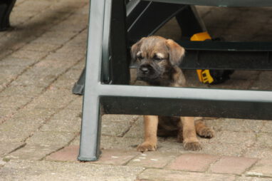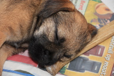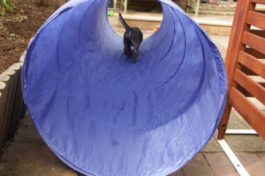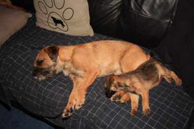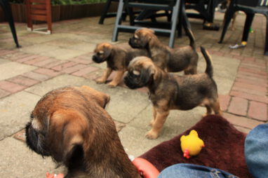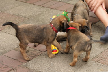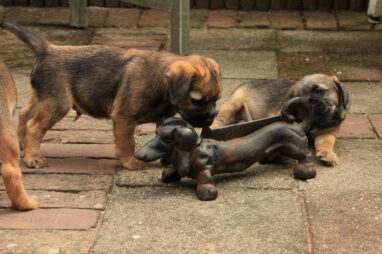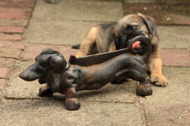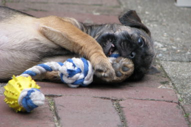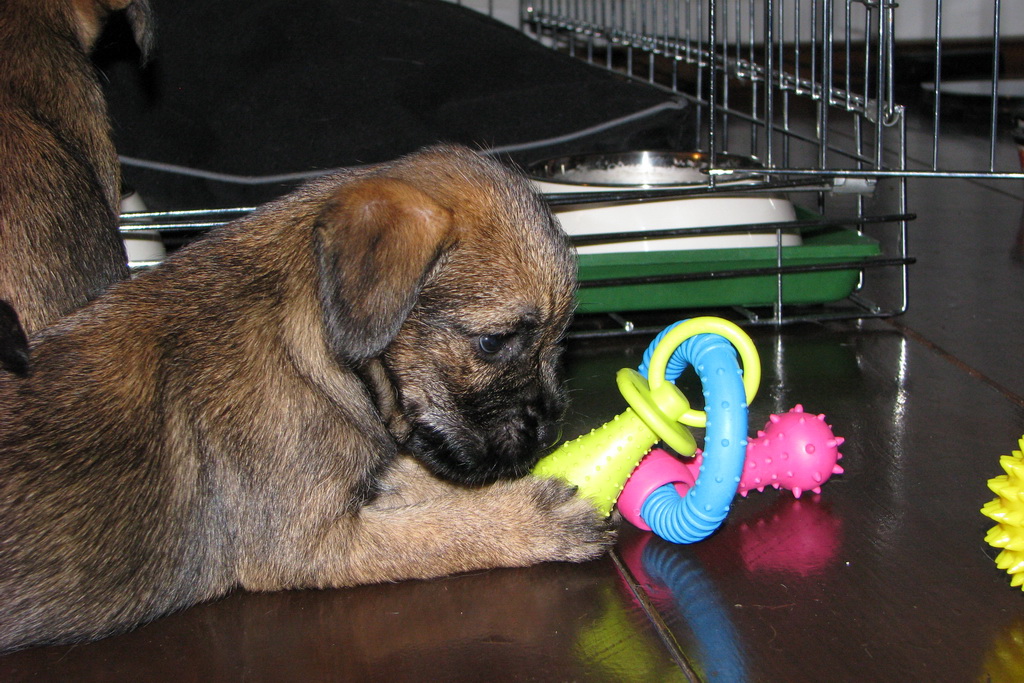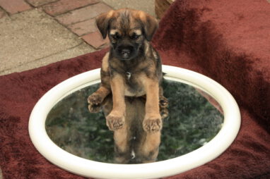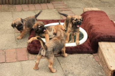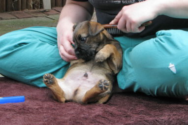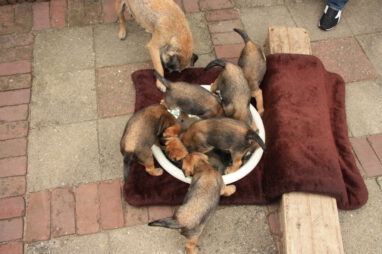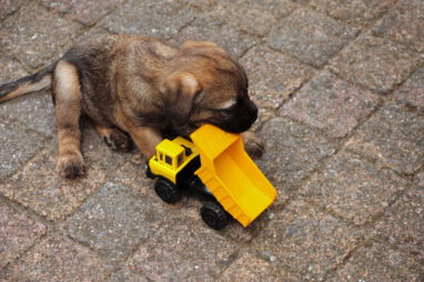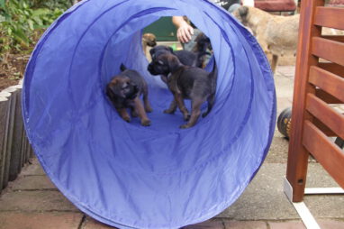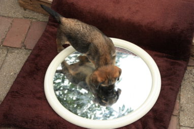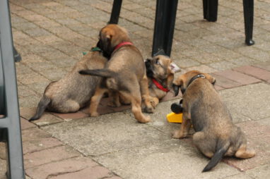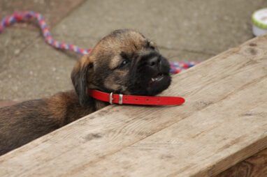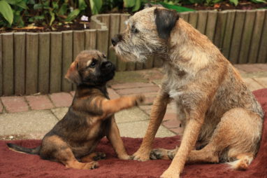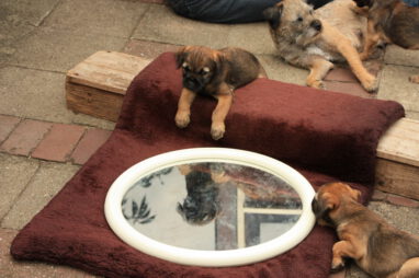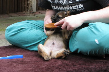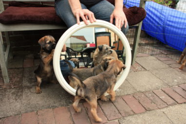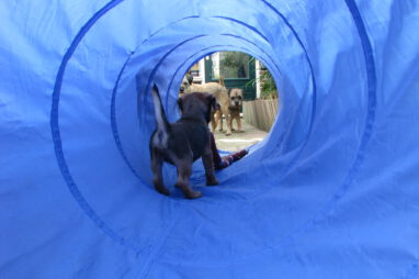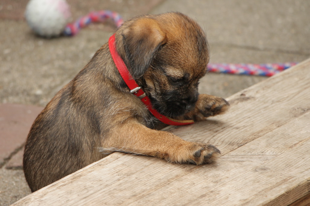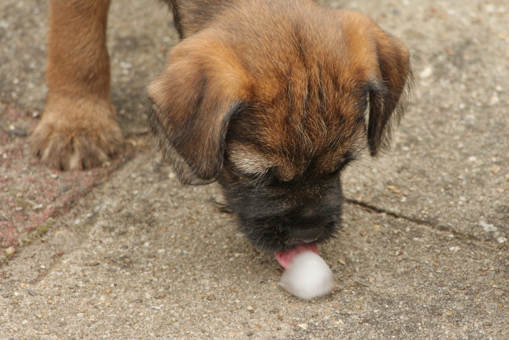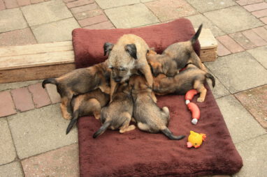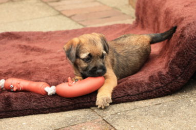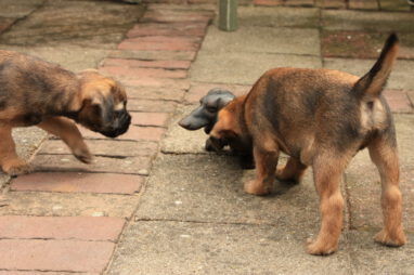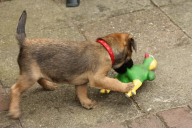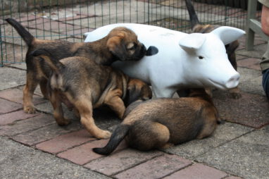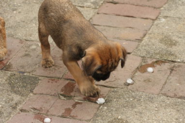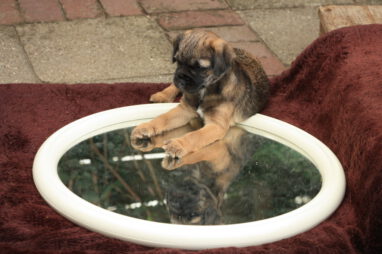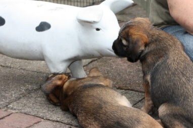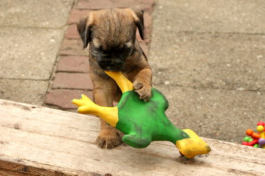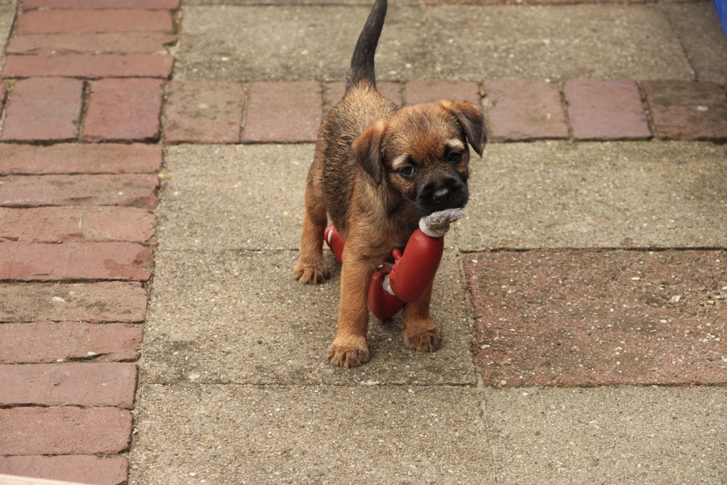 De bench en het speelgoed zijn in ieder geval goedgekeurd en het grote hondenkussen is super! Kennismaking met zijn nieuwe huisgenoten (twee katten) is uitgesteld tot Marlow definitief verhuisd. Daar zal hij nog van opkijken!