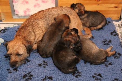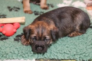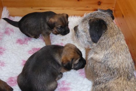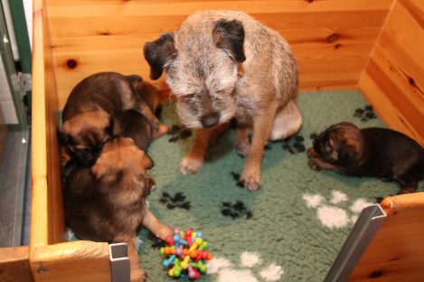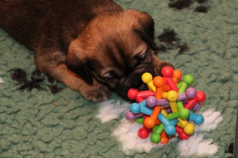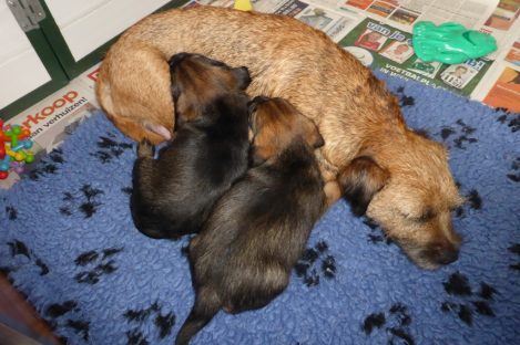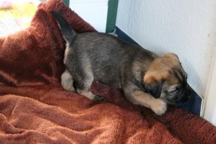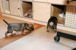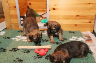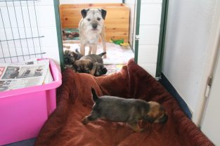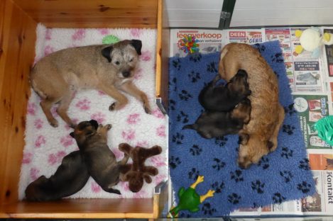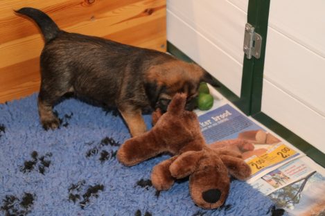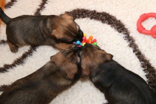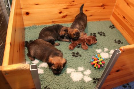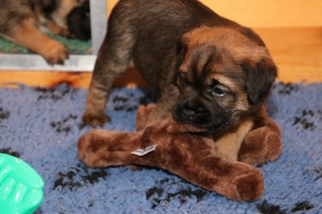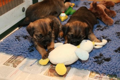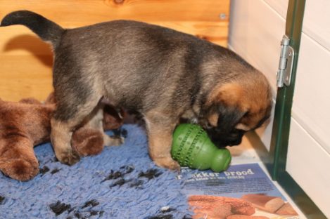 Het is verbazingwekkend hoe snel pups zich ontwikkelen. Drie weken geleden konden ze nauwelijks zien en horen, een week later konden ze een beetje door de bak heen hobbelen. En nu zien ze alles, horen ze alles, hollen door de kamerkennel en hebben de grootste lol, zowel met elkaar als met hun speelgoedjes.Soms wordt er wel eens wat gegromd en gegrauwd, maar over het algemeen is het een nest dat het heel goed met elkaar kan vinden en heel lief voor elkaar is. Ze lijken in gedrag veel op elkaar, er zitten geen hele drukke of teruggetrokken hondjes bij.