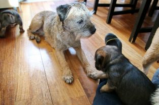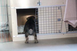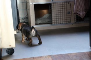 De pups mogen nu ook een paar keer per dag de kamer in. De eerste keer klommen ze voorzichtig uit de kamerkennel en met behulp van mama en oma waren ze al gauw alles aan het verkennen. Ze zijn alle vier nergens bang voor en zijn al overal geweest. De benches van de volwassen honden zijn heel interessant en uitgebreid bekeken. Ook Fudge, die net als Lewis even opgesloten zat om het voor de pups niet al te druk te maken, werd door de pups ontdekt en lekker uitgedaagd.
