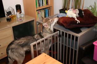 De andere honden zijn heel geïnteresseerd in het speelgoed van de puppy’s. We leggen het daarom telkens hoog weg, maar vergeten dat Jaggu al een grote hond is. Als wij even niet kijken probeert ze speelgoedbeestjes te pakken. Ach, ze is zelf nog maar een kleuter en we kunnen erg lachen om haar streken.