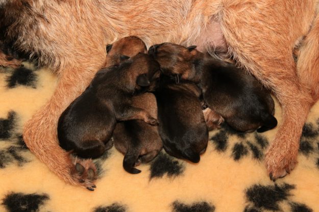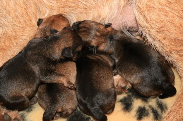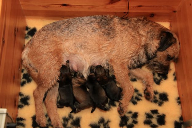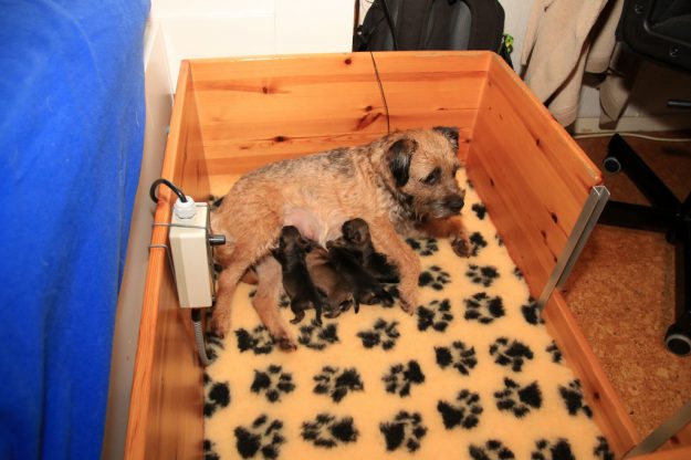 In de loop van zaterdagmorgen begonnen de eerste weeën te komen. Jane werd heel lief gesteund door de Ivy en Hestia, die regelmatig even bij haar kwamen liggen. In het begin van de middag kwamen de eerste ontsluitingsweeën. Ivy en Hestia hebben we toen maar ven uit de kraamkamer gezet. Vanaf vier uur beginnen de persweeën te komen. Even voor zes uur komt de eerste pup, een reutje. In het uur daarna komen er een teeef, een reu en nog een teef. Geboortegewichten van 225 to 250 gram.