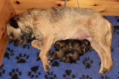 Omdat de pups eigenlijk alleen zogen en veel slapen, is het voor ons nog heel rustig. Wij hoeven alleen af en toe de werpkist schoon te maken en een nieuw kleed erin te doen. Verder kunnen we heerlijk kijken en genieten van die vier wurmpjes.