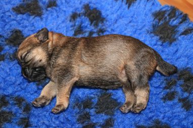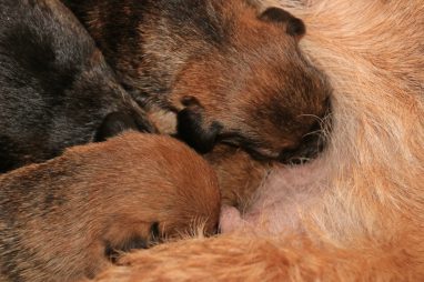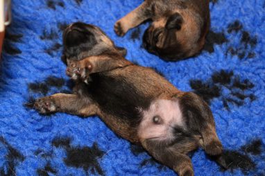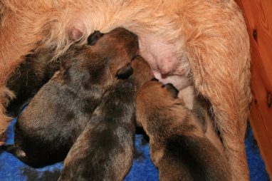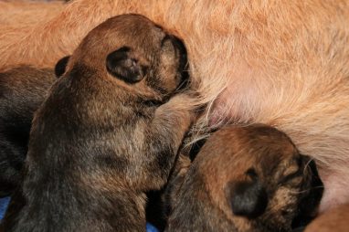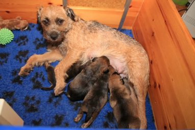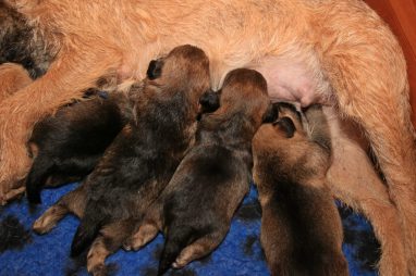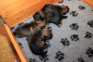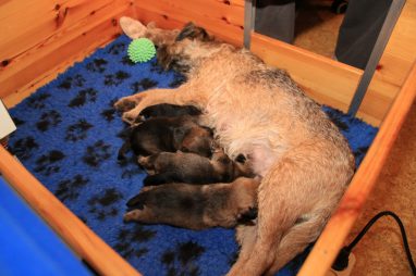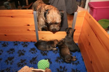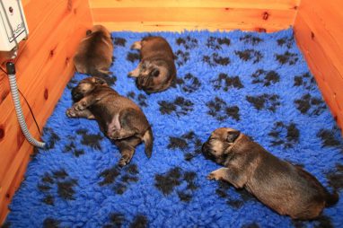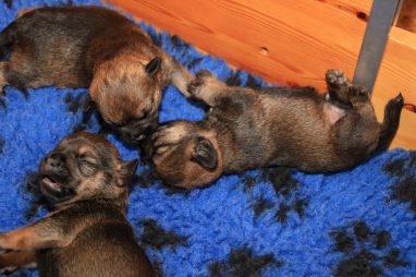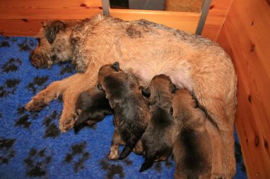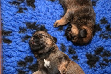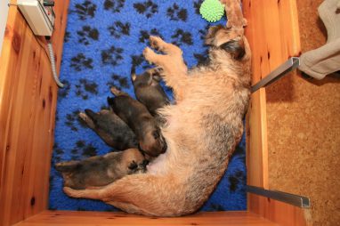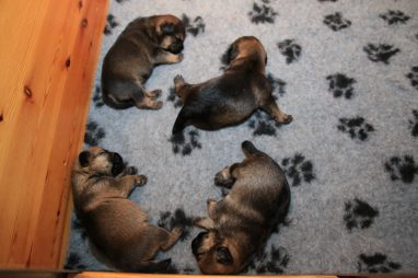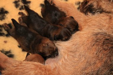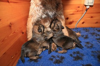 We zitten alweer aan het einde van de tweede week. De pups groeien als kool en zijn allemaal al ruim verdubbeld in gewicht. Jane doet het geweldig en is een zeer zorgzame en beschermende moeder. Er hoeft maar een pup een kikje te geven en Jane staat er direct bij. De pups worden prima door haar schoongemaakt, de bak en de kleedjes blijven keurig schoon. Jane vindt het wel fijn weer af en toe mee te gaan met een boswandeling. Even eruit, maar daarna direct weer naar de pups. Gelijk verzorgen en als de pups er zin in hebben, ook maar een zoogbeurt erbij.