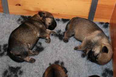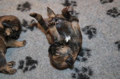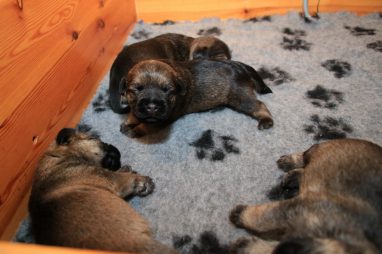 De pups gebruiken hun voorpoten al redelijk goed als ze proberen te lopen, de achterpoten is duidelijk wat moeilijker. Die coördinatie moeten ze nog gaan ontwikkelen, daar oefenen ze nu elke dag mee. Een heerlijk gezicht als je dat kleine grut door de bak heen ziet gaan. Ze zijn al best snel en als er een broer of zus in de weg ligt, gaan ze er gewoon overheen.