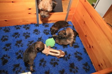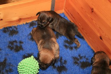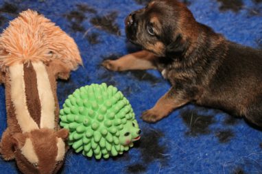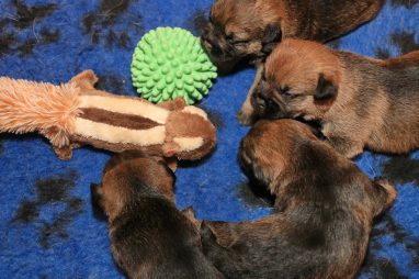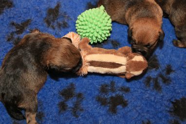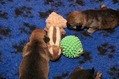 Heel langzaam gaan de oogjes nu open. In het begin zijn die altijd blauw, dat gaat later bijkleuren. En we hebben de indruk dat ze ook op geluid gaan reageren. Natuurlijk hebben de pups al wat speeltjes (we hebben zakken vol!). Dat vonden ze wel heel interessant. Gelijk ruiken, er tegen aan duwen en 1 pup begin al in de eekhoorn te bijten, als een echte jachthond.