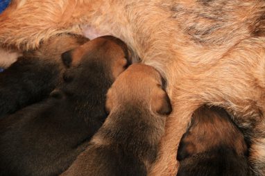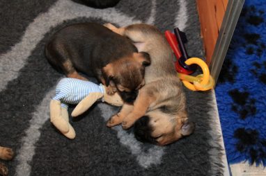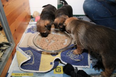 Op de foto’s waar de pups zogen kan je zien hoe goed ze gegroeid zijn. Ze zijn allemaal meer dan 1,2 kilogram. Aan de top staat Onaya met 1,4 kg! Ze krijgen nu drie keer per dag mousse, dat we nu ook aanvullen met vleesvoeding voor puppy’s. En dat gaat er goed in, naast de maaltijden die ze nog van moeder krijgen.