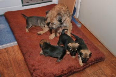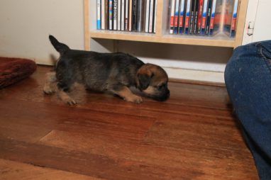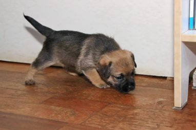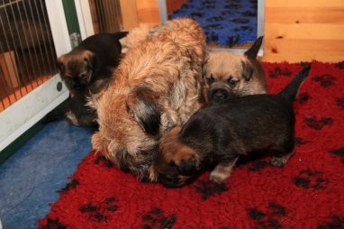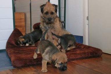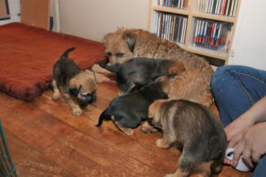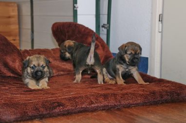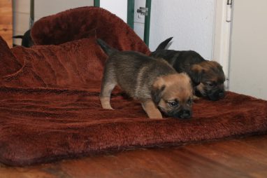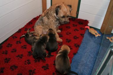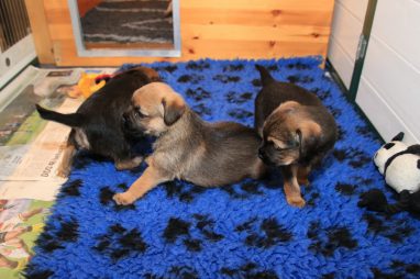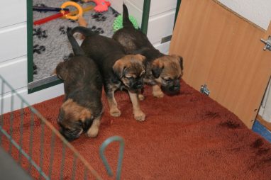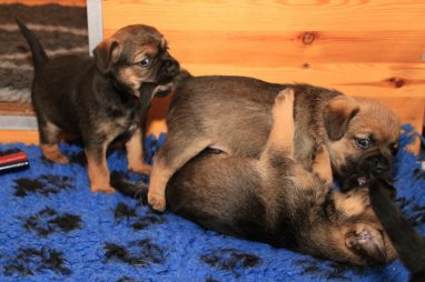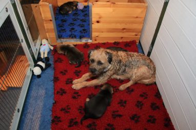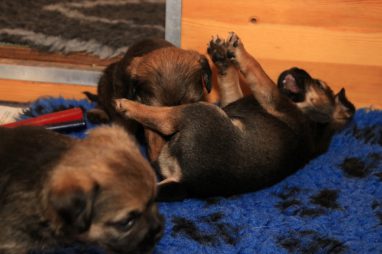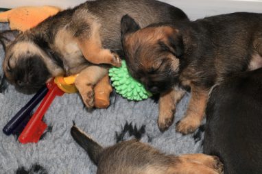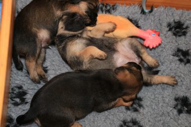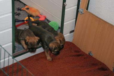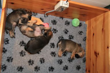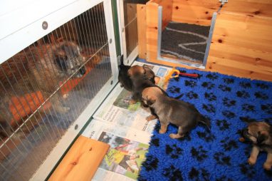 De werpkist is nu de hele dag open, zodat de pups de hele kamerkennel tot hun beschikking hebben. Daar spelen ze naar hartenlust in, met elkaar en met de speeltjes. En vaak is Jane er ook bij, zodat ze haar kroost een beetje in de gaten kan houden. Maar veel hoeft ze niet in te grijpen, de pups zijn (meestal) vrij aardig voor elkaar. En als ze uitgespeeld en moe zijn gaan ze uit zichzelf weer naar de werpkist, waar ze dan een heerlijk plekje om te slapen opzoeken.