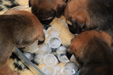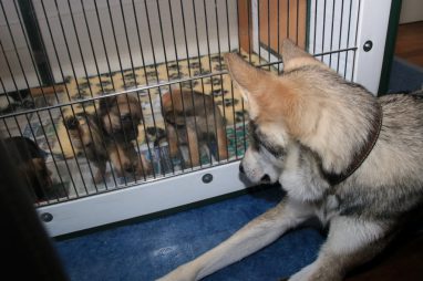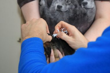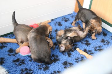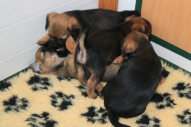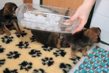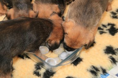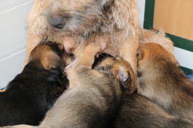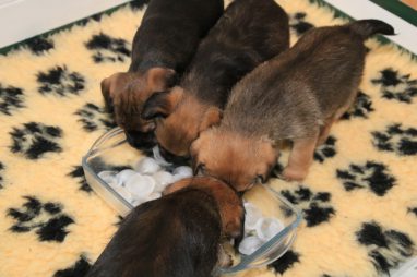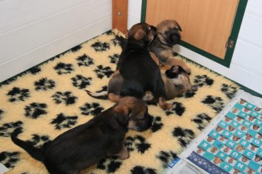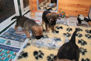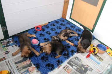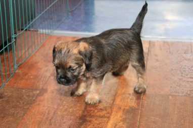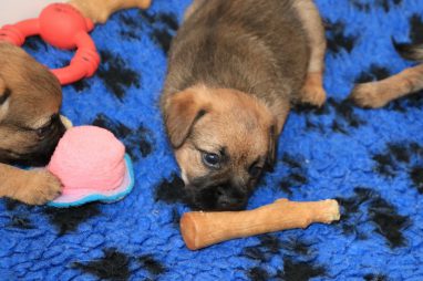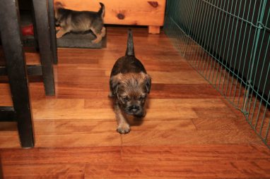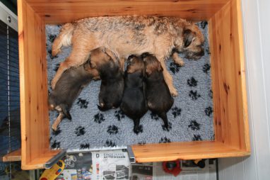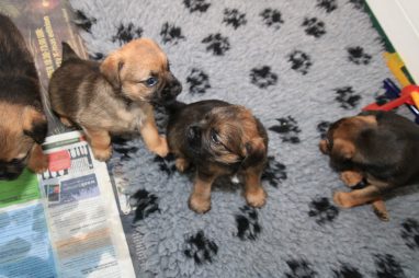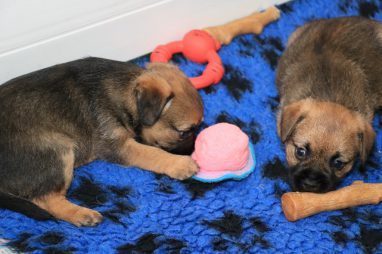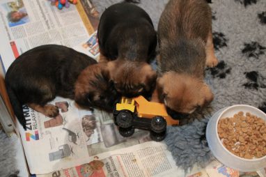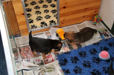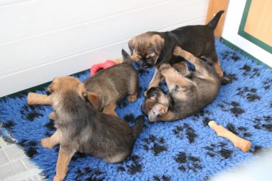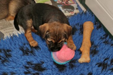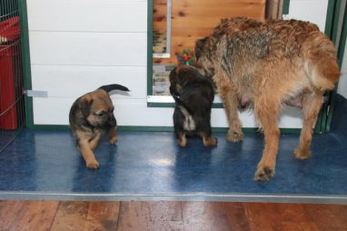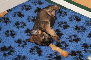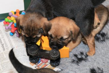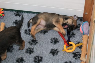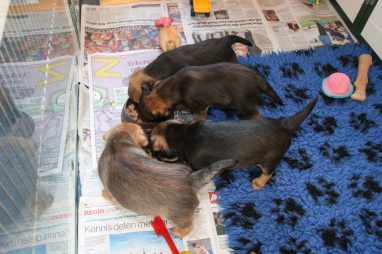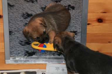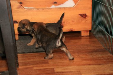 Maandag zijn de pups gechipt en is er een swap voor het DNA-certificaat afgenomen. De chipper werkte zo efficiënt dat alles klaar was voordat de pups er erg in hadden wat er gebeurde. Ze lieten niets merken tijdens het chippen en daarna gingen ze lekker met elkaar spelen alsof er niets gebeurd was. Het zijn dan ook echte Border Terriërs.