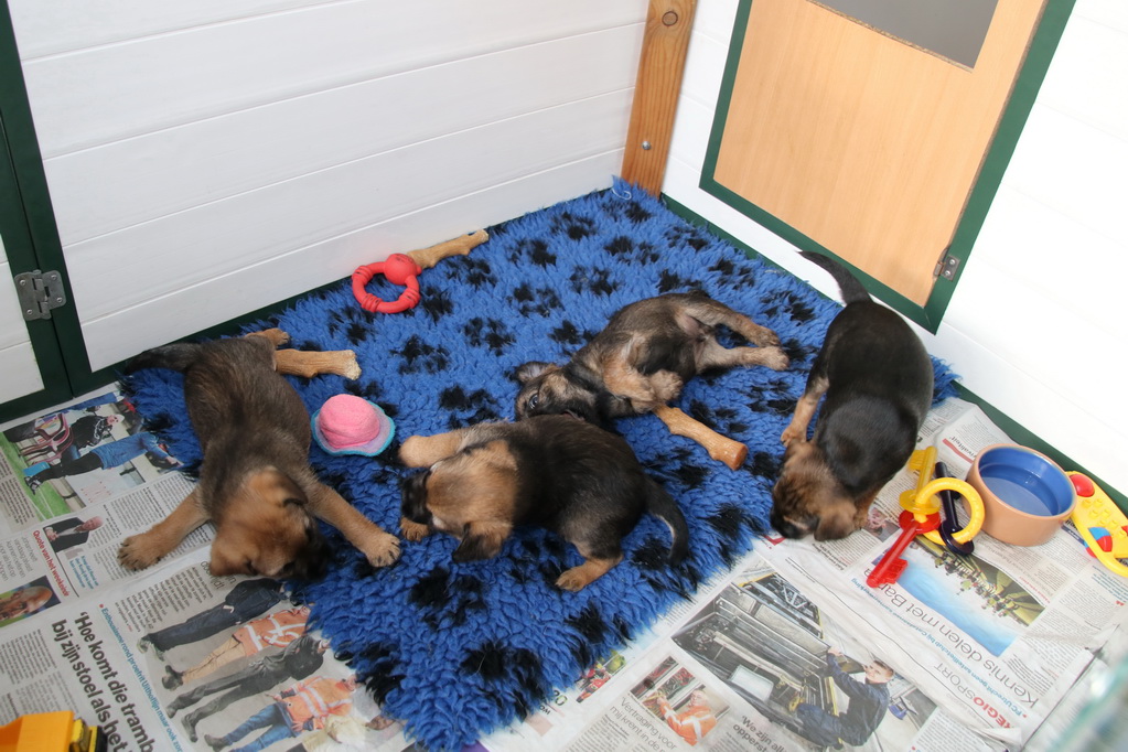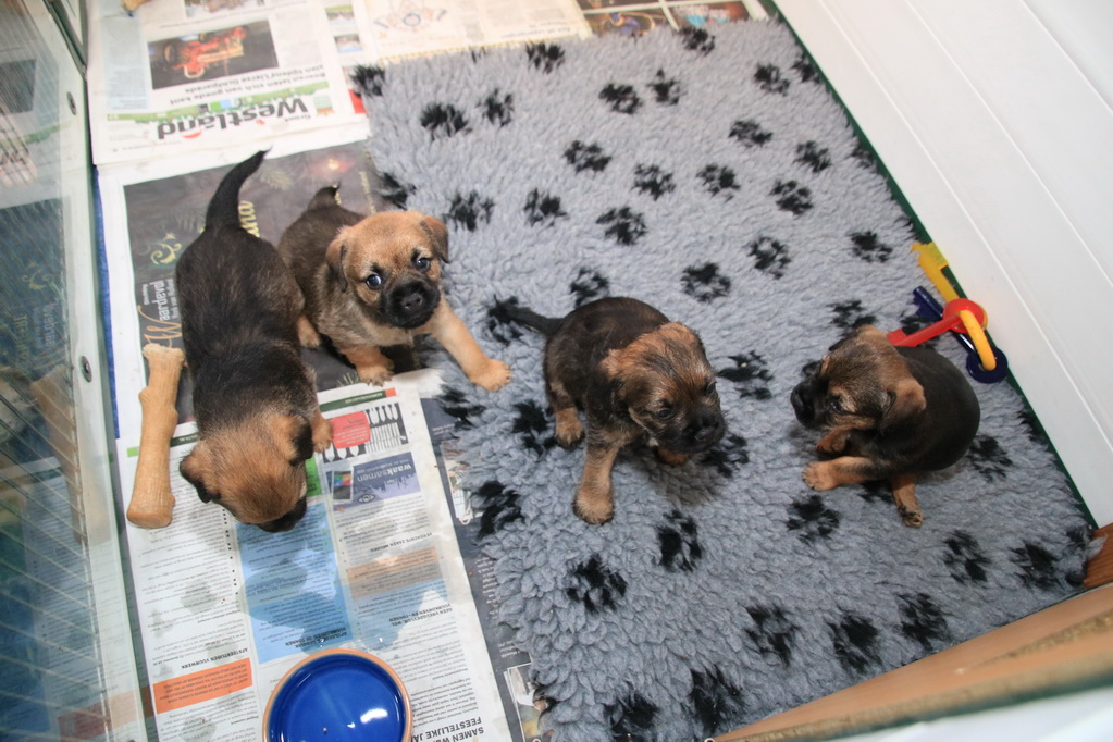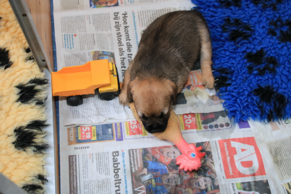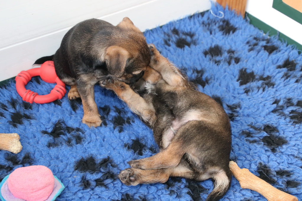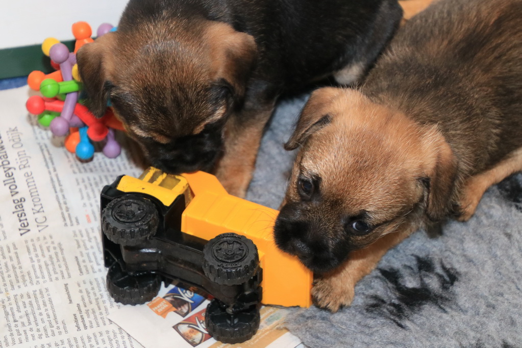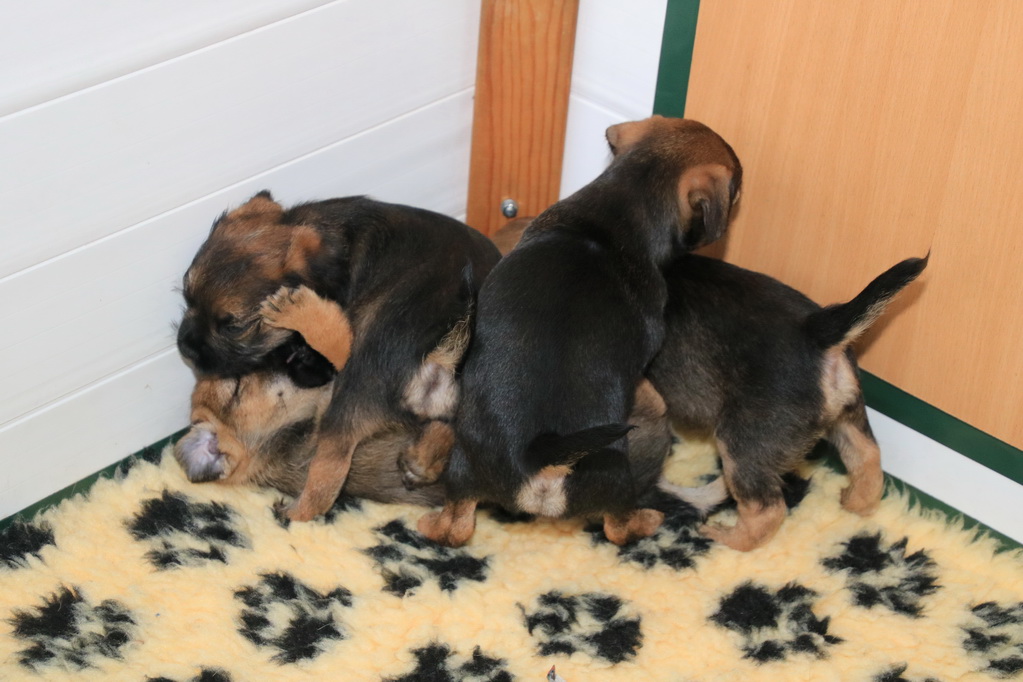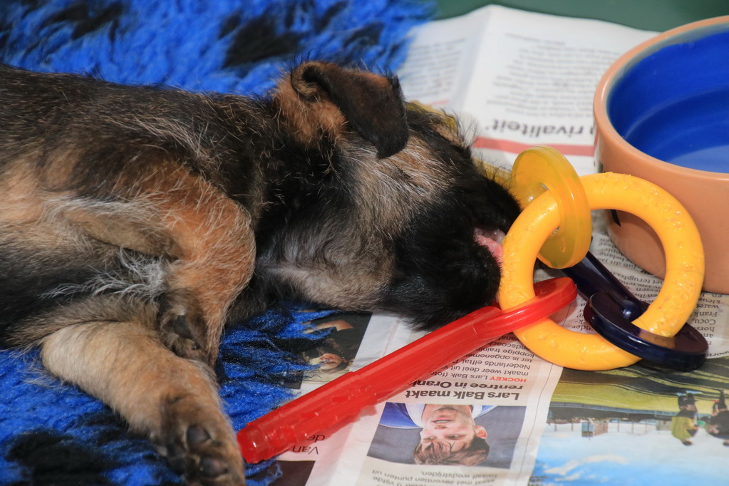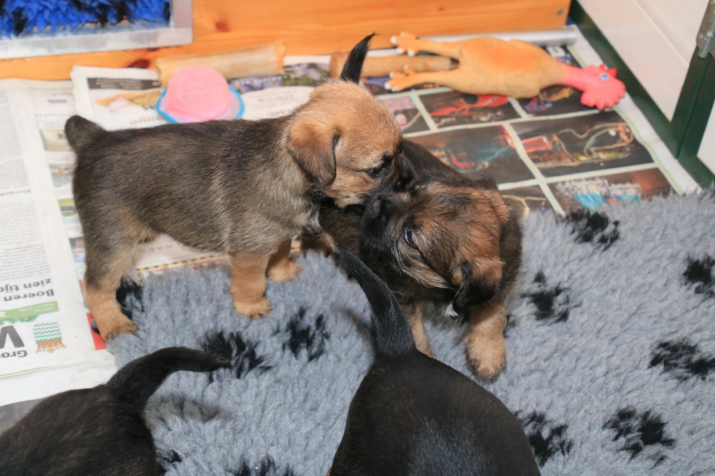 Maandag zijn de pups gechipt en is er een swap voor het DNA-certificaat afgenomen. De chipper werkte zo efficiënt dat alles klaar was voordat de pups er erg in hadden wat er gebeurde. Ze lieten niets merken tijdens het chippen en daarna gingen ze lekker met elkaar spelen alsof er niets gebeurd was. Het zijn dan ook echte Border Terriërs.
