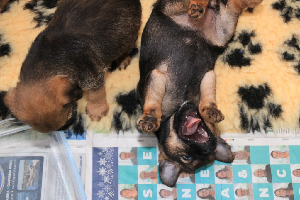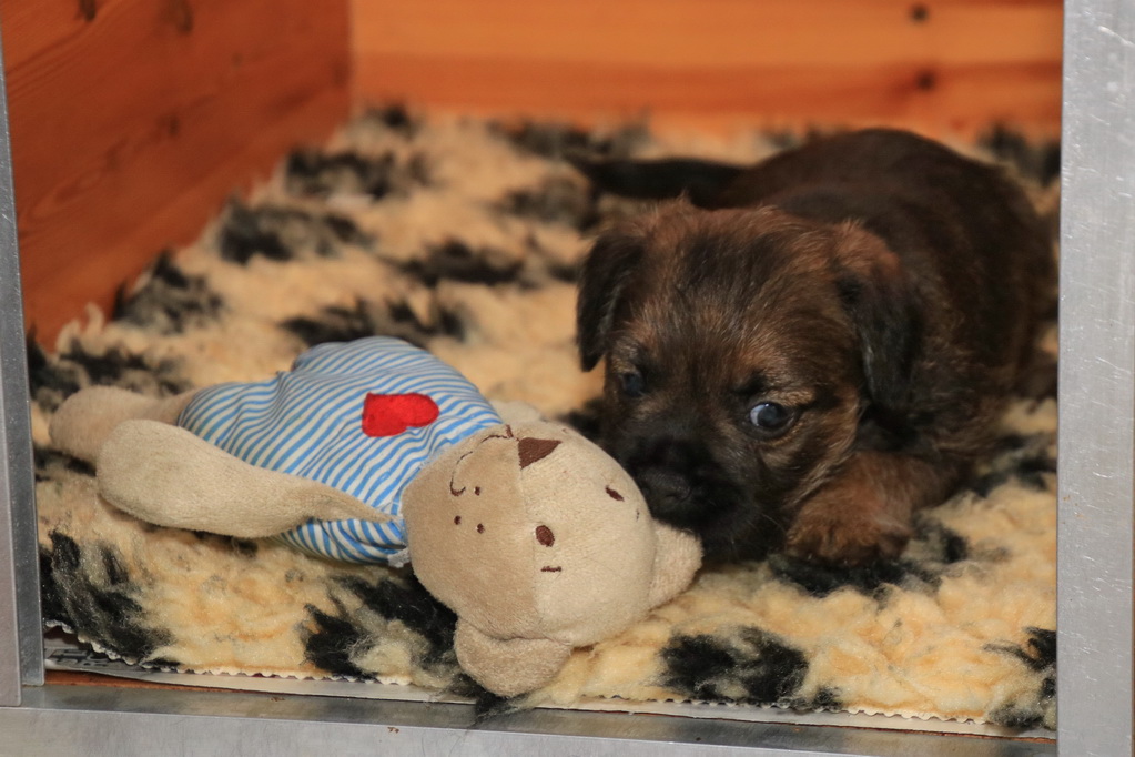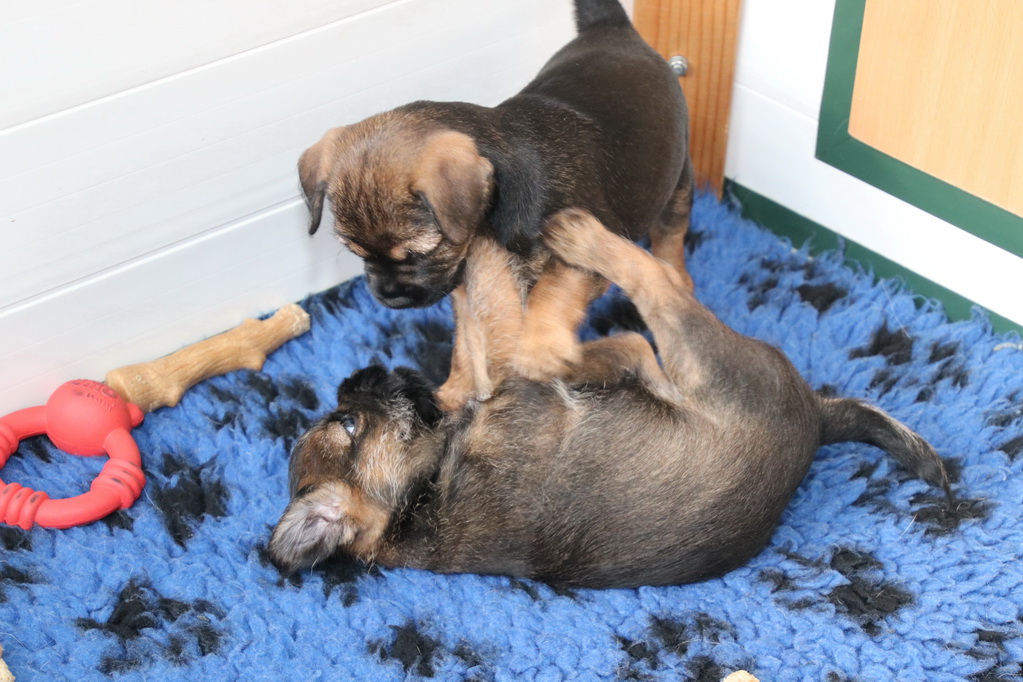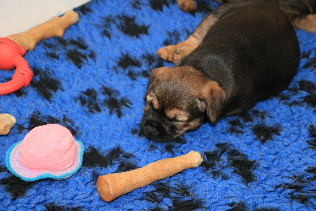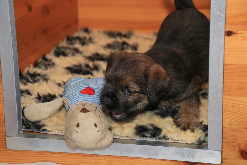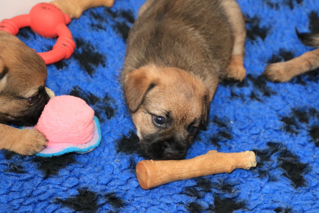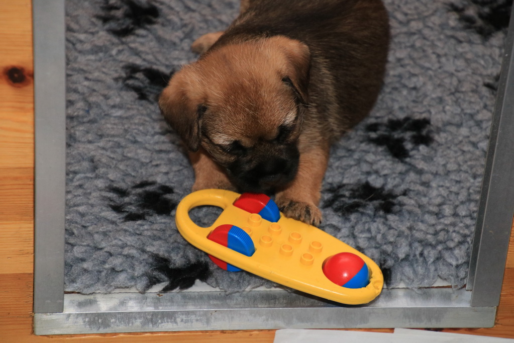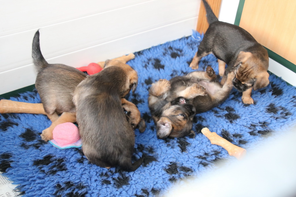 Maandag zijn de pups gechipt en is er een swap voor het DNA-certificaat afgenomen. De chipper werkte zo efficiënt dat alles klaar was voordat de pups er erg in hadden wat er gebeurde. Ze lieten niets merken tijdens het chippen en daarna gingen ze lekker met elkaar spelen alsof er niets gebeurd was. Het zijn dan ook echte Border Terriërs.