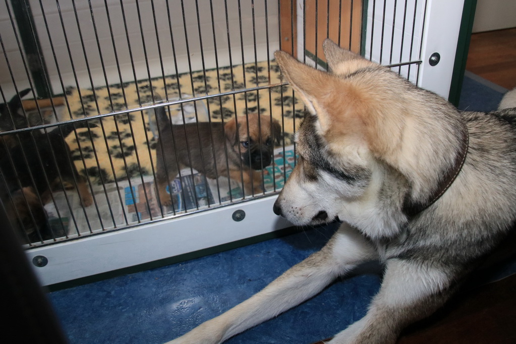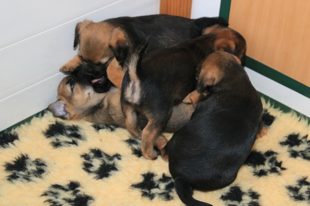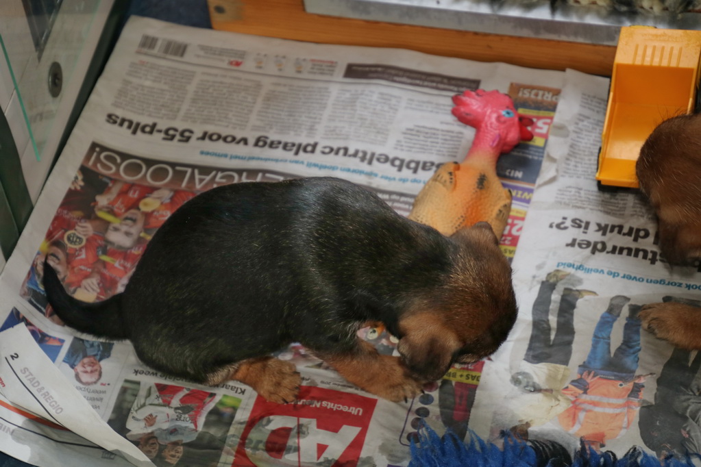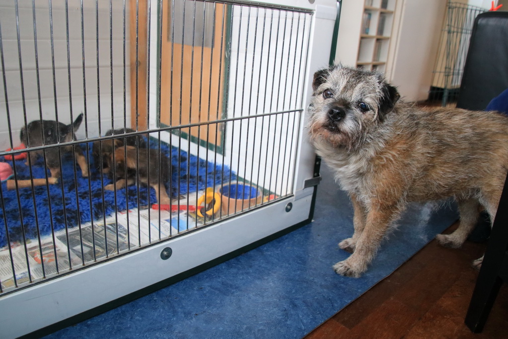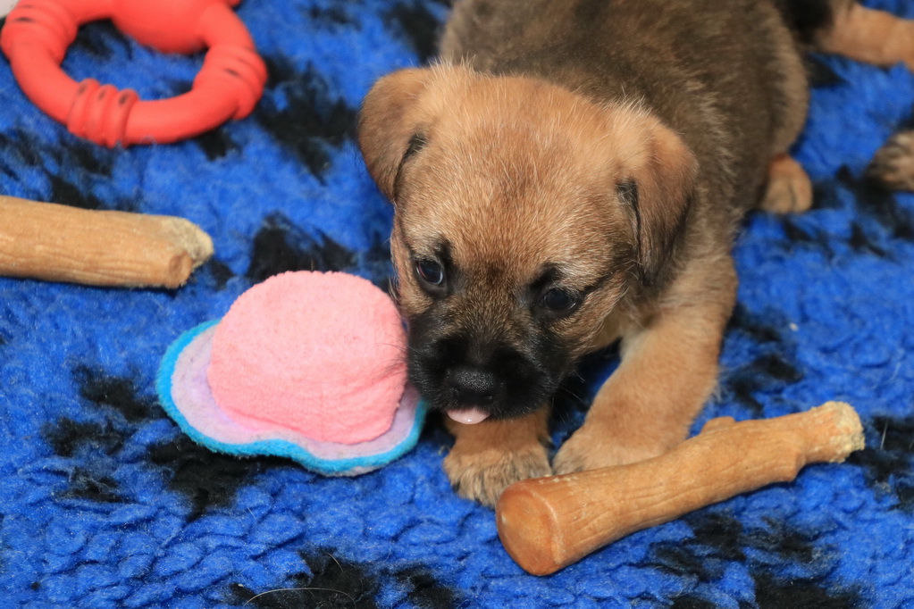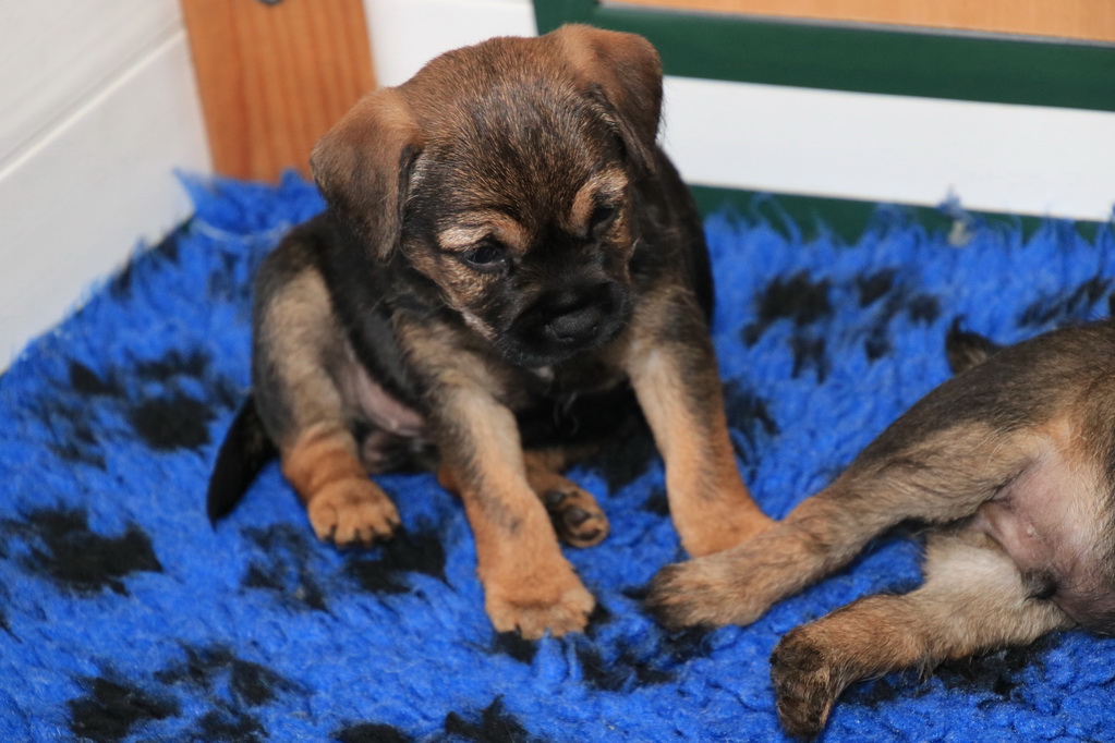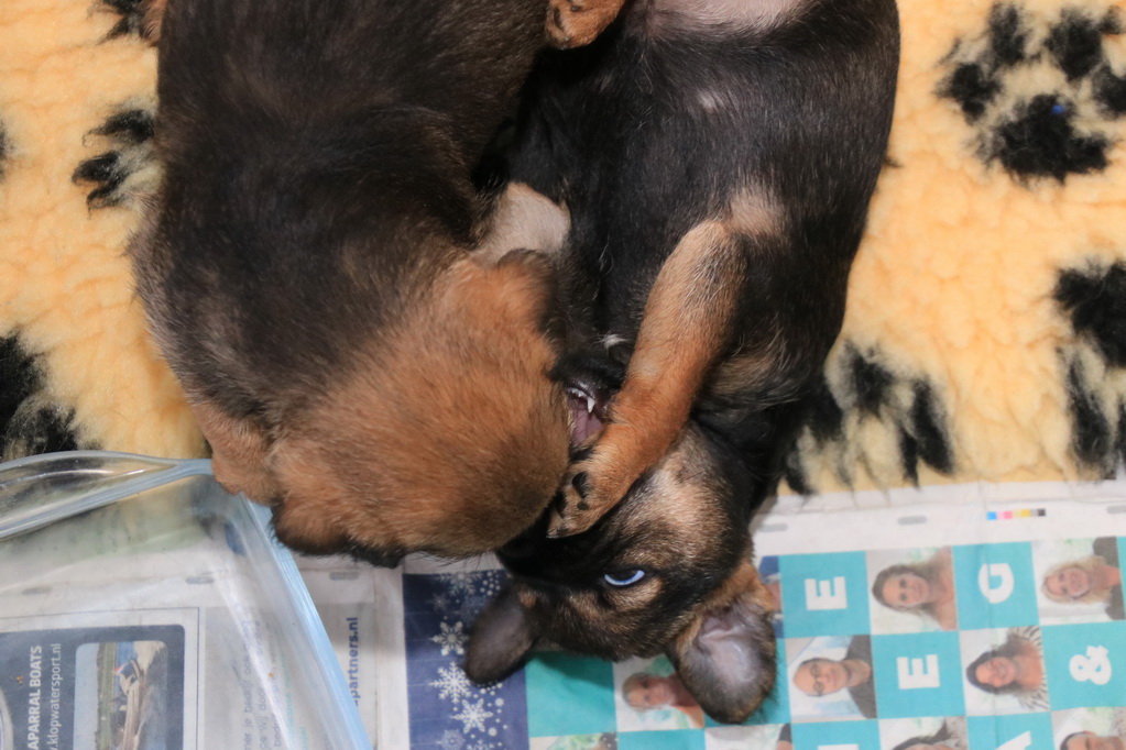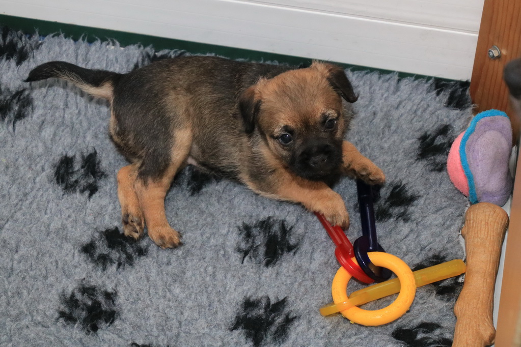 Maandag zijn de pups gechipt en is er een swap voor het DNA-certificaat afgenomen. De chipper werkte zo efficiënt dat alles klaar was voordat de pups er erg in hadden wat er gebeurde. Ze lieten niets merken tijdens het chippen en daarna gingen ze lekker met elkaar spelen alsof er niets gebeurd was. Het zijn dan ook echte Border Terriërs.
