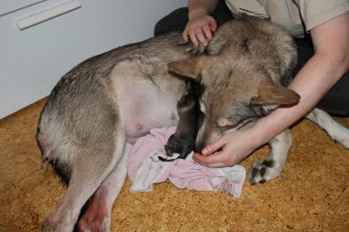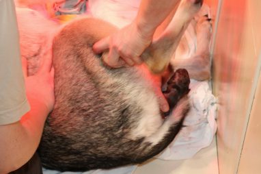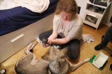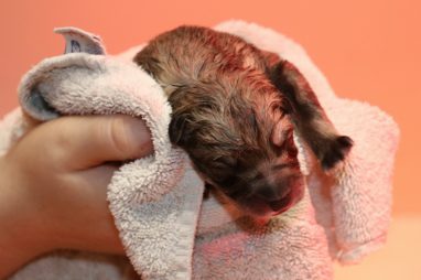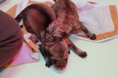 Dinsdagavond ging de temperatuur van Jaggu ruim 1 graad naar beneden. We wisten dat het ging komen. In de loop van de woensdag werd zij steeds onrustiger. Ze kon niet lang op een plaats blijven liggen en wilde ook gaan graven in haar mand. Na het avondeten besloten we met haar naar boven te gaan, waar op de kamer van Marloes alles klaar stond voor Jaggu en haar pups. Om 19:14 kreeg Jaggu echte persweeën en een minuut later was de eerste pup geboren, een teefje. Het was maar goed dat de buren niet thuis waren, want Jaggu maakte nogal wat geluid tijdens de geboorte.