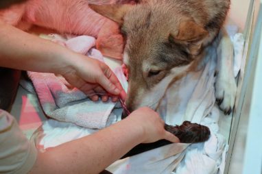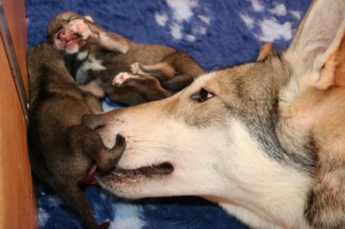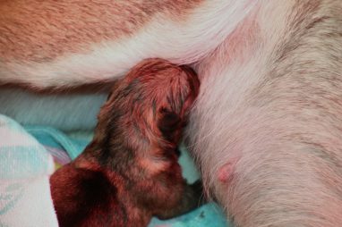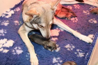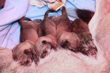 Daarna werden nog zes pups geboren, met een steeds een tot anderhalf uur ertussen. Jaggu maakte (gelukkig) steeds minder geluid tijdens het bevallen. Zo rond drie uur ’s nachts vond Jaggu het wel welletjes. De pups waren allemaal schoon gelikt, hadden goed gedronken en sliepen heel tevreden. De buik van Jaggu was nog een beetje dik, maar nog niet alle nageboortes waren gekomen.