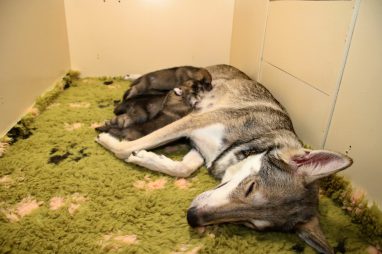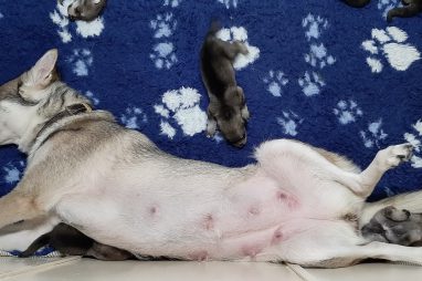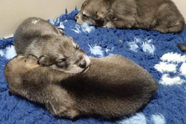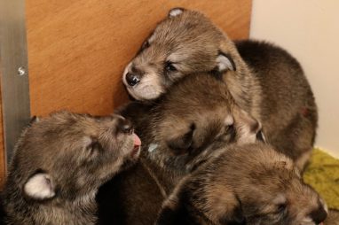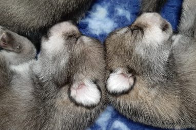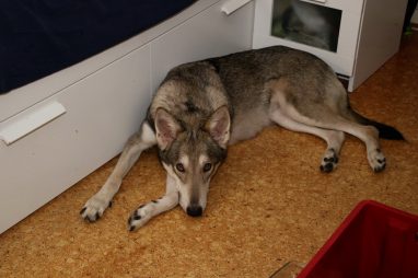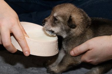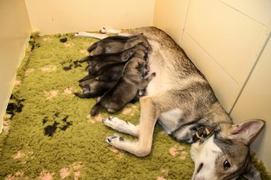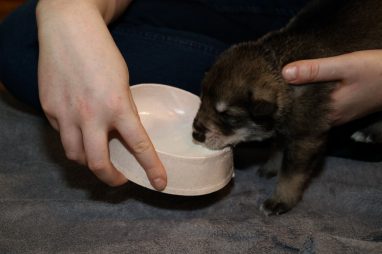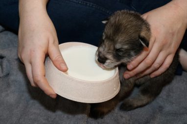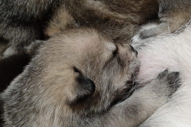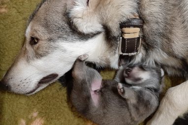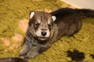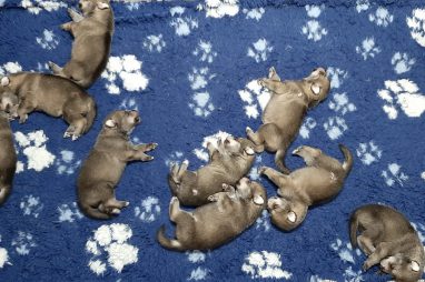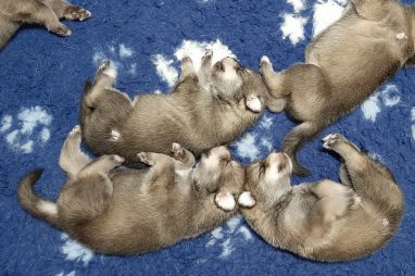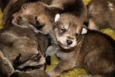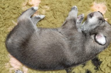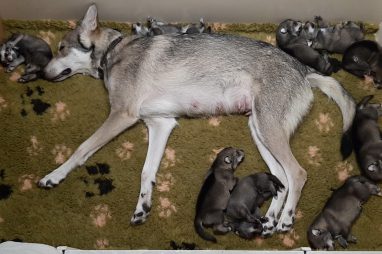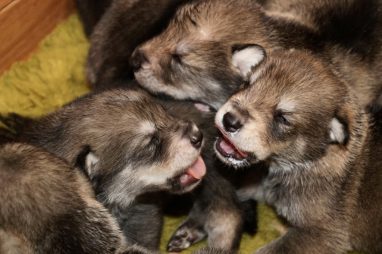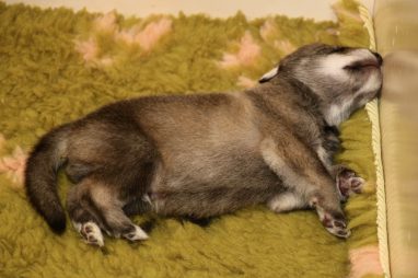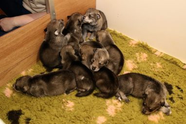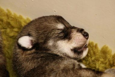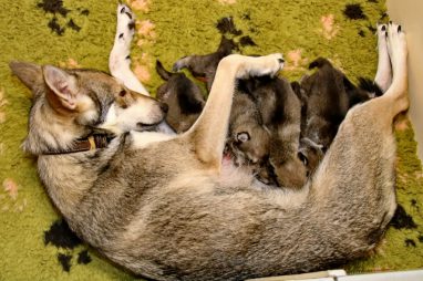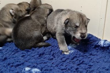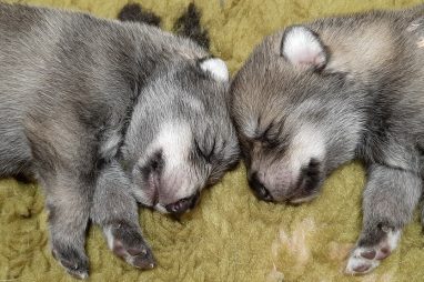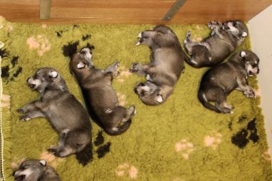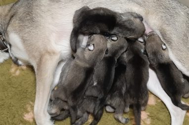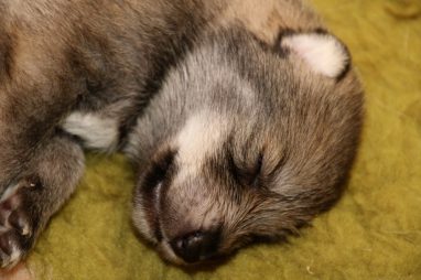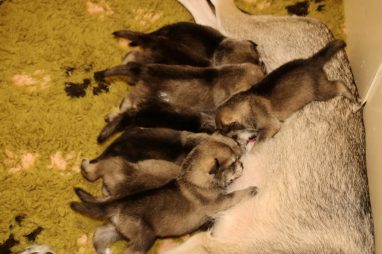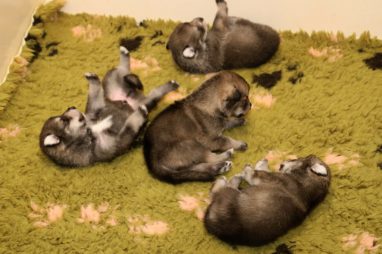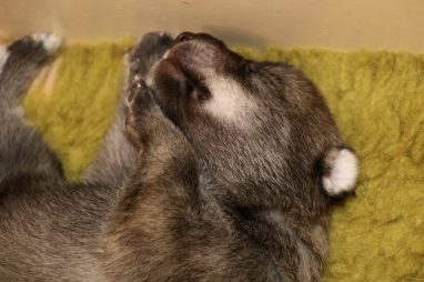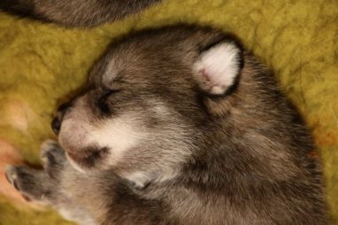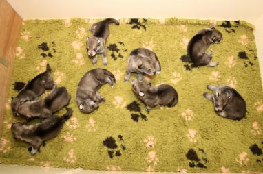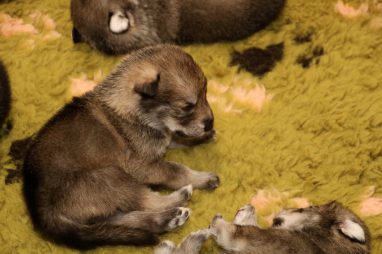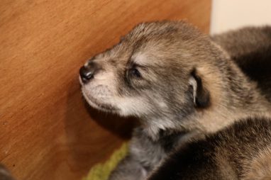 Heel langzaam beginnen de oogjes te kieren. Over een paar dagen zullen ze wel opengaan. Ook gaan binnenkort de oren open. De pups kunnen dan kijken en horen. Er zijn er ook al een paar die op hun pootjes gaan staan en proberen te lopen. In vergelijking met Border Terriër pups zijn de Saarlooswolfhonden pups sneller in hun ontwikkeling. Op de vachtjes begint al dekhaar te komen. De pups groeien goed en zijn allemaal heel tevreden.