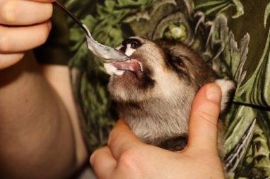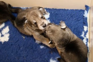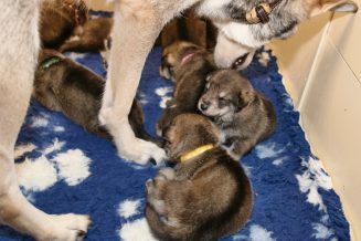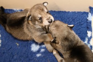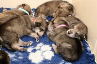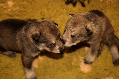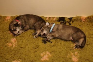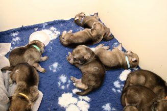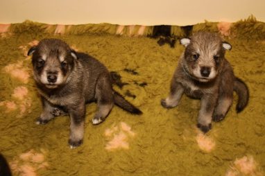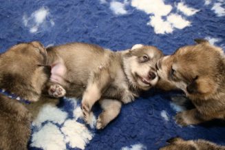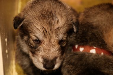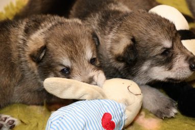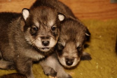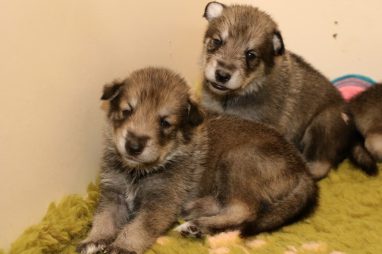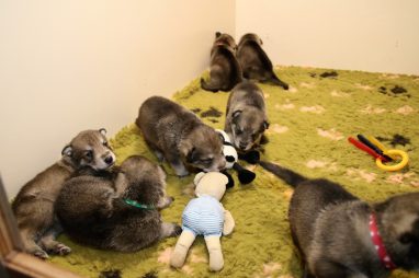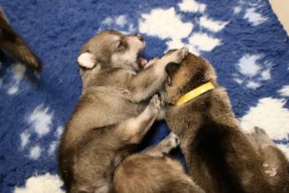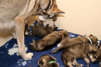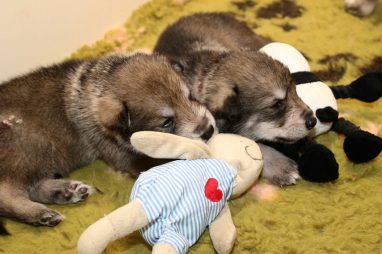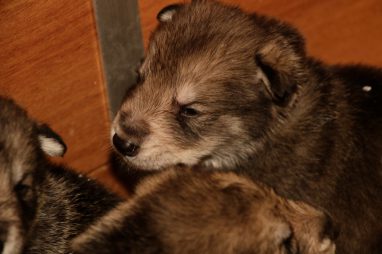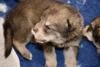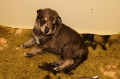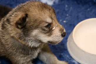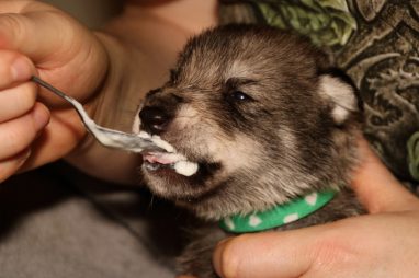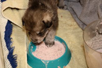 We zijn de pups nu aan het wennen aan wat vaster voedsel. We hebben een beetje vers vlees voeding door de pap heen gedaan. Dat vonden ze erg lekker. Ze eten het uit een lepel, maar ook uit een bakje eten beginnen ze door te krijgen. En in een bakje kan je natuurlijk ook je poot zetten! Na het eten zijn ze helemaal moe geworden. En met de pap nog overal op zich vallen ze in slaap. Maar Jaggu komt toch nog even langs voor een grondige poetsbeurt.