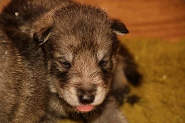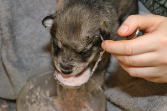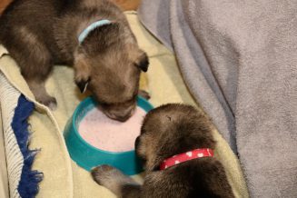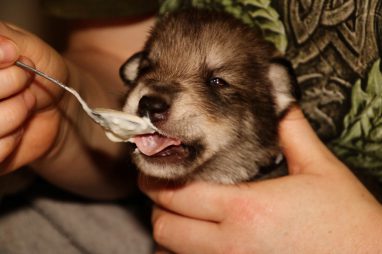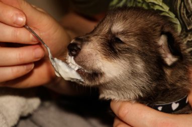 We zijn begonnen om de pups pap van puppymelk en Nutrix te geven. Ze krijgen dit twee keer per dag. De pups vinden dit veel lekkerder dan alleen de puppymelk. Ze eten het nu nog van een theelepeltje, we gaan ze leren het uit een bakje eten. Het is een lekkere kliederboel, maar gelukkig maakt Jaggu de pups na het eten weer heel goed schoon, ze vindt de pap zelf ook heel lekker.