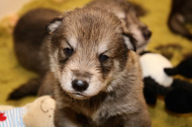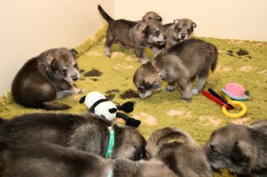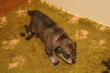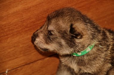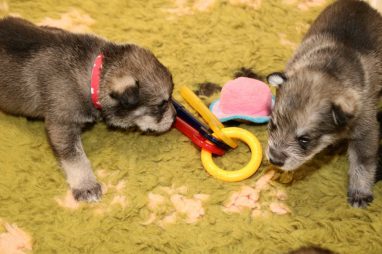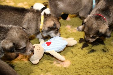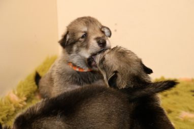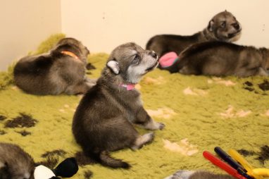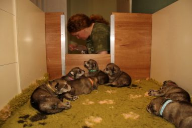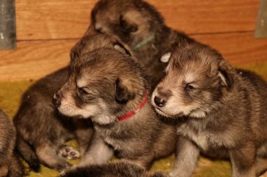 Alle pups hebben nu hun ogen open en ook hun oren zijn open. Ze reageren nu op beweging en geluid. Ze gaan ons herkennen. Vooral Marloes is favoriet, de supermoeder die pap geeft! Nu de oogjes open zijn beginnen het echt hondjes te worden. Ze gaan steeds beter lopen en steken hun staartjes al in de lucht.