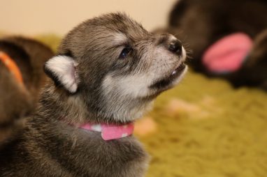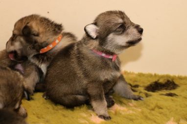 De pups hebben nu gekleurde bandjes om, zodat we ze nog makkelijker uit elkaar kunnen houden. Roze, geel en oranje zijn de meisjes. Jaggu vindt het prima dat haar pups bandjes om hebben, ze gaat er niet aanzitten.