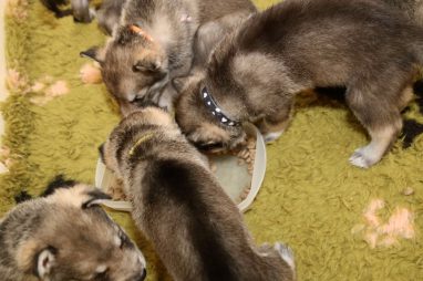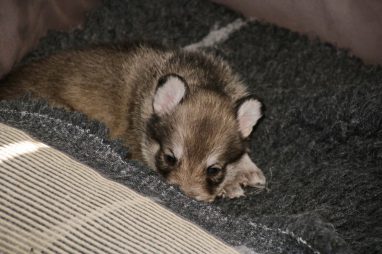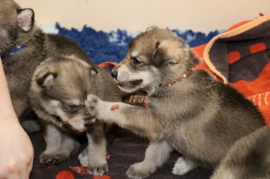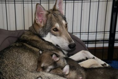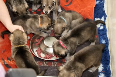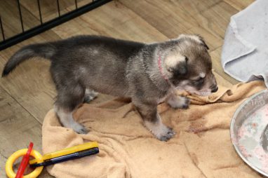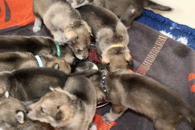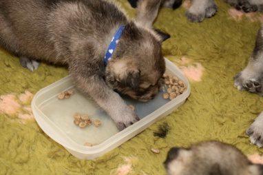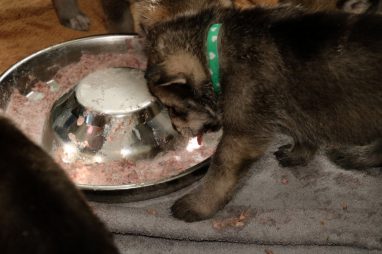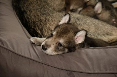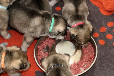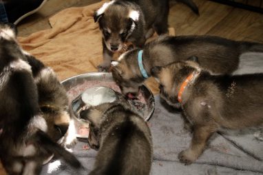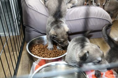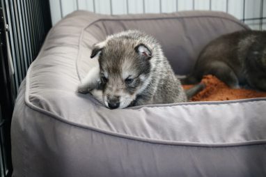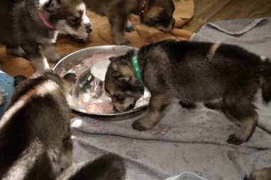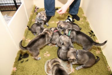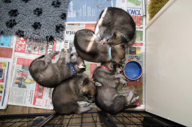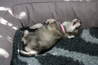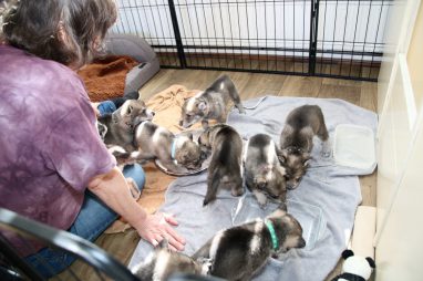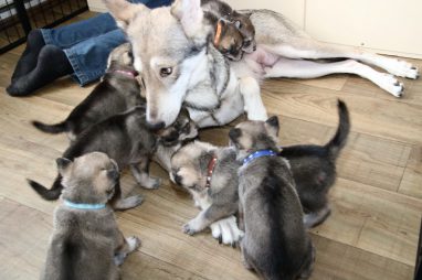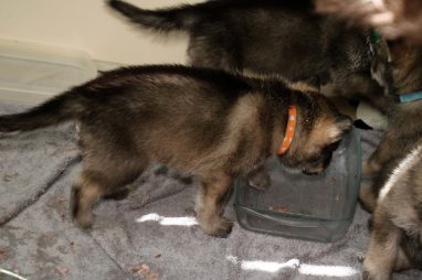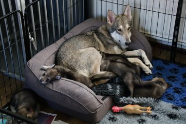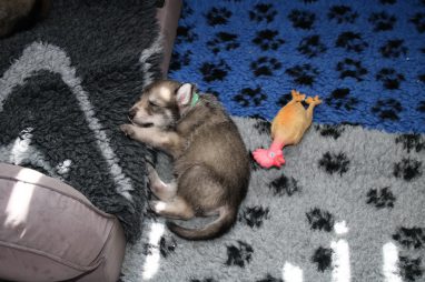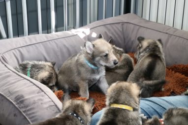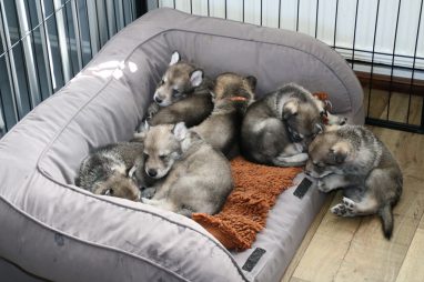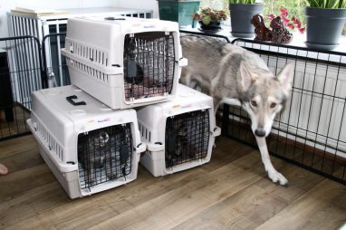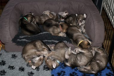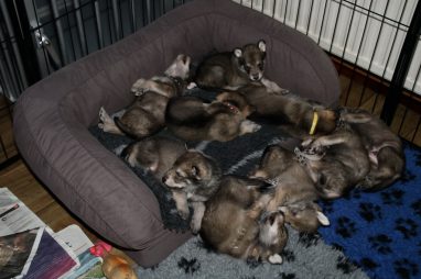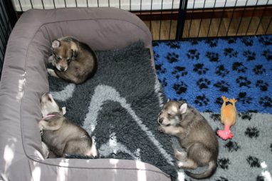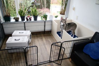 De pups zijn vrijdag verhuisd van de kraamkamer boven bij Marloes naar de woonkamer beneden. Het was even passen en meten met de meubels. maar we hebben nu een mooie puppy ren. Met drie benches hebben we de pups verplaatst. De pups vonden dat allemaal prima, maar Jaggu vond het allemaal maar vreemd. Pas toen alle pups weer in de werpkist lagen was ze weer tevreden.