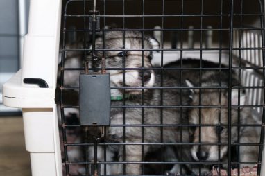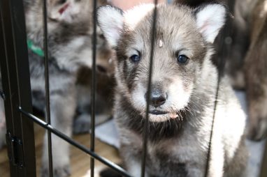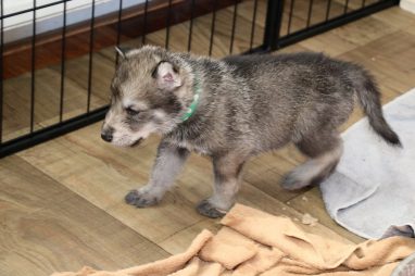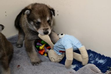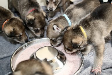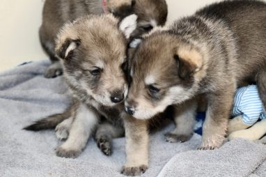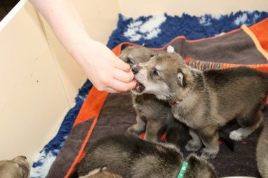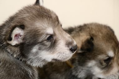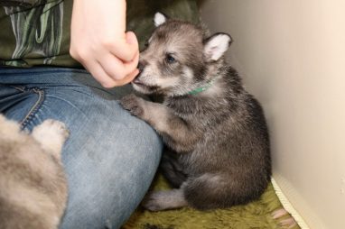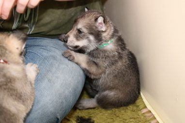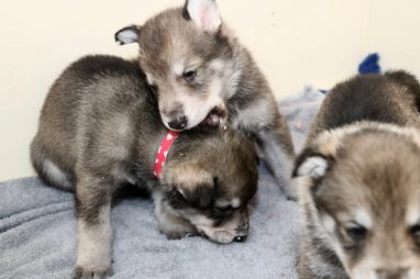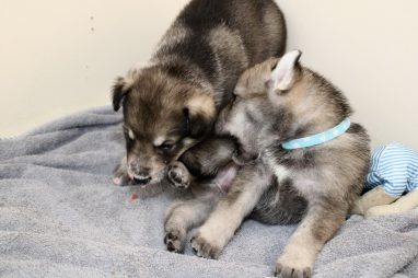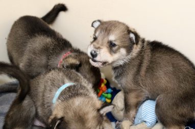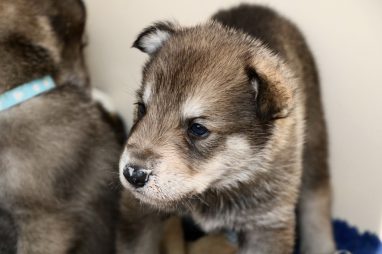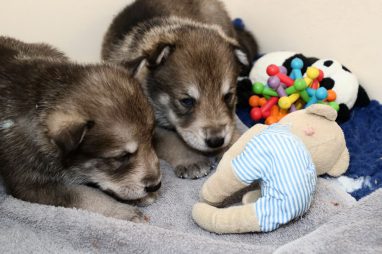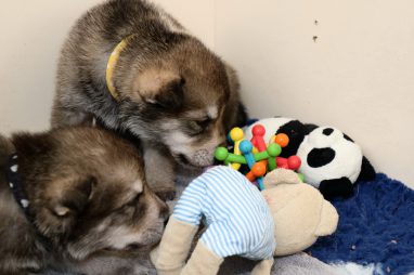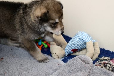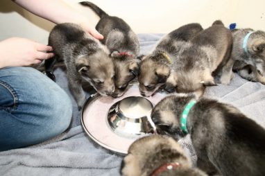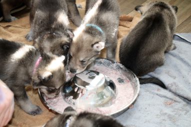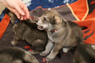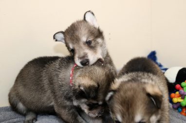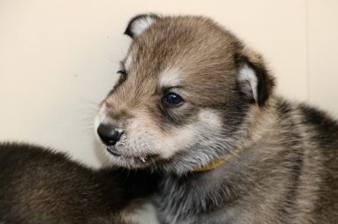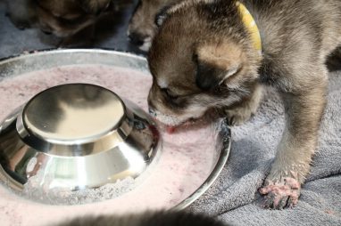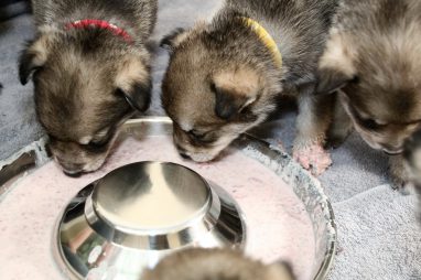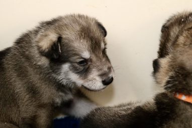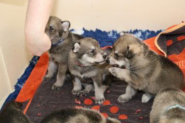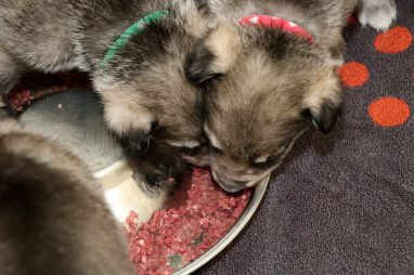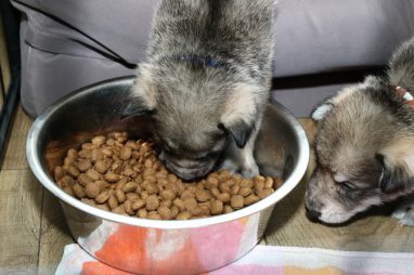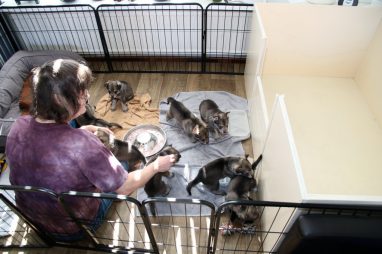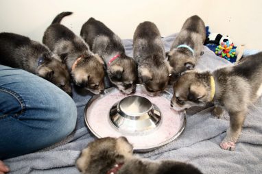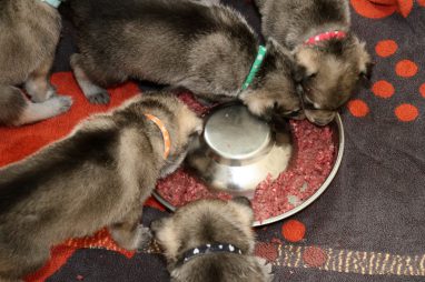 De pups zijn vrijdag verhuisd van de kraamkamer boven bij Marloes naar de woonkamer beneden. Het was even passen en meten met de meubels. maar we hebben nu een mooie puppy ren. Met drie benches hebben we de pups verplaatst. De pups vonden dat allemaal prima, maar Jaggu vond het allemaal maar vreemd. Pas toen alle pups weer in de werpkist lagen was ze weer tevreden.