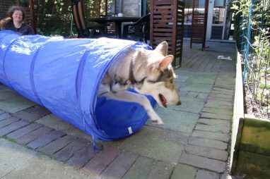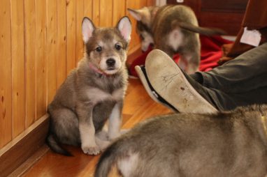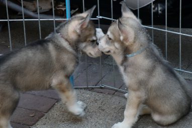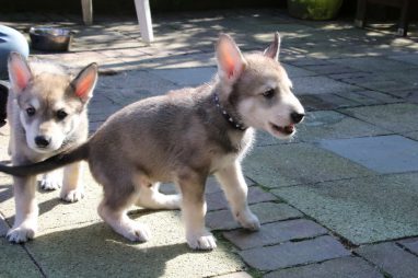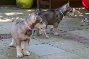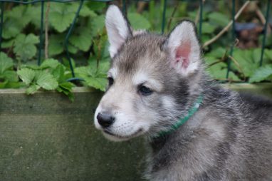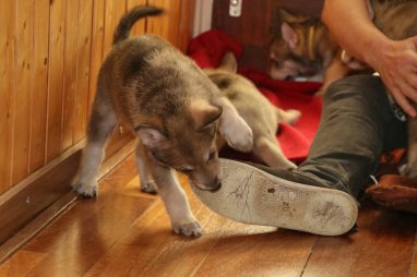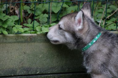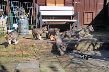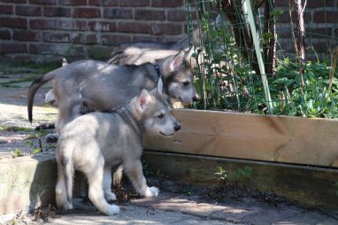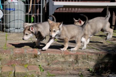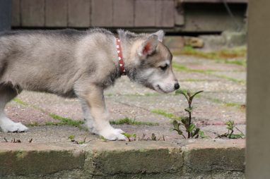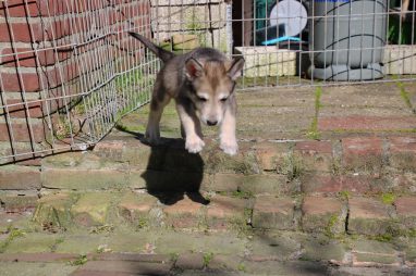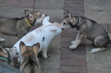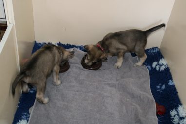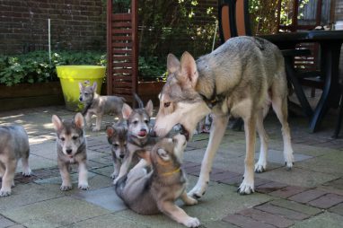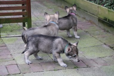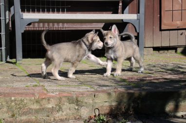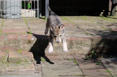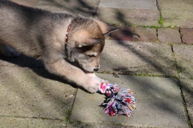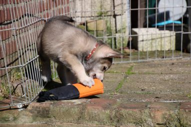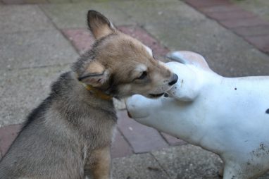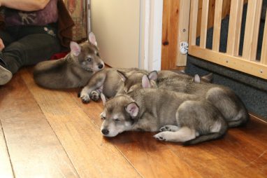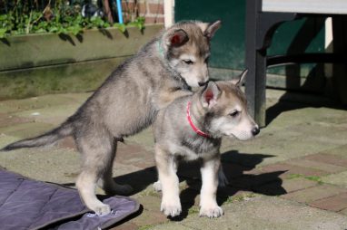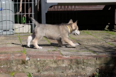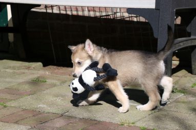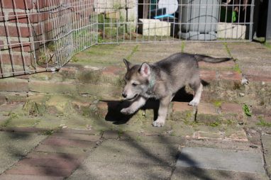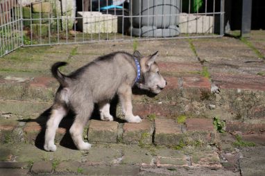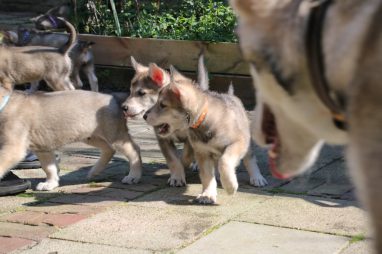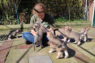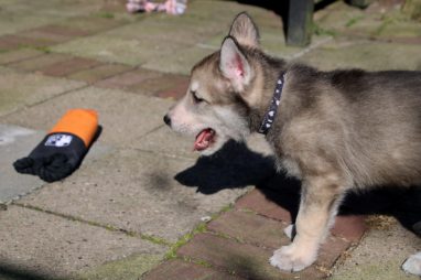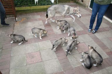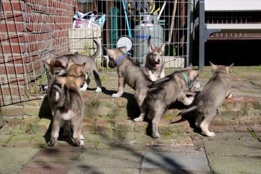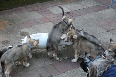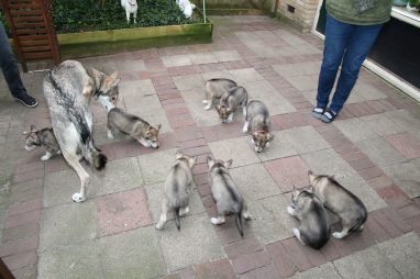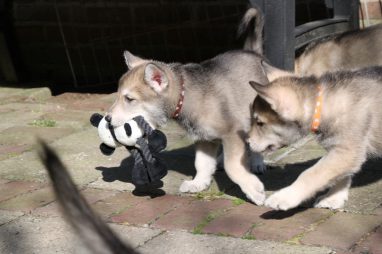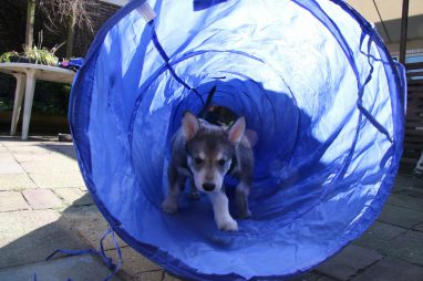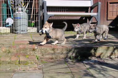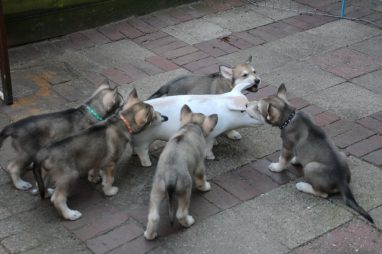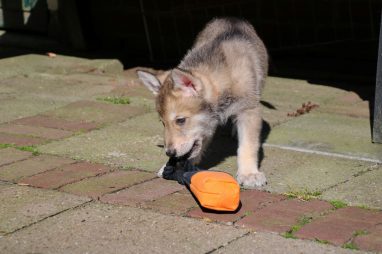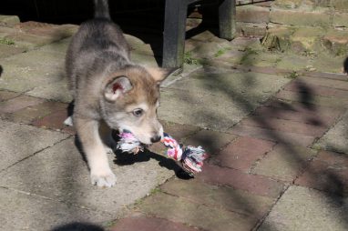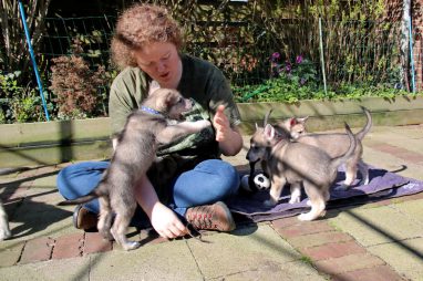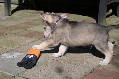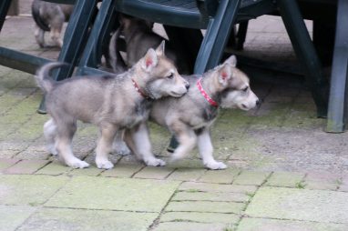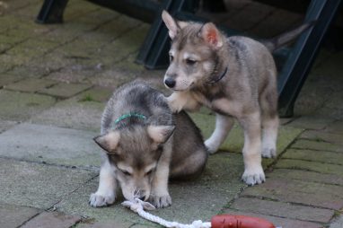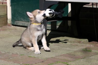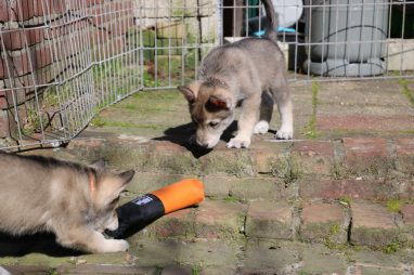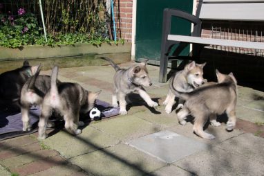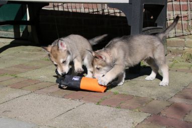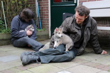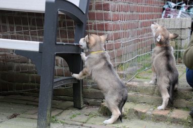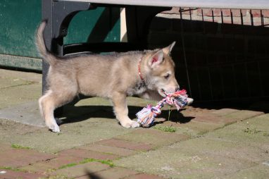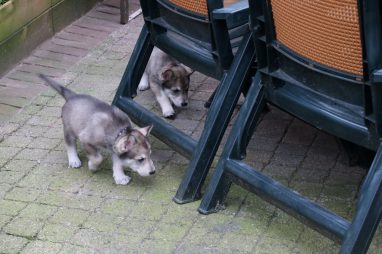 De wereld van de pups is weer iets groter geworden; ze zijn de gang in geweest. Dat vonden ze wel wat, Ans aan de ene kant en Marc aan de andere kant. En dan lekker heen en weer. Natuurlijk moest alles even verkend worden en als echte hond doe je dat met je bek. Dus overal even in bijten. Gelukkig doen ze dat heel zachtjes, er gaat niets stuk. Na een kwartiertje waren ze moe en vielen ter plekke in slaap. Tijd om naar huis te gaan.