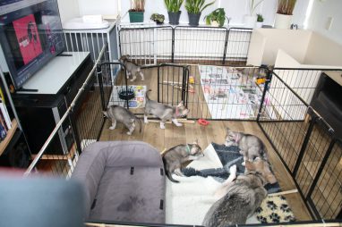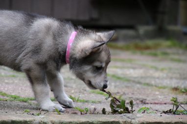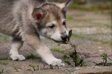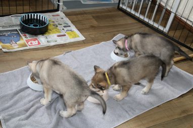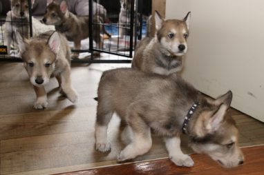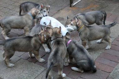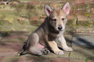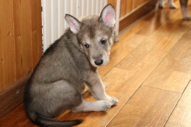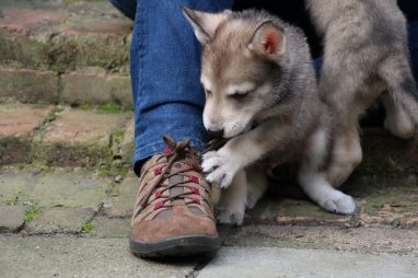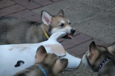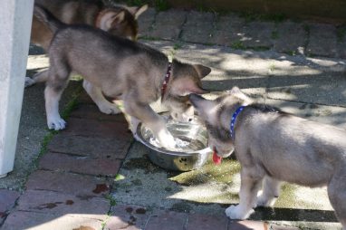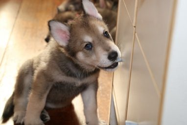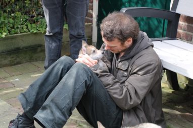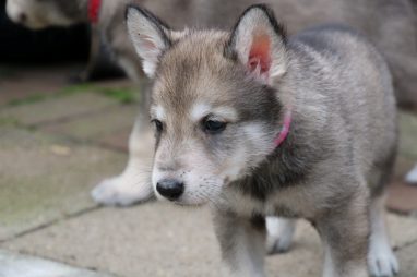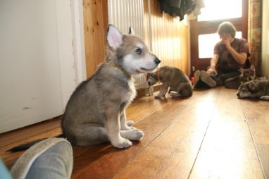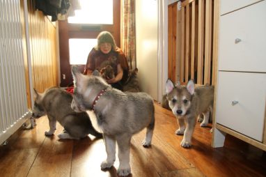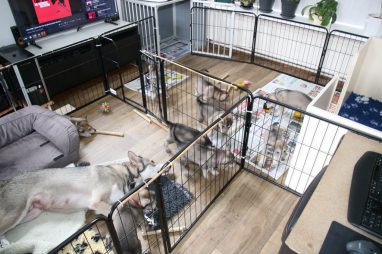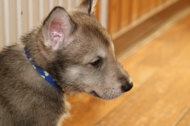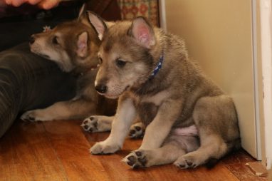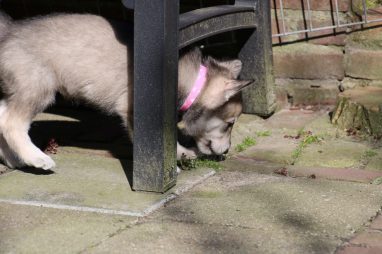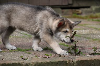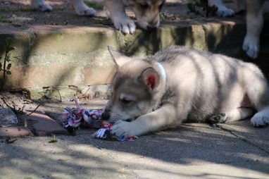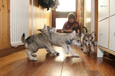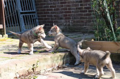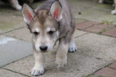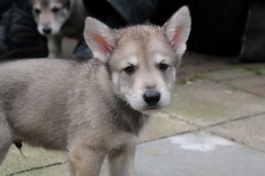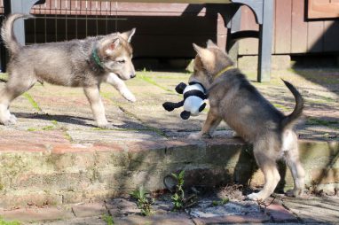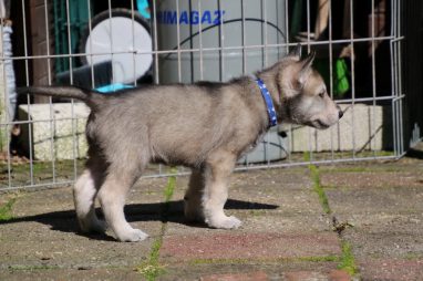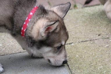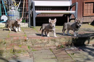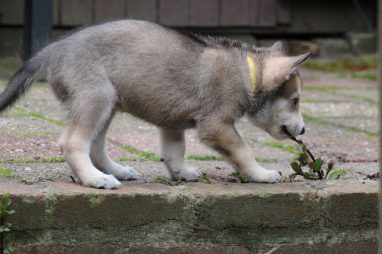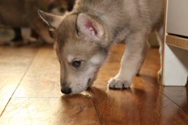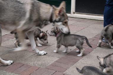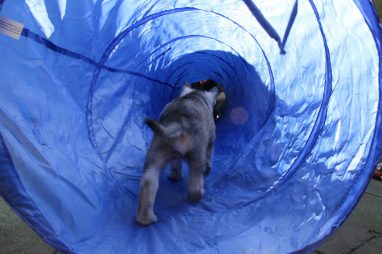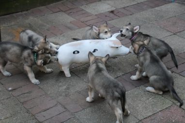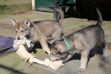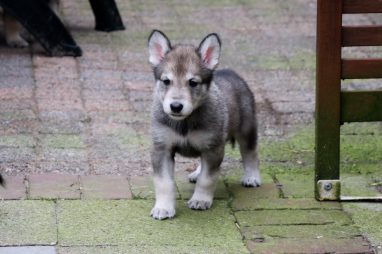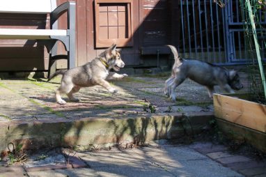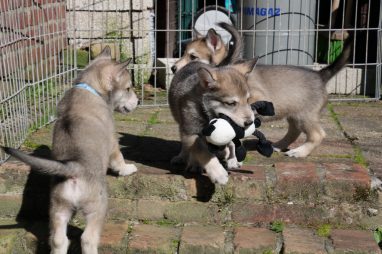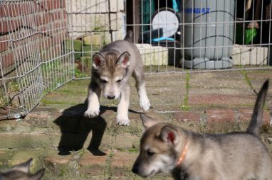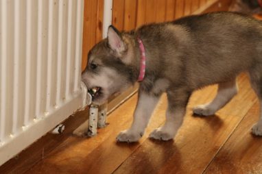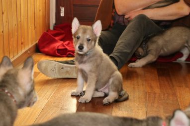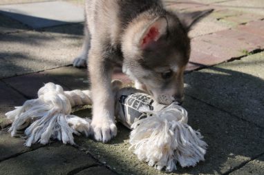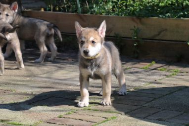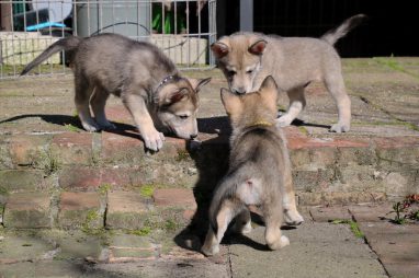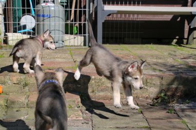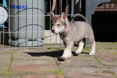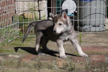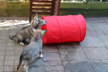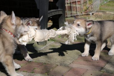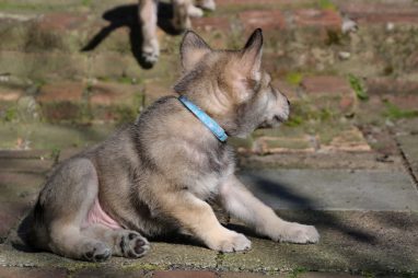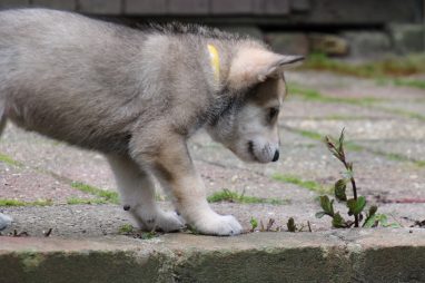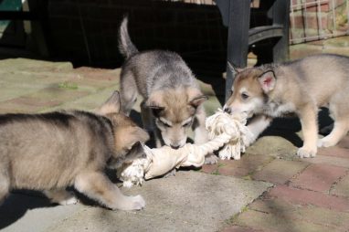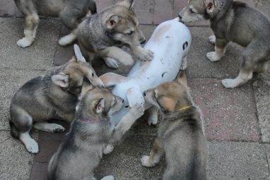 De wereld van de pups is weer iets groter geworden; ze zijn de gang in geweest. Dat vonden ze wel wat, Ans aan de ene kant en Marc aan de andere kant. En dan lekker heen en weer. Natuurlijk moest alles even verkend worden en als echte hond doe je dat met je bek. Dus overal even in bijten. Gelukkig doen ze dat heel zachtjes, er gaat niets stuk. Na een kwartiertje waren ze moe en vielen ter plekke in slaap. Tijd om naar huis te gaan.
