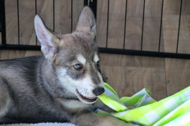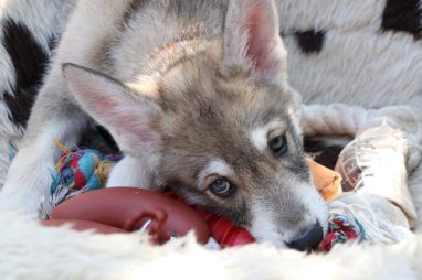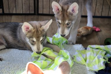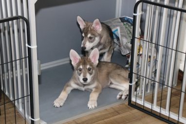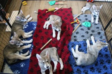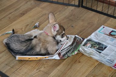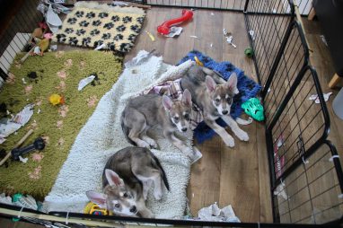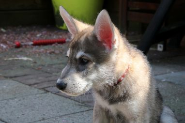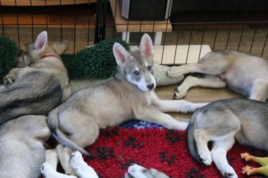 Donderdag, op de leeftijd van acht weken, zijn de eerste drie puppy’s naar hun nieuwe baasjes gegaan. Gelijk was het een heel stuk rustiger in huis. De overgebleven pups speelden vrolijk door, alsof er niets aan de hand was. Maar ze waren wel heel erg moe en sliepen langer dan normaal. Toch een beetje spanning?