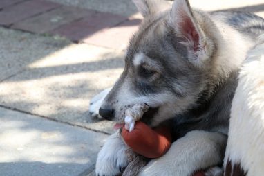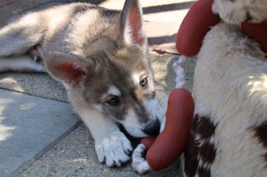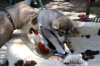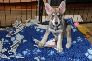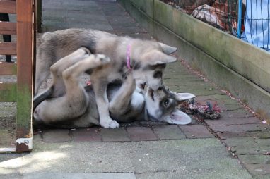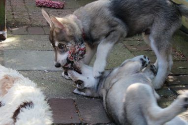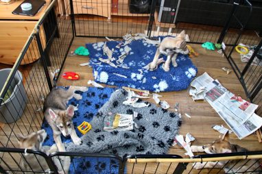 Vrijdag gingen er weer twee en was het nog rustiger. Maar het was ongelofelijk wat die paar pups nog een rommel konden maken. Ze moesten zich echt afreageren! Zaterdag vertrokken er weer drie.