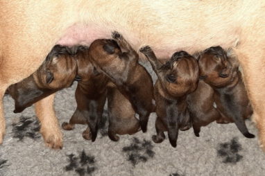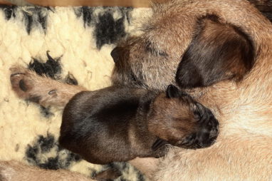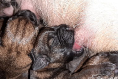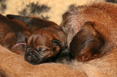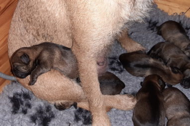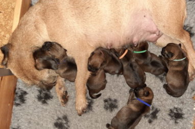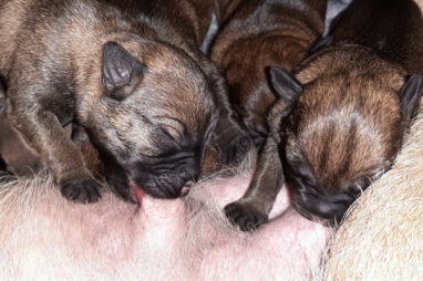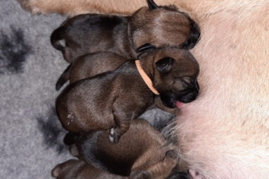 Het is alweer een week geleden dat het Q-nest geboren is. Zoals op de foto’s te zien is gaat het goed met moeder Jane en haar kroost. De eerste dagen waren er wel wat problemen met de voeding. De pups groeiden niet zo goed als wij wilden. Om de pups wat aan te sterken hebben we ze een aantal dagen bijgevoerd. Dankzij de goede zorgen van Marloes, met ondersteuning van Ans, zit de groei er nu weer in. Jane is nu beter ingesteld op het geven van voldoende melk aan zeven pups. De pups zijn heel tevreden en je hoort ze dan ook niet klagen.