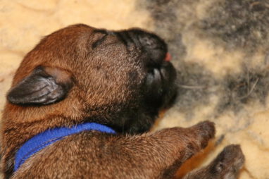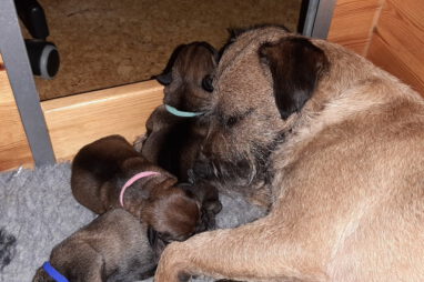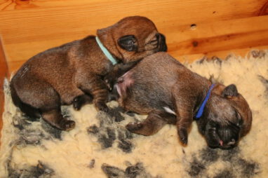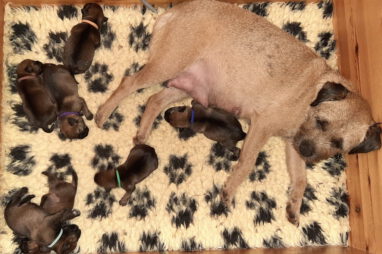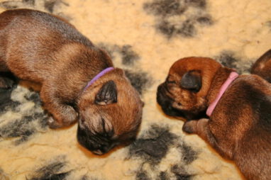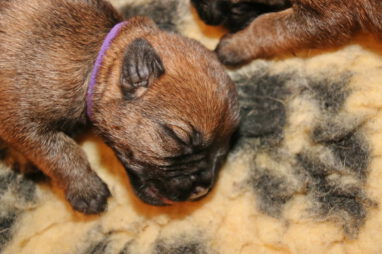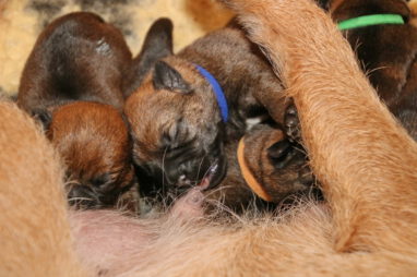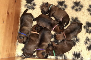 Meestal kunnen we de pups goed uit elkaar houden, maar dit zijn er zeven en ze lijken ook erg op elkaar. Daarom hebben we ze deze keer van gekleurde bandjes voorzien. Bruin, lichtblauw, donkerblauw en groen zijn de reutjes, rose, paars en oranje zijn de teefjes. We hebben ook zeven mooie Q-namen voor de pups, maar die moeten we nog verdelen.