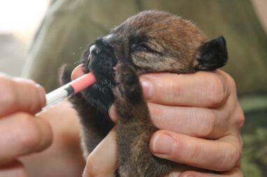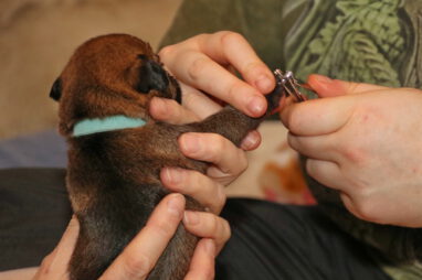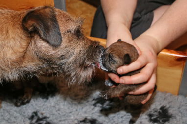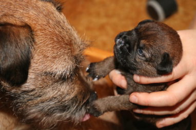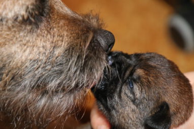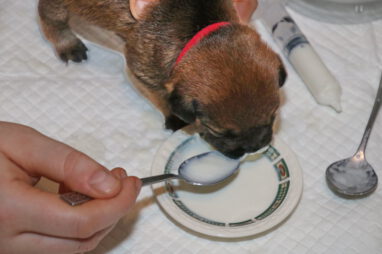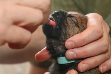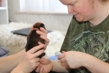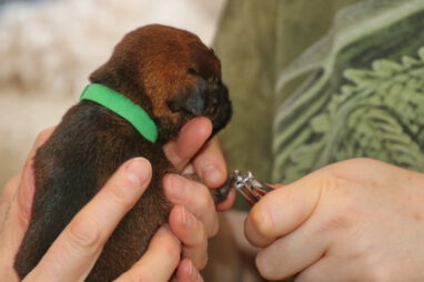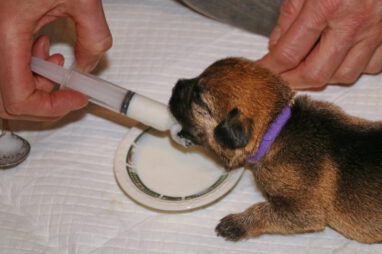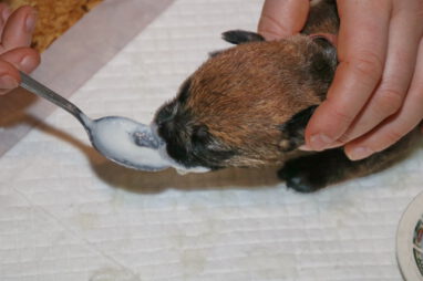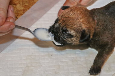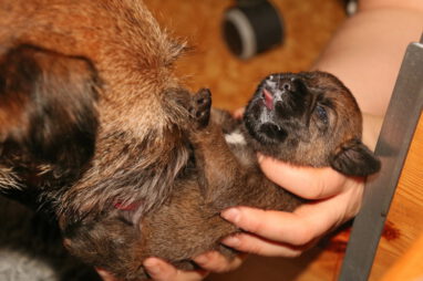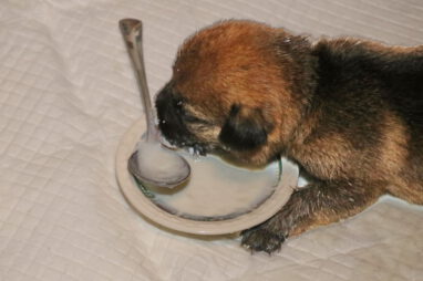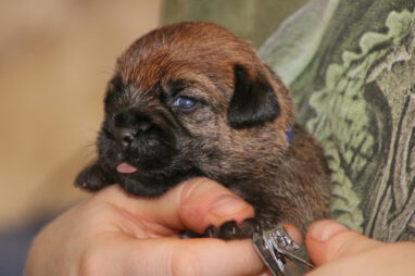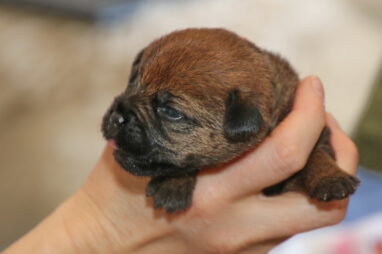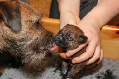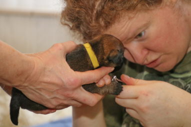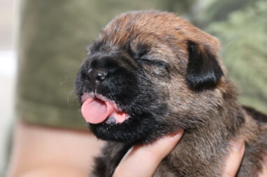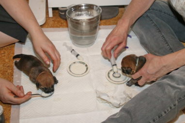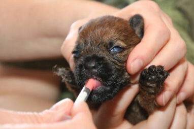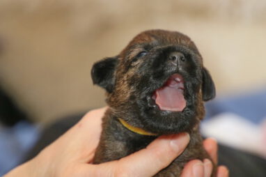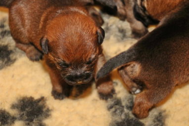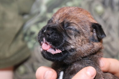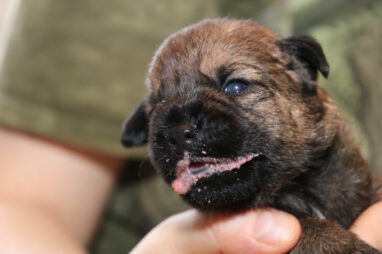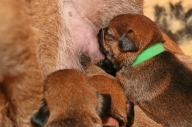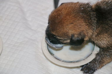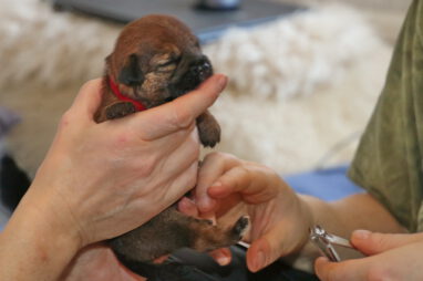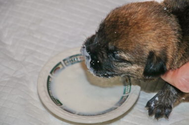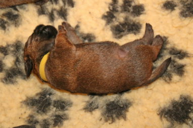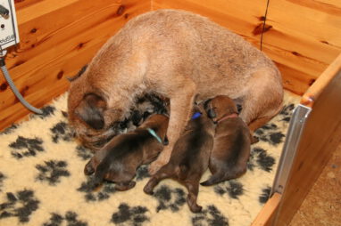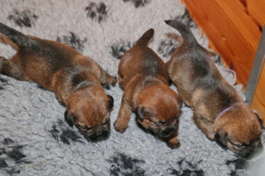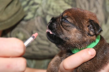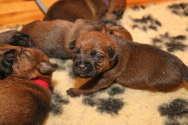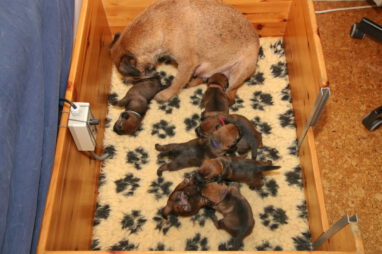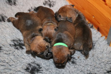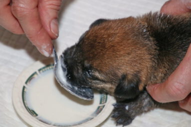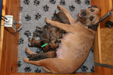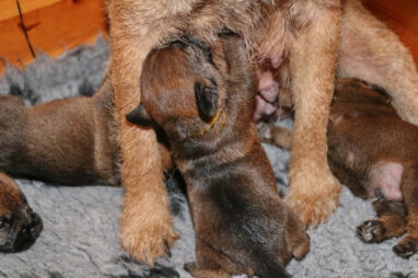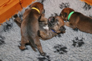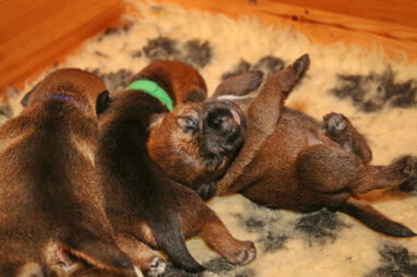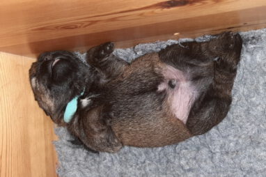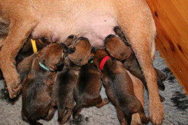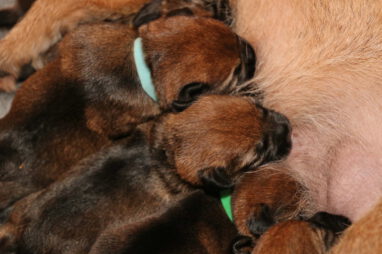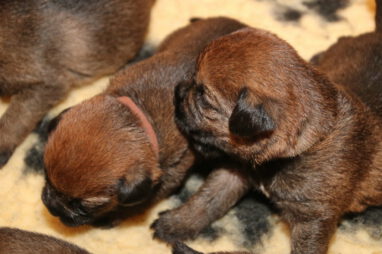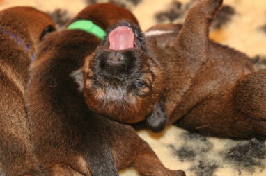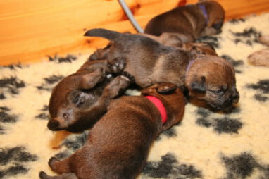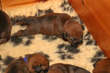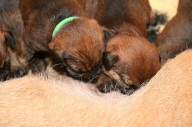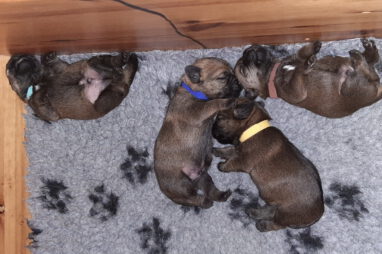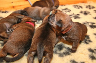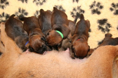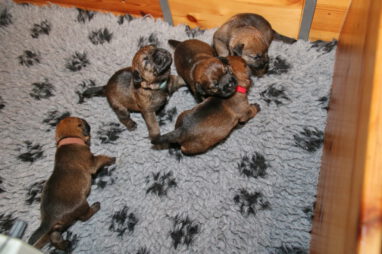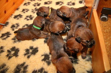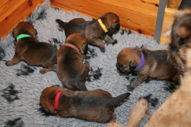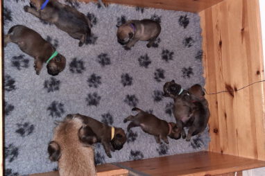 Ook de tweede week bestaat voor het grootste gedeelte uit eten en slapen. De groei zit er bij de pups nu steeds beter in. Jane heeft wel moeite om alle zeven pups van voldoende melk te voorzien. Daarom voeren we nog steeds een beetje bij en dat gaat gelukkig heel erg goed. Je hoort dan ook geen een pup klagen. En na het eten kunnen zo heerlijk relaxed gaan liggen slapen.