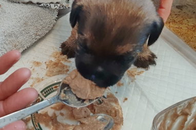We zijn nu overgestapt op mousse. Eerst van een lepeltje, maar ze wilden veel liever zelf van een schaaltje en nu ook al uit een bakje eten. dan kan je lekker zelf knoeien. Gelukkig vinden ze het allemaal erg lekker en ze groeien nu ook allemaal als kool. Natuurlijk worden ze elke avond gewogen om te kijken hoeveel ze groeien.
