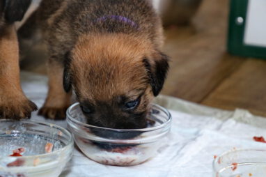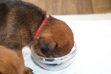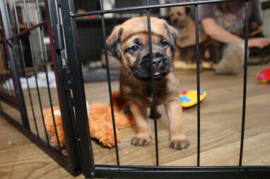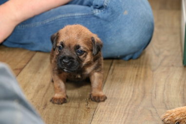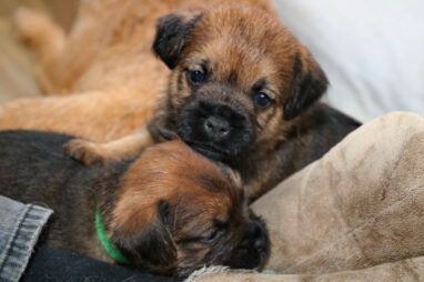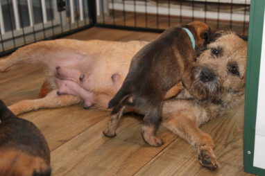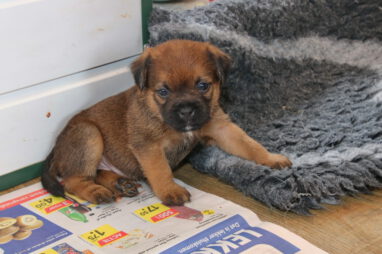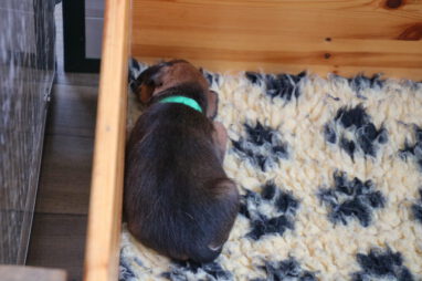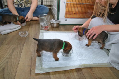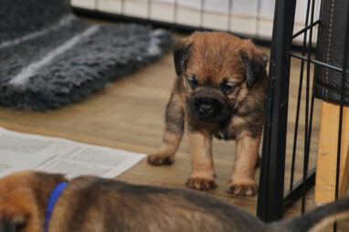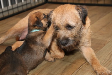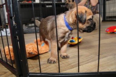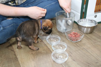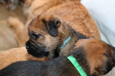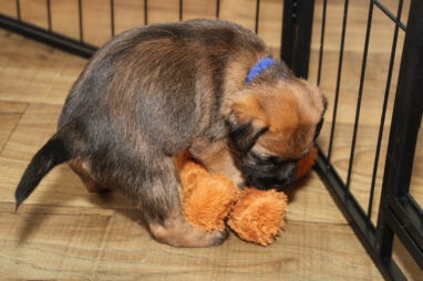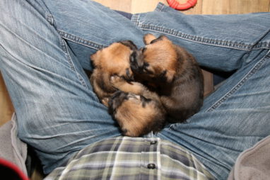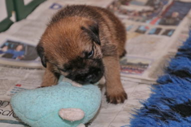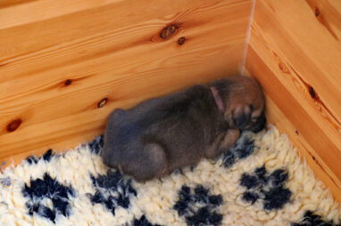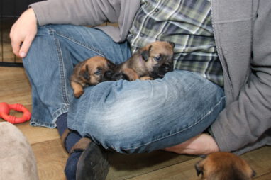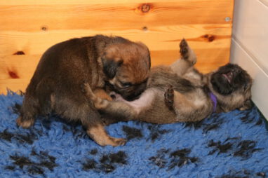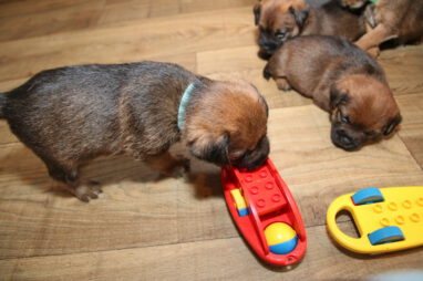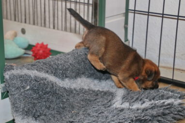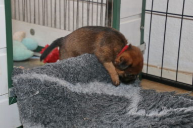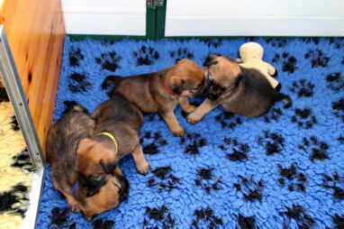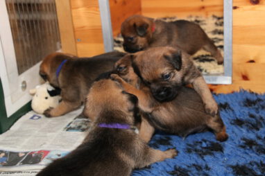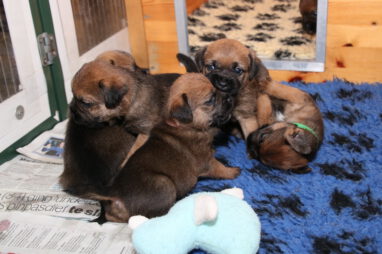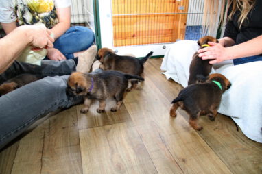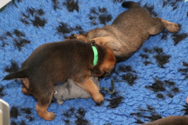 Alle zeven pups zijn lekker actief en doen allemaal prima mee. Ze kunnen heel goed met elkaar overweg en ze maken (gelukkig) nog niet veel kabaal. Af en toe eens een uitdagend blafje, daar blijft het bij. Ze zeuren niet, ze zijn allemaal heel tevreden en voldaan.