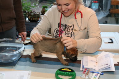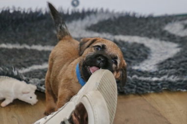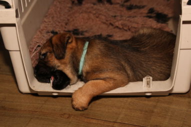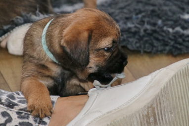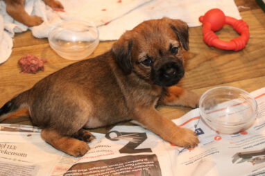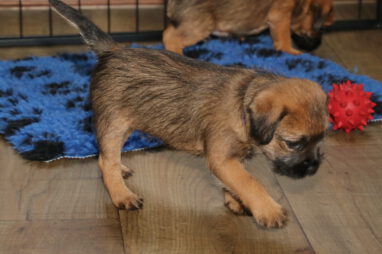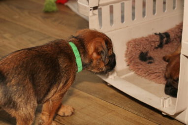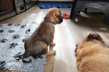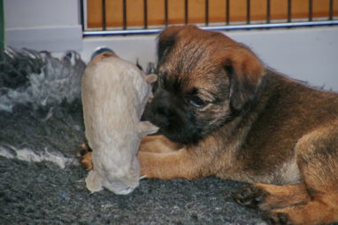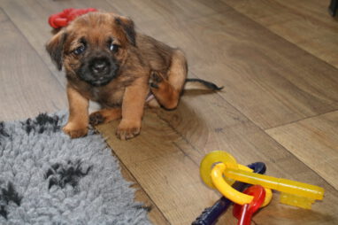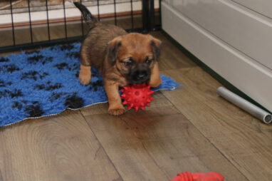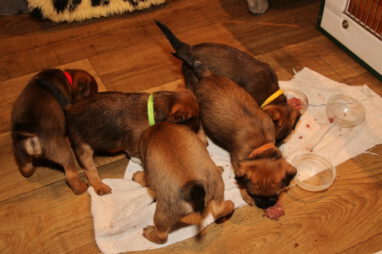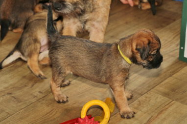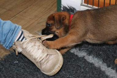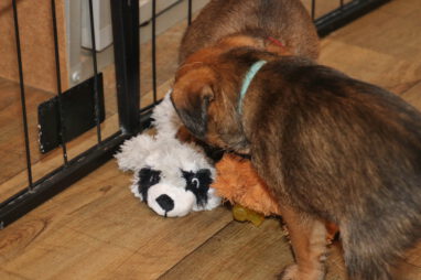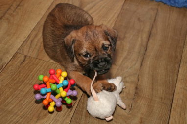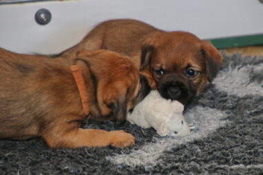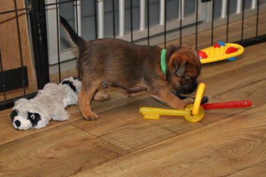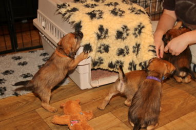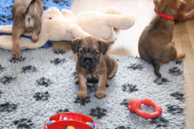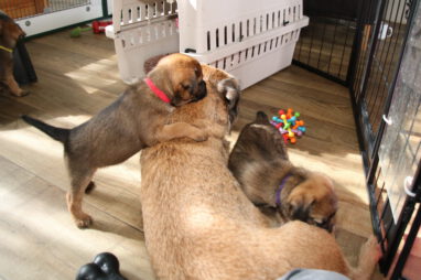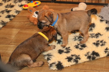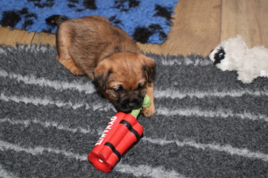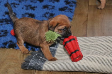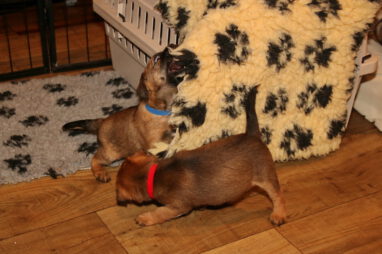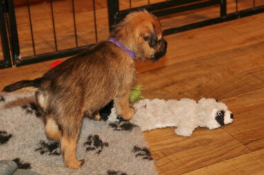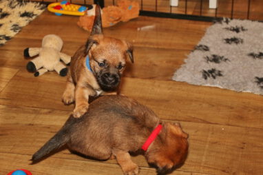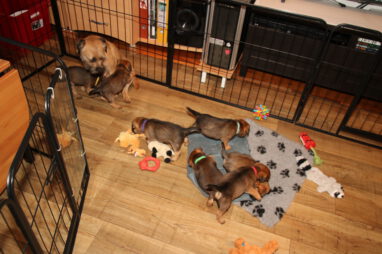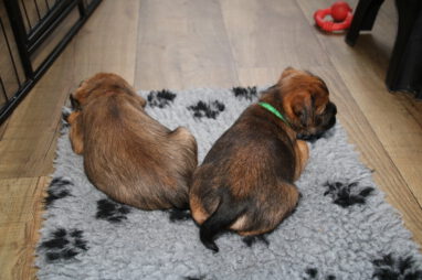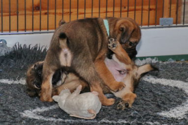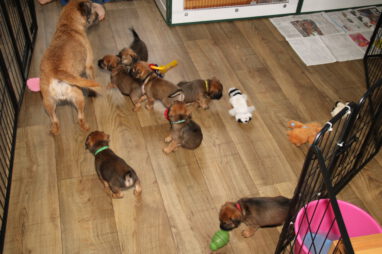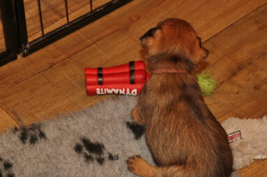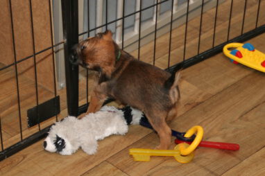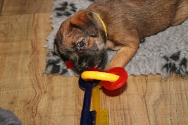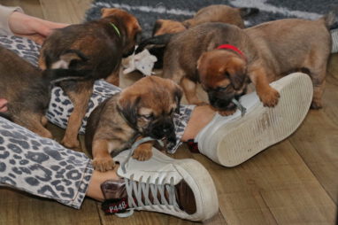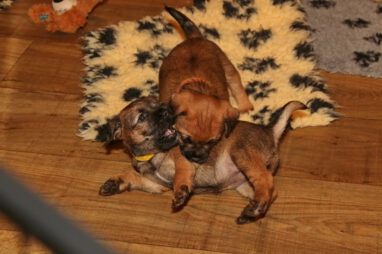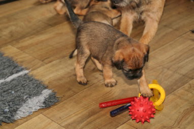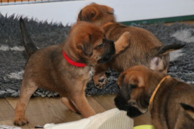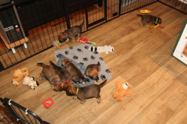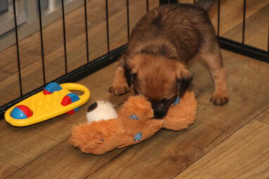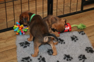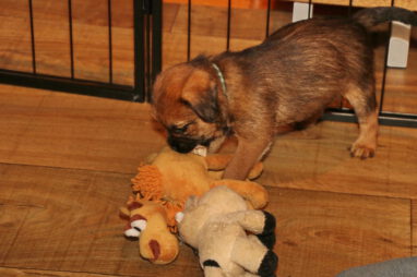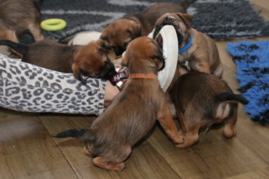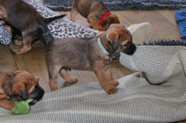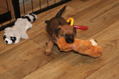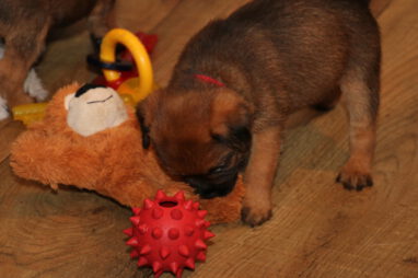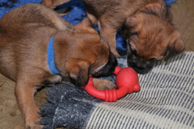De pups worden steeds actiever, ze gaan dan ook al de zesde week in. Ze vermaken zich heerlijk in de grote ren met al hun speelgoed. Soms spelen ze samen, soms spelen ze in hun eentje. Dat is heel goed, dat moeten ze alle twee leren.