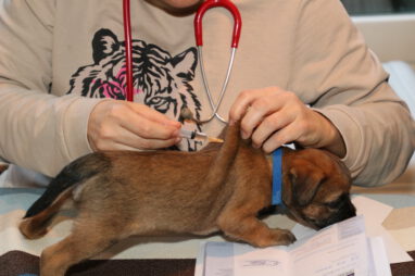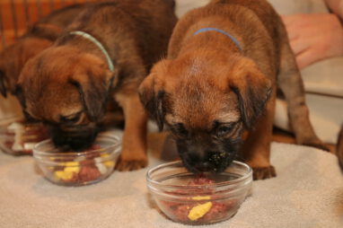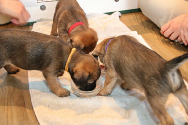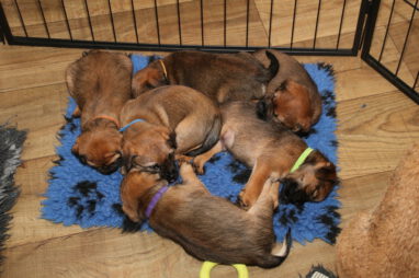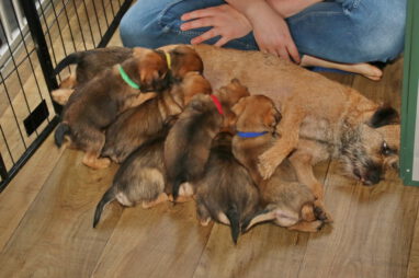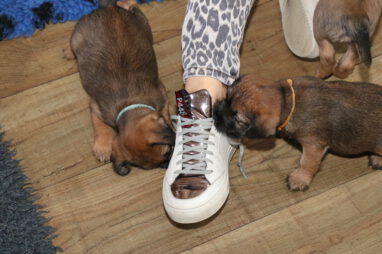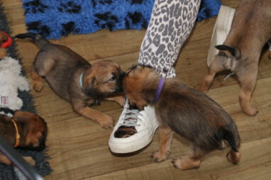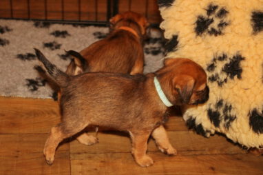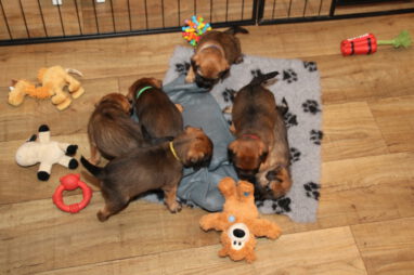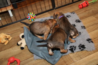 In karakter en temperament is het best een homogeen nest, ondanks dat het er zeven zijn. Er zijn geen echte baasjes of pups die wat schuchterder zijn. Ze doen allemaal lekker mee en doen beslist niet voor elkaar onder. Ze zijn ook heel lief en sociaal naar elkaar toe. Heel af en toe bijt er eentje wat te hard in de ander en hoor je een piepje, Maar dat is daarna dan ook gelijk over. Voorbeeldige pups!