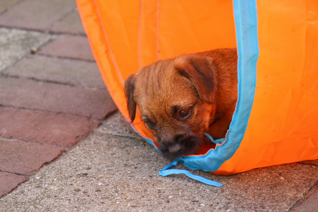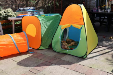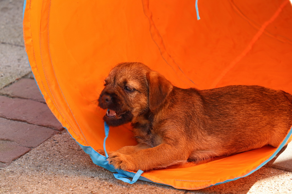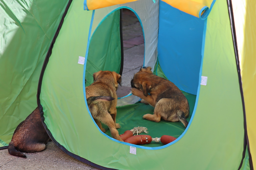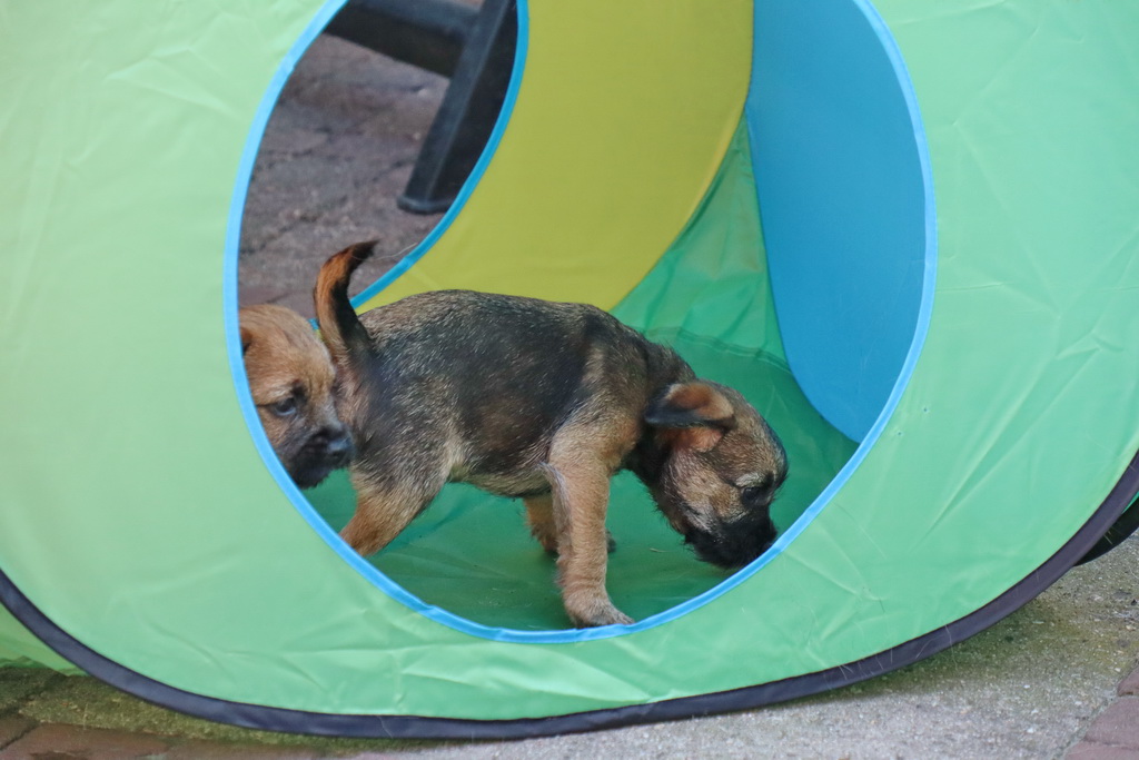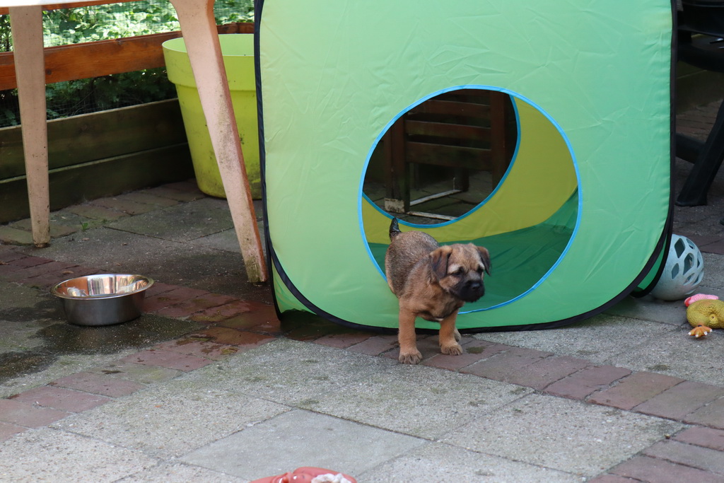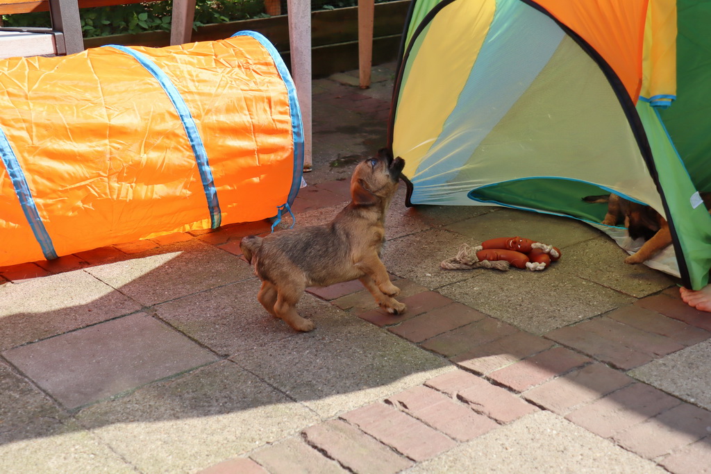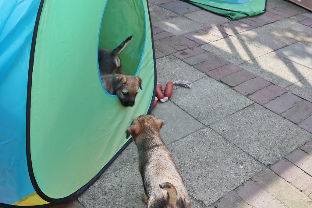 We hebben voor de pups twee tentjes met een tunnel daartussen opgezet. Dat was natuurlijk grote pret. Alles moest onderzocht worden en daarna werd de stevigheid getest. Al gauw lag de tunnel op een heel ander plaats en werd met vereende krachten een tentje ingeklapt. De pups hadden de grootste lol met z’n allen. We hopen niet dat er toekomstige eigenaren zijn die met hun Border willen gaan kamperen. We kunnen niet garanderen hoe lang hun tent dan overeind blijft staan.