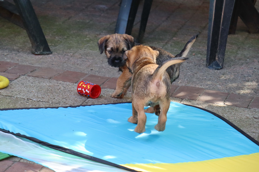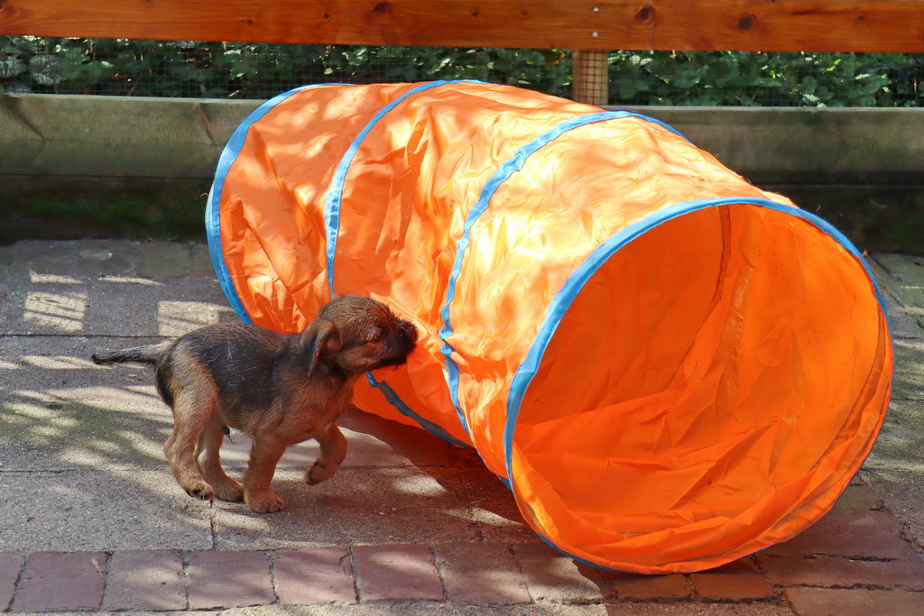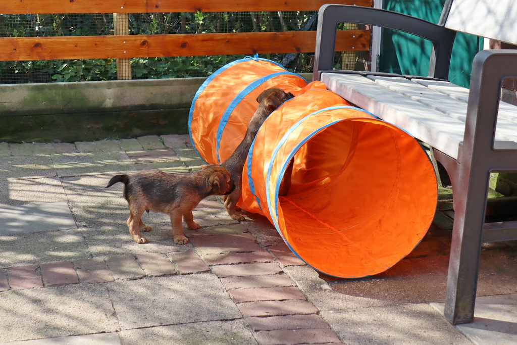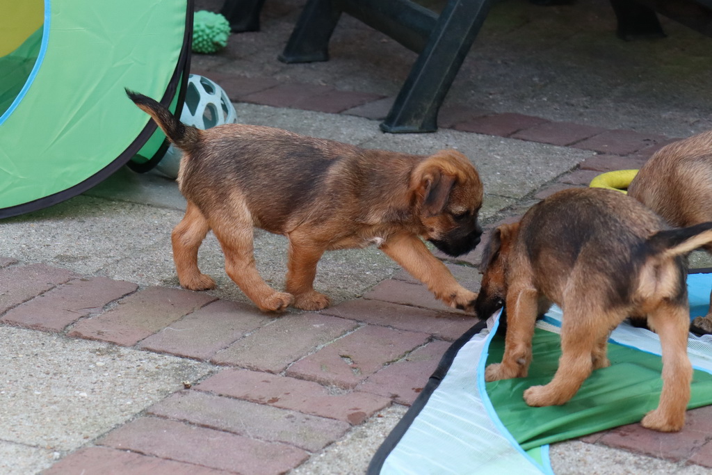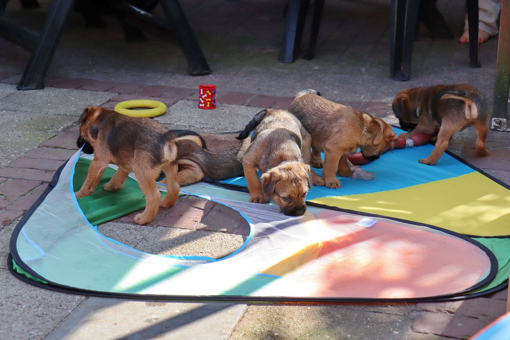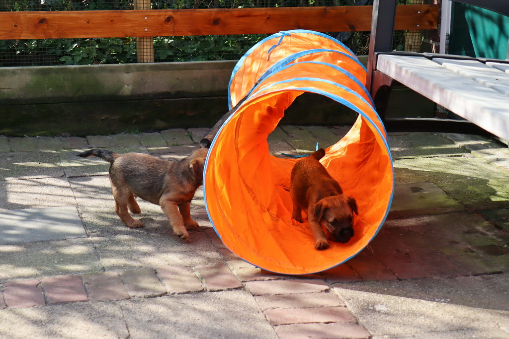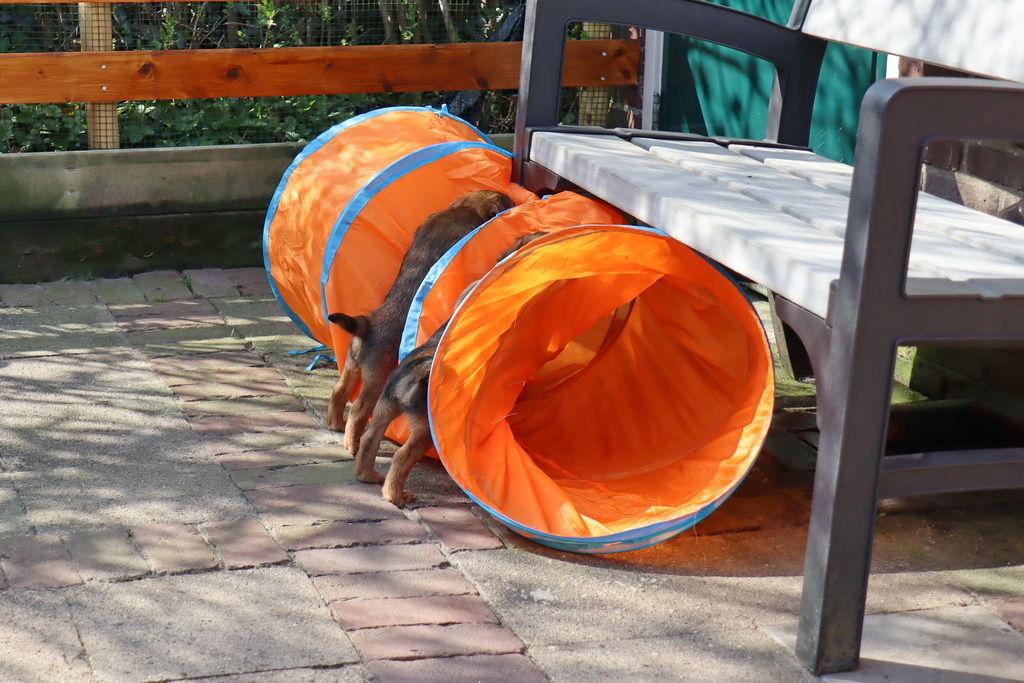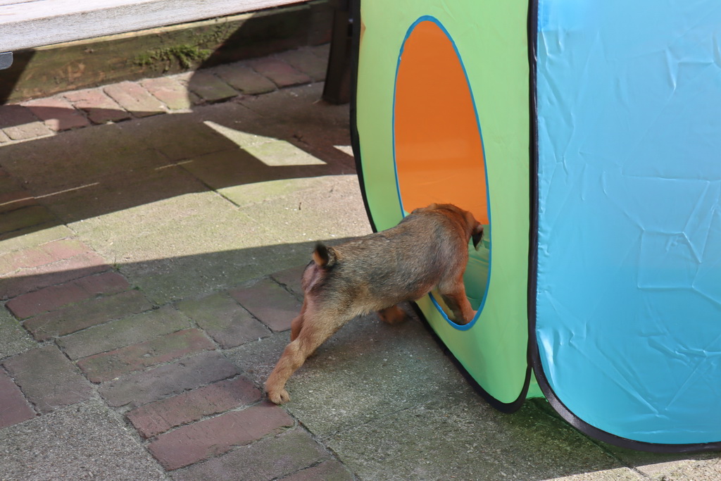 We hebben voor de pups twee tentjes met een tunnel daartussen opgezet. Dat was natuurlijk grote pret. Alles moest onderzocht worden en daarna werd de stevigheid getest. Al gauw lag de tunnel op een heel ander plaats en werd met vereende krachten een tentje ingeklapt. De pups hadden de grootste lol met z’n allen. We hopen niet dat er toekomstige eigenaren zijn die met hun Border willen gaan kamperen. We kunnen niet garanderen hoe lang hun tent dan overeind blijft staan.