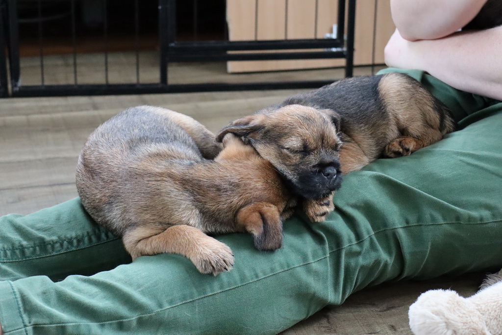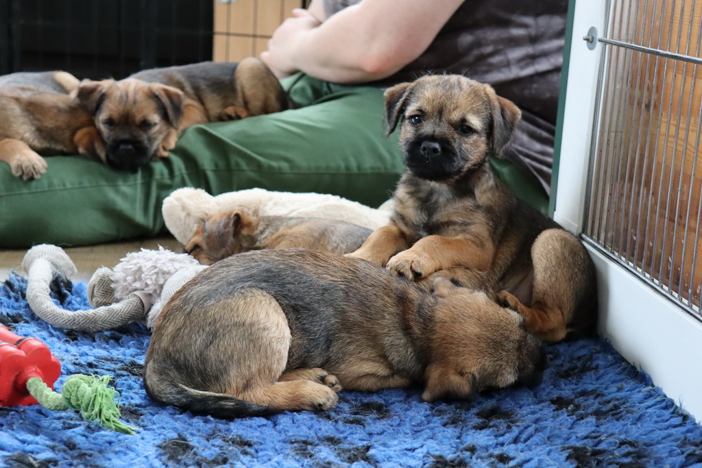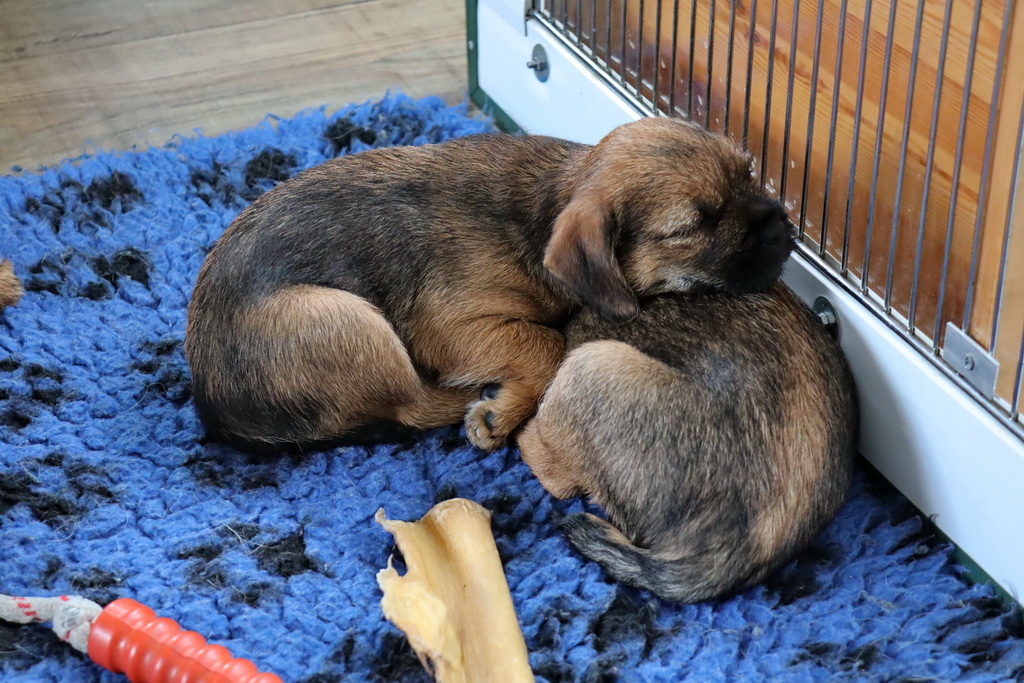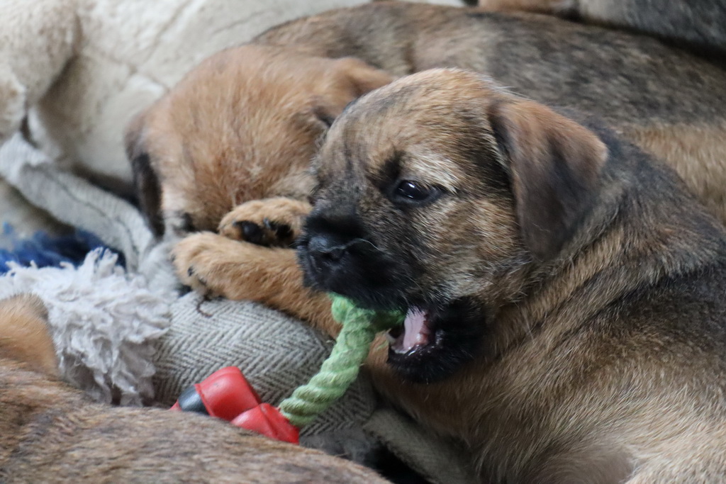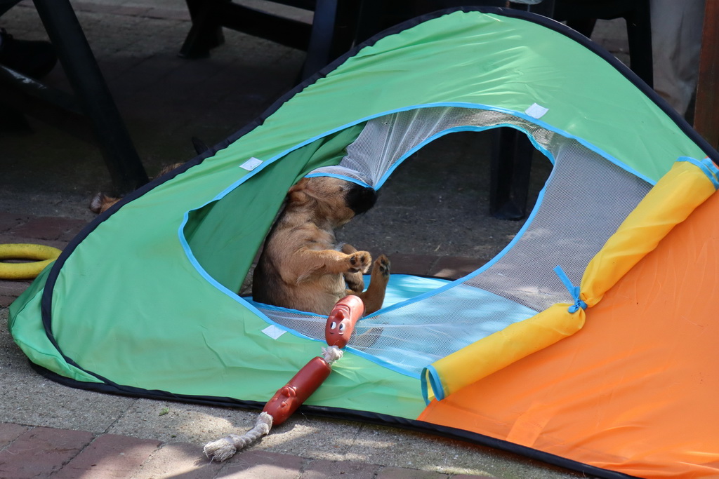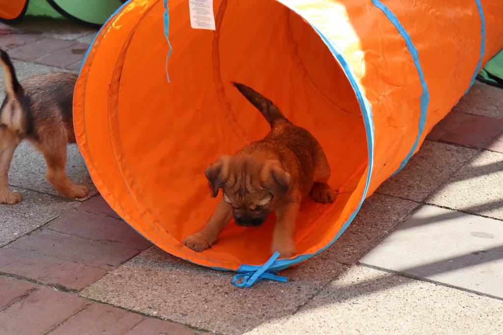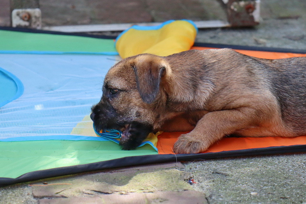 We hebben voor de pups twee tentjes met een tunnel daartussen opgezet. Dat was natuurlijk grote pret. Alles moest onderzocht worden en daarna werd de stevigheid getest. Al gauw lag de tunnel op een heel ander plaats en werd met vereende krachten een tentje ingeklapt. De pups hadden de grootste lol met z’n allen. We hopen niet dat er toekomstige eigenaren zijn die met hun Border willen gaan kamperen. We kunnen niet garanderen hoe lang hun tent dan overeind blijft staan.