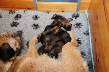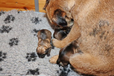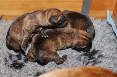 De aanloop naar de bevalling was deze keer wat langer. Gezien haar omvang en haar eerdere bevallingen hadden wij het nest rond vrijdag verwacht. Maar Jane hield ons in spanning en begon zaterdag pas met ontsluitingweeën. In de nacht naar zondag begonnen de persweeën en om 5 uur zondagmorgen kwam de eerste pup, een reu. Binnen twee uur volgden de overige zes. De geboortegewichten liggen tussen de 190 en 250 gram.