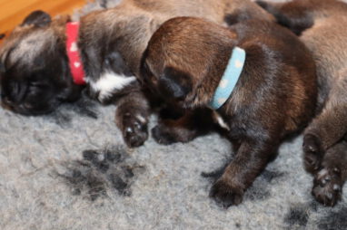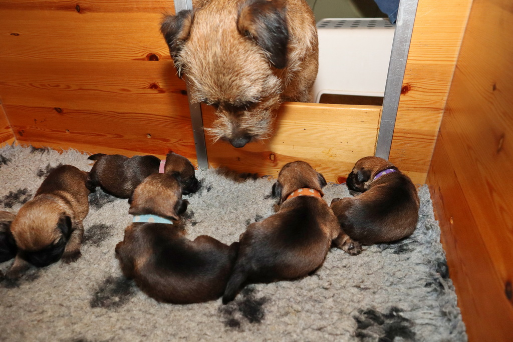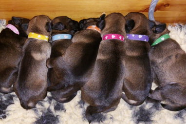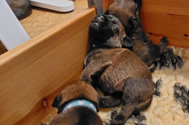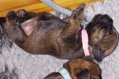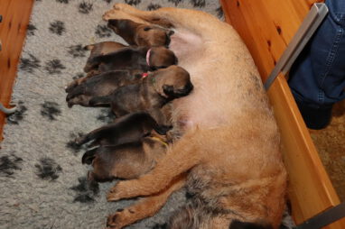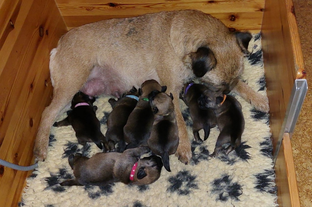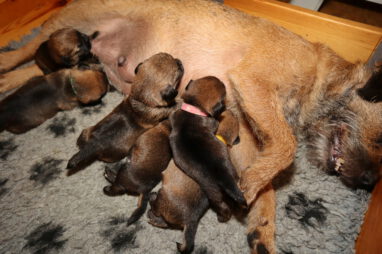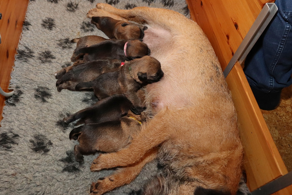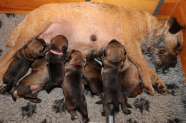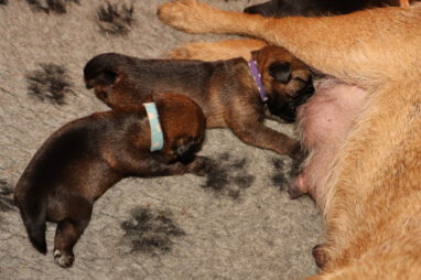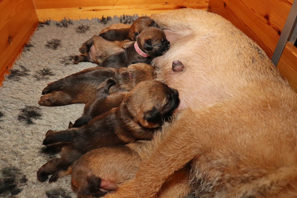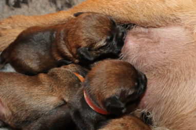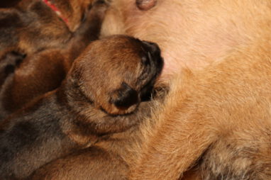 Dan moeten ze met z’n allen de melkgift op gang brengen, waarna ze lekker genieten van een gezonde maaltijd. Helemaal tevreden rollen ze dan om of vallen in slaap met de tepel nog in de bek. Jane wil nog even alle pups schoonlikken en dan valt het grut weer in een diepe slaap.