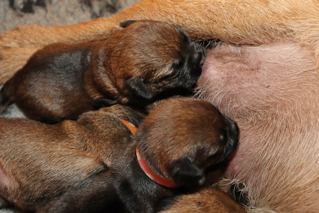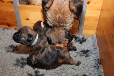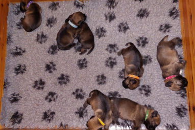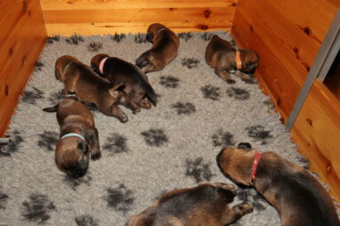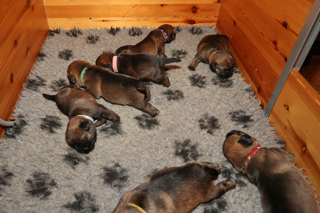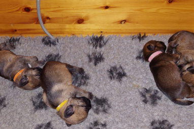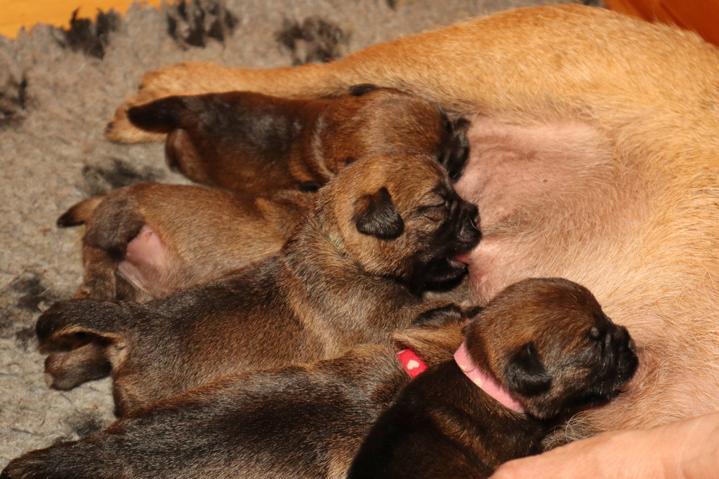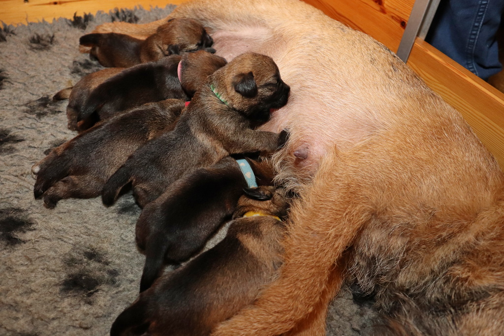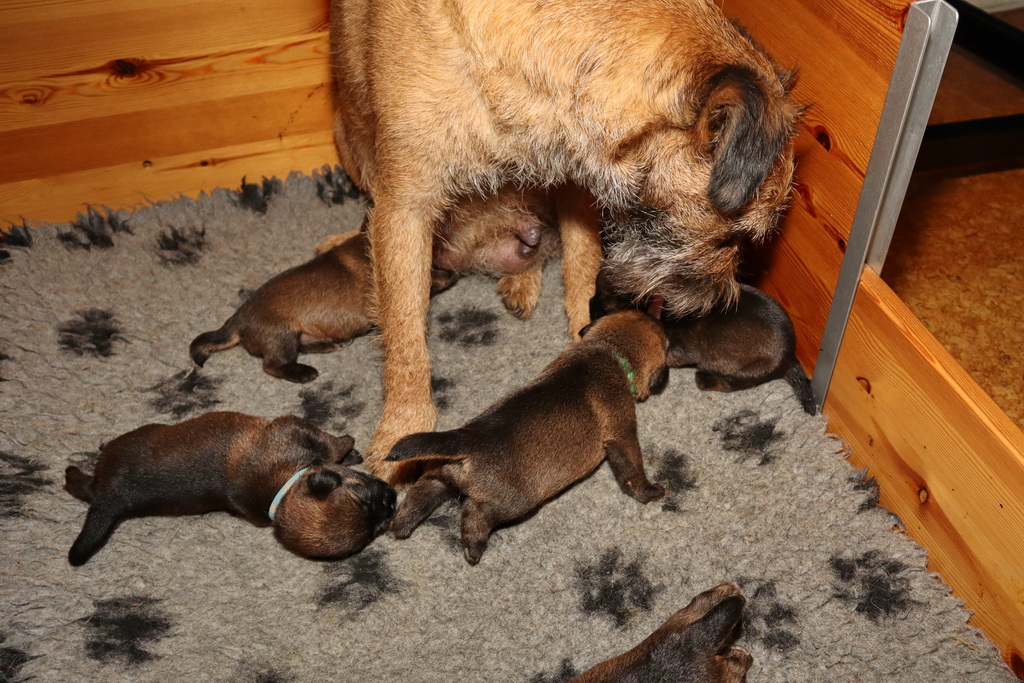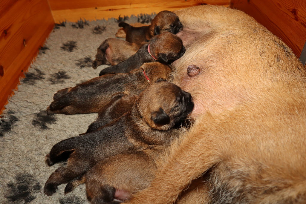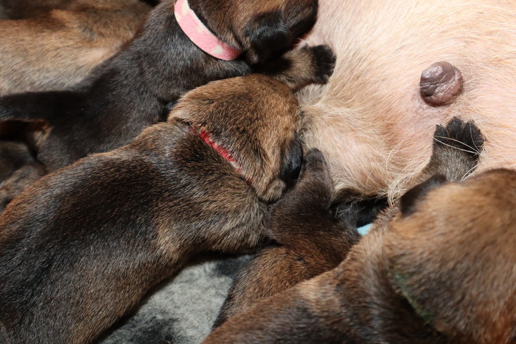 De pups drinken zo/n beetje elke twee uur bij Jane. Jane heeft gelukkig 8 goed werkende tepels, dus de pups hebben genoeg keuze. Jane komt ze vaak wakker porren, waarna de pups gelijk met z’n allen “aanvallen”. Het duurt soms even voordat ze allemaal een tepel te pakken hebben en ook nog een beetje lekker liggen. Daarbij kunnen ze de meest vreemde houdingen aannemen.