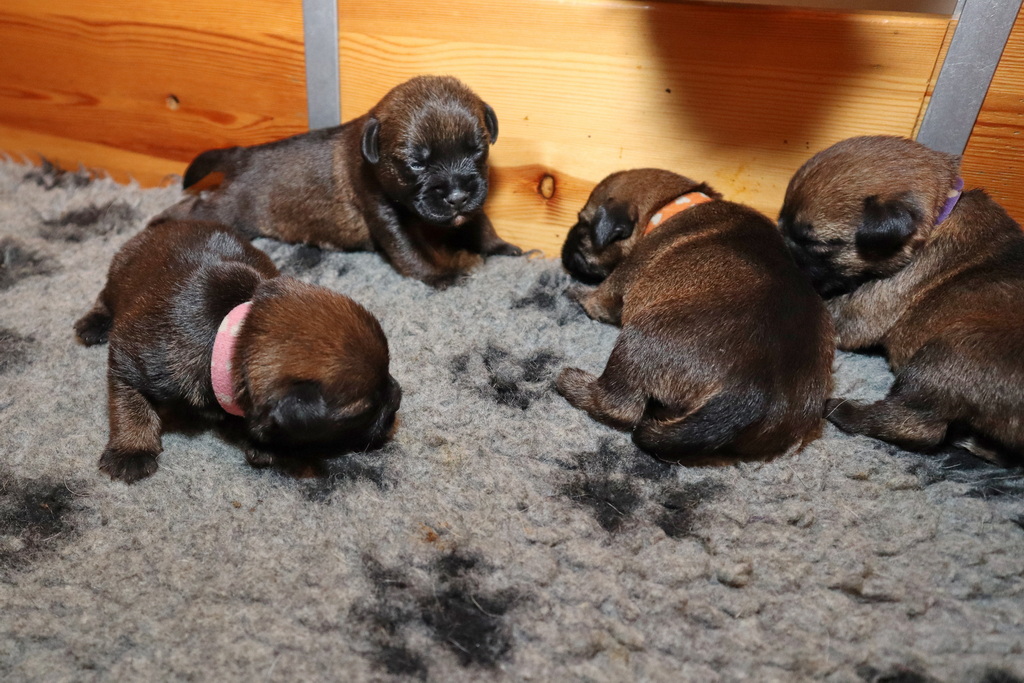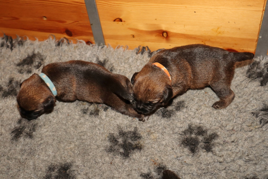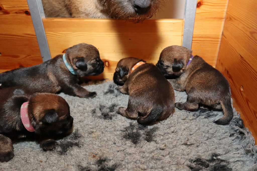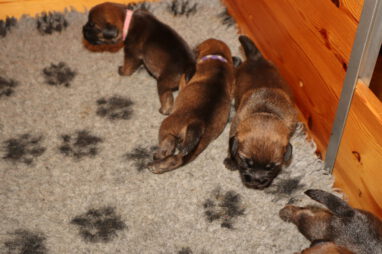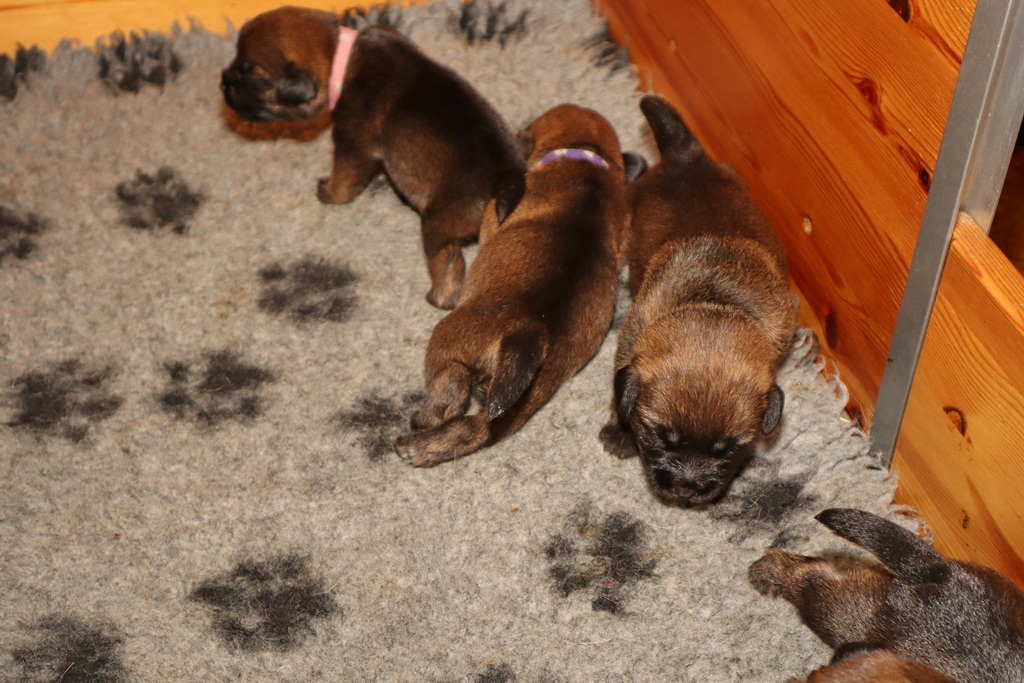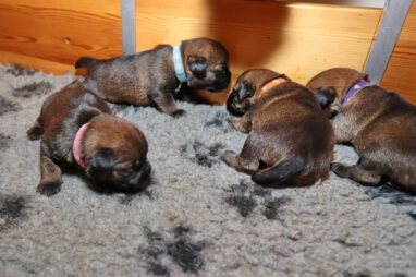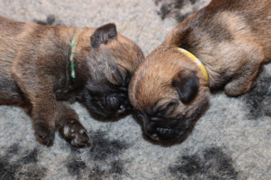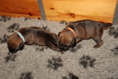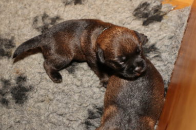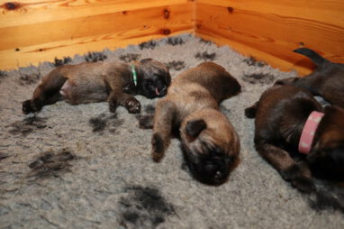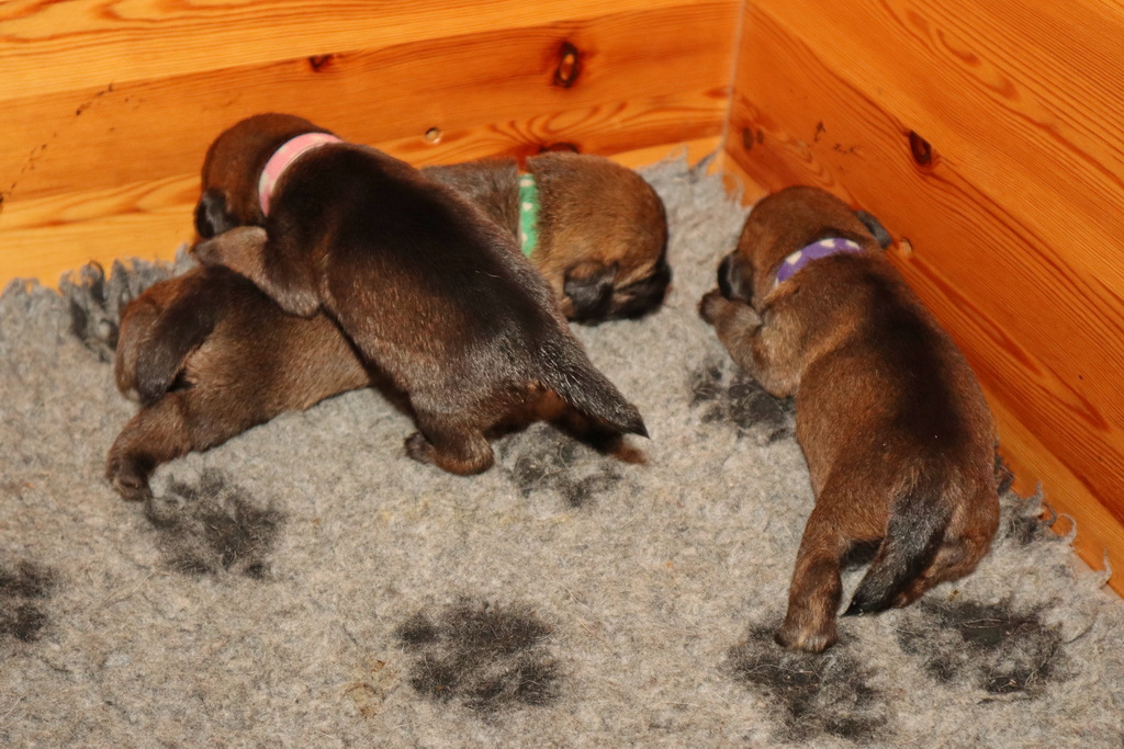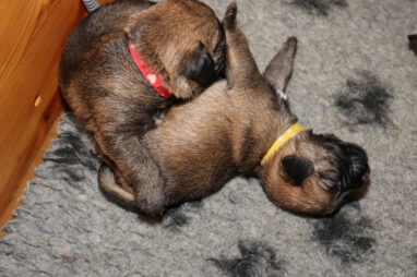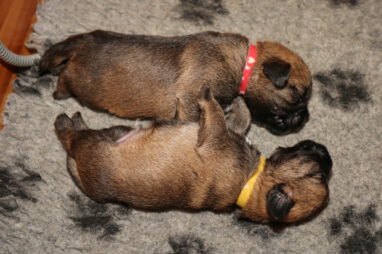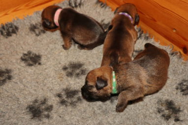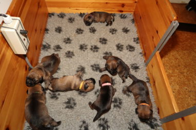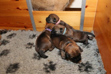 De pups drinken zo/n beetje elke twee uur bij Jane. Jane heeft gelukkig 8 goed werkende tepels, dus de pups hebben genoeg keuze. Jane komt ze vaak wakker porren, waarna de pups gelijk met z’n allen “aanvallen”. Het duurt soms even voordat ze allemaal een tepel te pakken hebben en ook nog een beetje lekker liggen. Daarbij kunnen ze de meest vreemde houdingen aannemen.